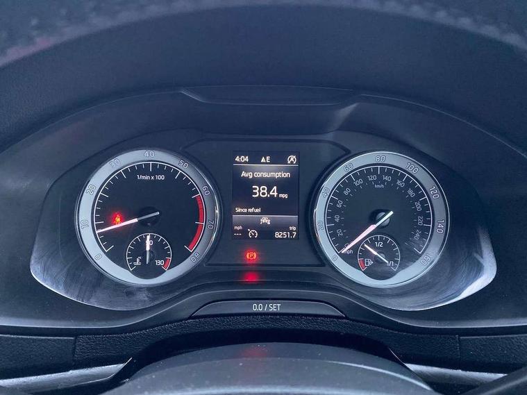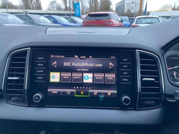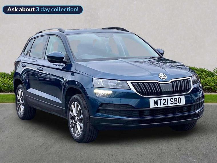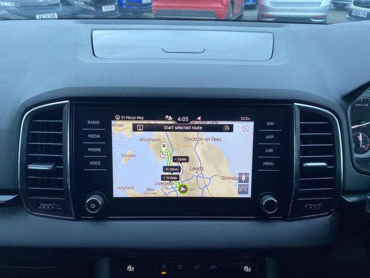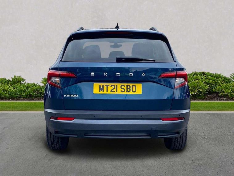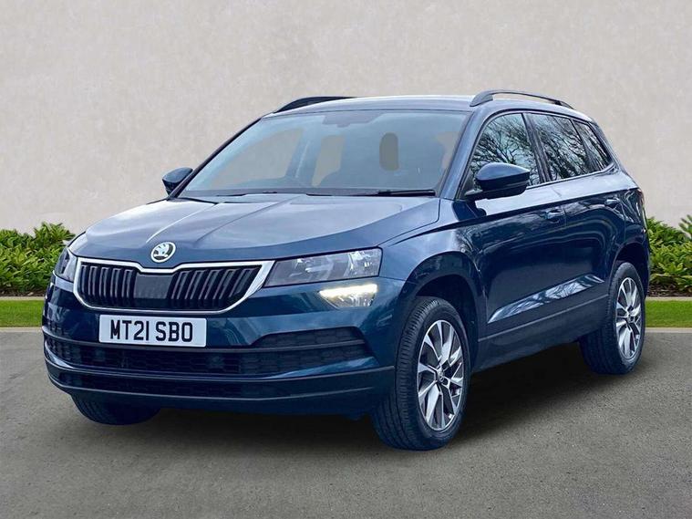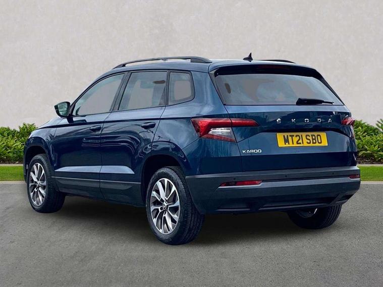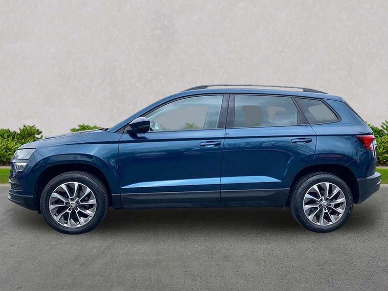 Chrome framed air vents, Storage on wheel cover, Alarm with interior monitoring, back up horn and tilt sensor with safe function, Electronic engine immobiliser, Remote central locking with 2 remote folding keys, DAB radio with Bluetooth, USB connection, Airbags - Front side, head, knee and curtain, Automatic door unlocking in case of crash, Automatic fuel cut off in case of crash, Driver airbag, Electronic parking brake with auto hold function, Emergency rear braking signal, ESC including ABS, MSR, ASR, EDS, HBA, DSR, RBS, MKB and traction control, Front assist radar scanning of the space in front of the car with automatic braking, Hill hold control, Passenger airbag with switch-off function, Pedestrian monitor, Three point seatbelts rear, Two tone horn, Tyre pressure display, Tyre pressure monitor, Acoustic glass, Aero front windscreen wipers with intermittent function, Automatic headlight control system, Black electric window control buttons, Body colour door mirrors and handles, Body coloured bumpers, Doors steps in front with Karoq badging, Electric front and rear windows with child proof lock, Electrically adjustable heated folding and auto dimming door mirrors, Heated rear windscreen, LED rear lights with high functionality, Light assistant (coming/leaving home/tunnel light), Privacy glass, Safety reflectors on front doors, Third brake light, 1.5 litre bottle holders in driver and front passenger door panels, 12V socket in boot, 12v socket in front centre armrest with storage compartment and rear air vents, 2 Folding hooks and nets in boot, 2 Front readings lights for driver and passenger, 3 rear height adjustable headrests, 4 foldable roof handles with rear coat hooks, 4 lashing points on luggage floor, Backrest release, Cargo elements in boot, Chrome inner door handles, Door sill scuff plates, Driver and passenger seats height adjust, Fabric upholstery, Folding tables on the front seat backrests, Front head restraints, Front seat and rear pockets, Height adjustable front three point seats belts with tensioners, Height/reach adjust steering wheel, Ice scraper, Illuminated and cooled glovebox, Illuminated luggage compartment, Isofix child seat preparation outer rear, Manual lumbar support for front seats, Net programme in boot, Pen holder, Pollen filter, Rear boot cover, Rear reading lights, Rear seats fixed folding and divided 60:40, Safety vest holder, Seatbelt reminder signalisation and pretensioner for all seats, Stars graphite decorative inserts, Storage box in upper central dashboard closed, Sunvisors with illuminated vanity mirrors, Textile floor mats, Umbrella under passenger seat, Amundsen satellite navigation with 8" touchscreen display with maps Europe, WLAN and web radio, Care connect, Driver fatigue sensor, Electro-mechanical PAS, Multifunction colour trip computer, Outside temperature gauge, Rear view camera, Service interval indicator, SmartLink wireless for Apple and wired for Android, Start/stop system with regenerative braking, USB C Port x 2 in front centre console,