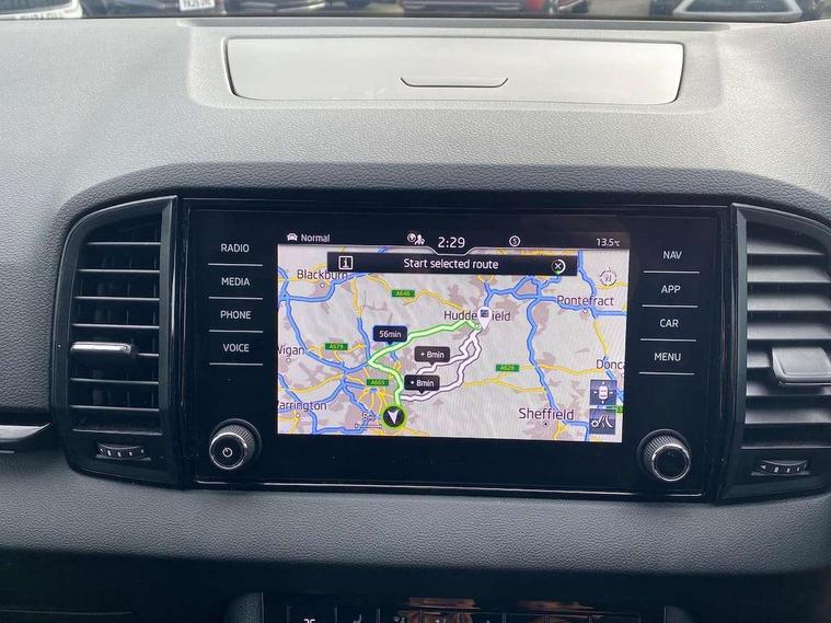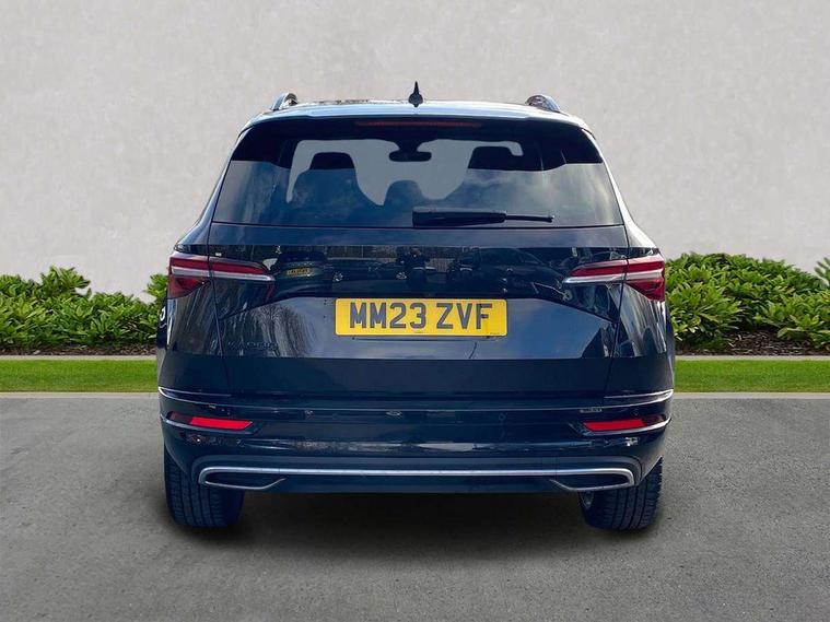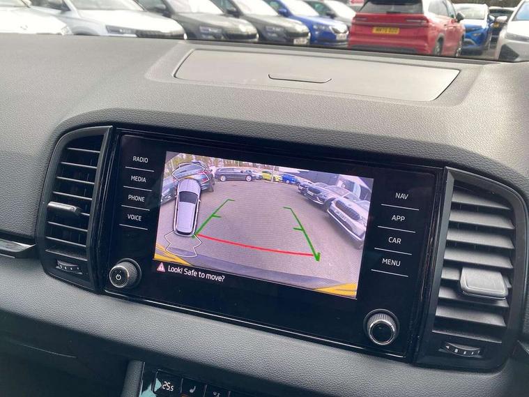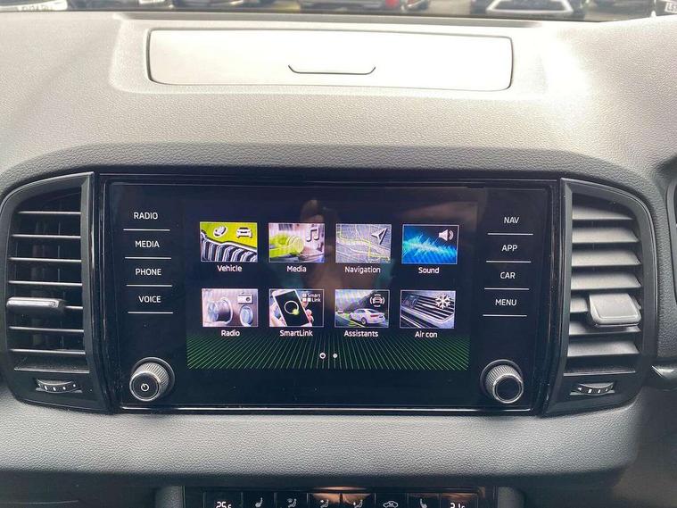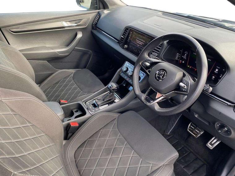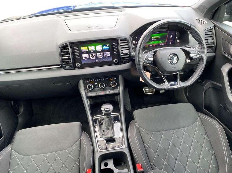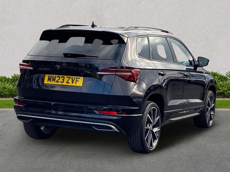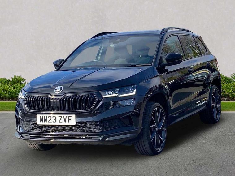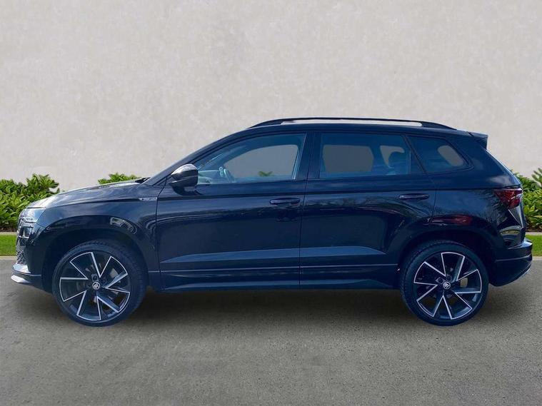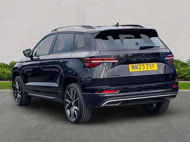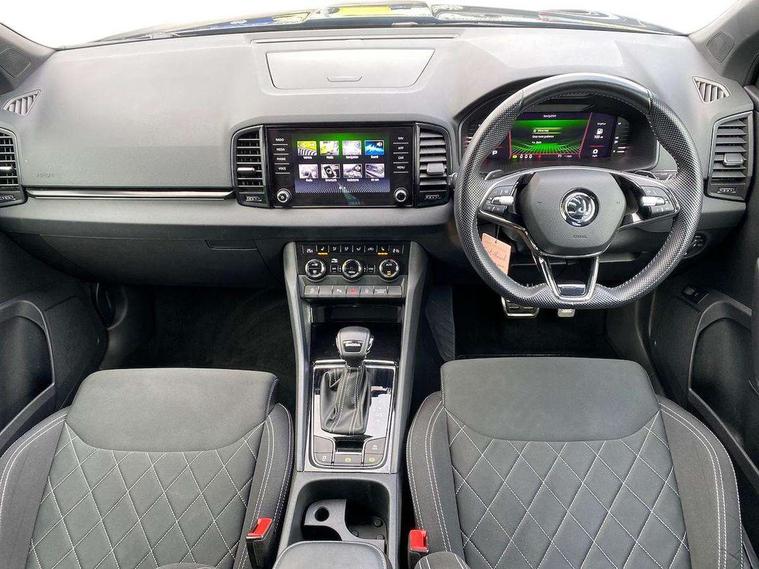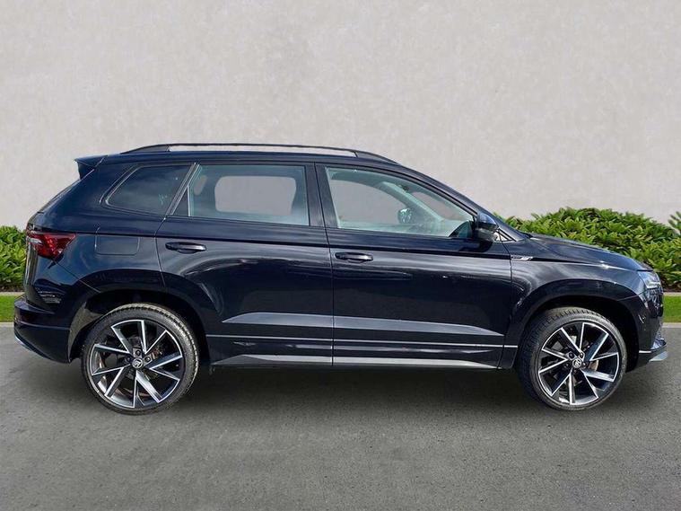 8" Digital display, Care connect, Driver fatigue sensor, Emergency services call system, Outside temperature gauge, Service interval indicator, SmartLink wireless for Apple and wired for Android, Start/stop system with regenerative braking, USB C Port x 2 in front centre console, Virtual cockpit, Virtual pedal with electrically operated boot door, 8 Speakers, DAB radio with Bluetooth, USB connection, Wireless charging without wireless aerial connection, Acoustic glass, Aero front windscreen wipers with intermittent function, Auto dimming rear view mirror with light and rain sensors, Black door mirrors, Black electric window control buttons, Black radiator grille, Black roof rails, Body colour door handles, Dynamic headlight range control with cornering light function, Electric front and rear windows with child proof lock, Front door steps with SportLine logo, Heated rear windscreen, LED daytime running lights, LED rear lights with high functionality welcome effect and dynamic indicators, Light assistant (coming/leaving home/tunnel light), Panoramic sliding sunroof, Plastic scuff plates, Privacy glass, Protective door side sills in body colour, Rear diffuser, Rear side wing doors, Rear spoiler, Rear window wiper with washer system and intermittent control, Safety reflectors on front doors, Skoda lettering on tailgate in black, Sportline badge on front fender, Sportline decorative inserts with badging, Sports front and rear bumpers, 1.5 litre bottle holders in driver and front passenger door panels, 12V socket in boot, 12v socket in front centre armrest with storage compartment and rear air vents, 3 rear height adjustable headrests, 3 seat bench in 2nd row, 3 spoke leather sports multifunction steering wheel and silver stitching with gear shift paddles, 4 foldable roof handles with rear coat hooks, Black floor carpet, Black roof headlining, Chrome inner door handles, Double sided boot floor, Foldable hooks in the boot, Front head restraints, Height adjustable front three point seats belts with tensioners, Height/reach adjust steering wheel, Ice scraper, Illuminated glovebox, Illuminated luggage compartment, Isofix child seat preparation outer rear, Manual lumbar support for front seats, Pen holder, Pollen filter, Rear boot cover, Rear reading lights, Rear seats fixed folding and divided 60:40, Rubbish bin door, Safety vest holder, Single front passenger seat, Storage box in upper central dashboard closed, Sunvisors with illuminated vanity mirrors, Textile floor mats, Ticket holder, Titan black interior ceiling, Welcome animation with sportline logo, Boot pack - Karoq, Light Pack - Karoq, Parking pack - Karoq, Automatic door unlocking in case of crash, Automatic fuel cut off in case of crash, Child locks on rear doors, Driver airbag, Electronic parking brake with auto hold function, Emergency rear braking signal, ESC including ABS, MSR, ASR, EDS, HBA, DSR, RBS, MKB and traction control, Front side airbags, Hill hold control, Knee airbags, Passenger airbag with switch-off function, Pedestrian monitor, Seatbelt reminder signalisation and pretensioner for all seats, Three point seatbelts rear, Two tone horn, Tyre pressure display, Tyre pressure monitor, Alarm with interior monitoring, back up horn and tilt sensor with safe function, Electronic engine immobiliser, Keyless entry and start/stop, Remote central locking with 2 remote folding keys, Black air vent surround, Black centre console, Satin black dashboard, Satin black door trim, 19" Vega black polished alloy wheels, Anti-theft wheel bolts protection, Matt black aero hub caps, Storage on wheel cover, Tool kit,