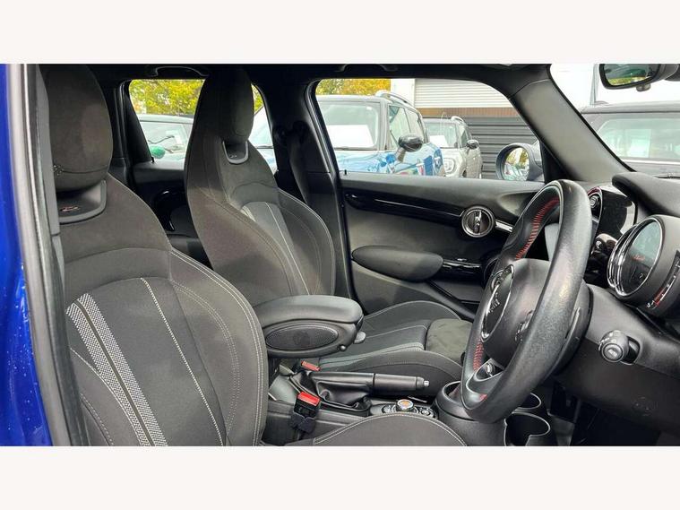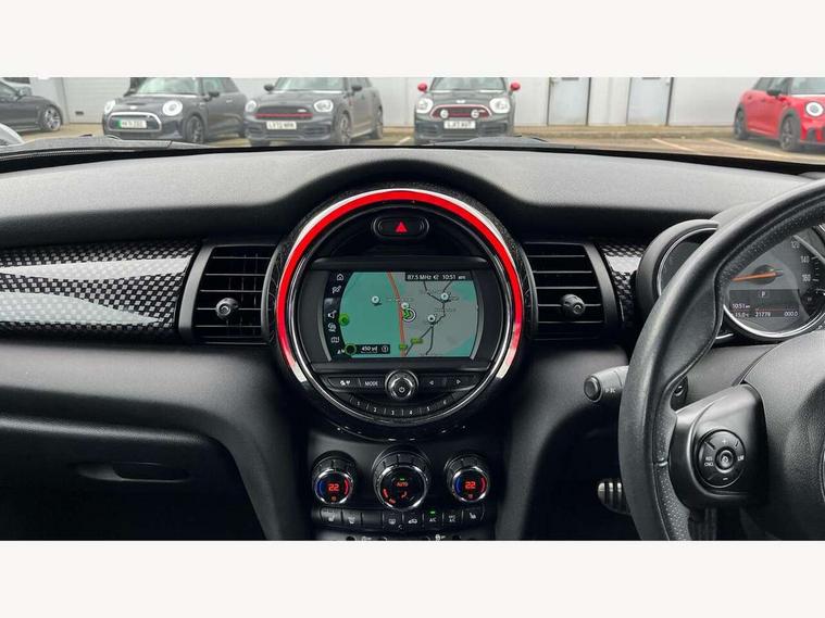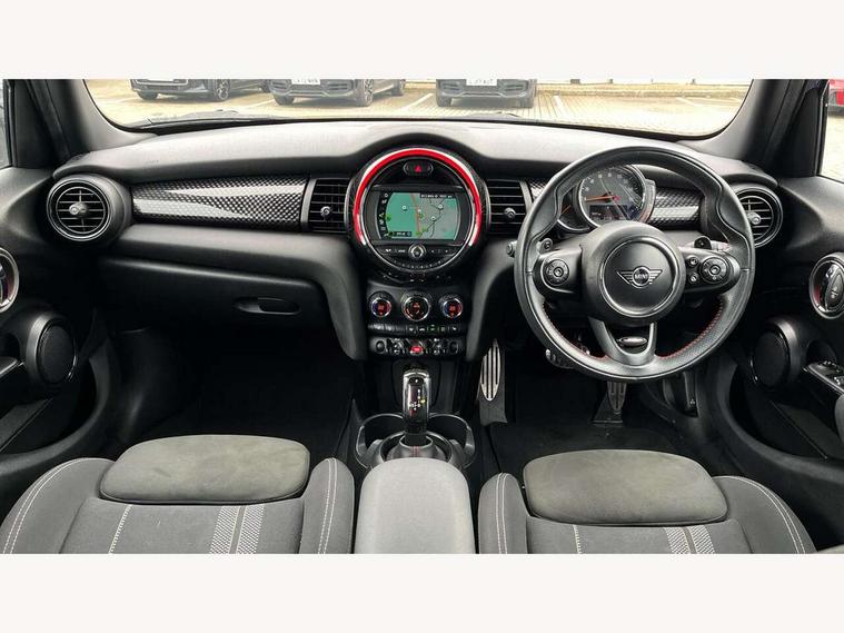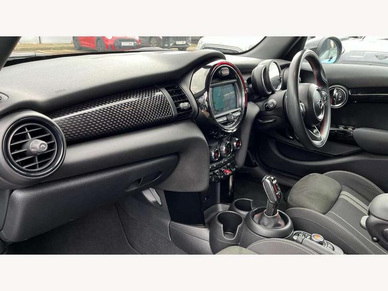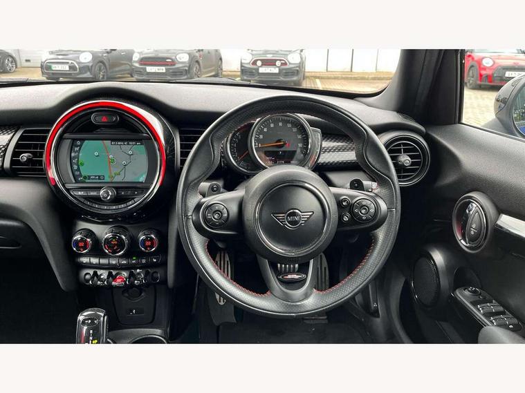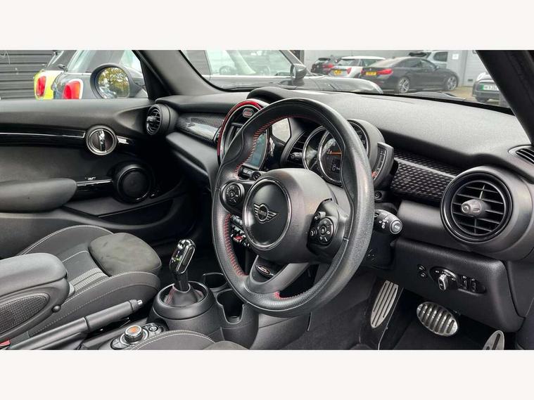 Automatic start/stop function with brake energy recuperation, Compatible mobile phone bluetooth with audio streaming, Electro-mechanical speed dependant steering assistance, Instrument cluster, Mini E-call, MINI TeleServices, On board computer, Service interval indicator, Double Vanos system, Fully variable valve control, High precision injection, Performance Control, Steptronic sport transmission with double clutch and steering wheel paddles, 6.5" touchscreen with LED ring, FM tuner and DAB digital radio, Automatic headlight activation switch, Bonnet scoop, Chrome border honeycomb structure radiator grille with S badge, Chrome plated fuel cap, Dynamic brake lights, Electric front+rear windows, Heated rear window, Heated windscreen washer jets, John Cooper Works - aerodynamic kit (front and rear apron, spoiler), front and rear sport bumpers and part-painted side sills with door sill finishers, John Cooper Works rear spoiler, LED headlight with closed ring and daytime driving lights, Metal door sill strips with Cooper S imprint, Model logo Cooper S on right of tailgate, Rain sensor window wipers, Rear fog lights, Rear LED lights with union jack design, Rear window wiper, Side scuttle panel with integrated indicator, Sun/heat protection glass, Two central exhaust tailpipes with chrome finisher, White indicator lenses, 12V Accessory socket in centre console, 4 lashing eyes in luggage compartment, 60/40 split folding rear seat, Anthracite headlining, Chrome interior highlights, Cupholders, Front and rear head restraints, Front and rear isofix with front passenger airbag deactivation, Glove compartment, Height and length steering column adjustment, Interior lighting with 12 basic colours selectable via toggle switch in roof, John Cooper Works leather steering wheel with contrasting stitching in Chilli Red with John Cooper Works logo, John Cooper Works Logo in seat, Leather gearshift lever and handbrake gaiters, LED reading lights, vanity mirror lights, front foot well light and spotlight on front seats, Manual air conditioning, Mechanical seat adjustment, driver seat height adjust, forward/back and front seats backrest, Mini logo projection on floor from drivers exterior mirror, Multifunction steering wheel, Storage compartments in doors, Storage pocket on back of front seats, Sunvisors with vanity mirrors, 3 point seatbelts on all five seats, 6 Airbags - front, side, head and seat belt tensioners, Anti-lock braking system (ABS), DSC - Dynamic Stability Control, Front and rear disc brakes, Hill start assist, Two tone horn, Tyre pressure monitoring system, Alarm system with tilt sensor, monitoring doors, bonnet interior and tailgate, Electronic vehicle immobiliser, Start/stop toggle with keyless go, Tool kit,