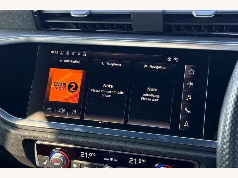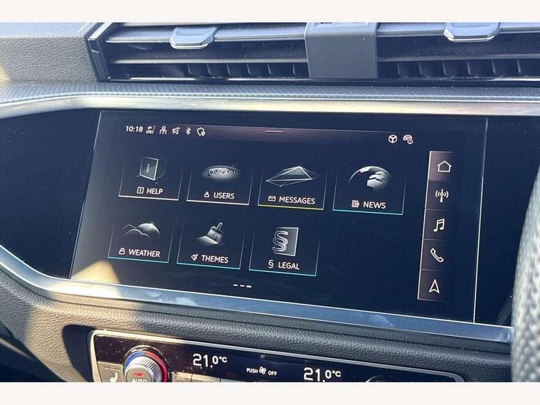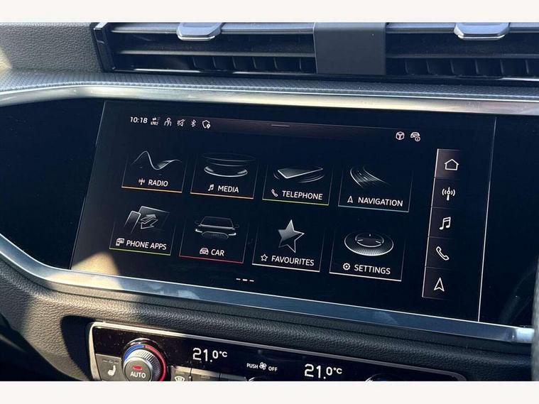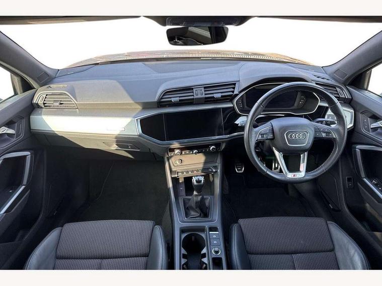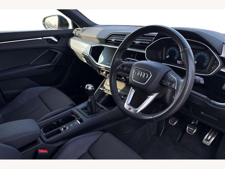 Audi drive select, Audi lane departure warning, Audi Virtual Cockpit - 10.25" display, Bluetooth interface, Camera based traffic sign recognition, Cruise control + speed limiter, Legal emergency call, MMI Navigation Plus with high resolution 10.1 inch touchscreen colour display, Power operated tailgate, Progressive steering, Rear parking sensors, Service interval indicator, Smartphone interface includes wireless Apple carplay/Android Auto, Start stop system with recuperation, Voice control system with natural language interaction, Sports suspension, 2 USB-C ports with charge and data functions, 6 passive loudspeakers, DAB digital radio module, Acoustic windscreen, Aluminium window trim, Auto dimming frameless rear view mirror, Diffuser grille in grained matt black, Diffuser trim in selenite silver, Electrically folding, adjustable and heated door mirrors with integrated LED side indicators and kerb view function for passenger side, Front and rear electric windows, Front fog lights, Front side air inlets in selenite silver, Front underbody protection in manhattan grey paint finish, Grille surround in aluminium silver matt, High gloss black finish B and C pillars, LED Dynamic rear indicators, LED headlights with LED daytime running lights, LED rear lights, LED third brake light, Privacy glass dark tinted rear and rear-side windows (from B-pillar backwards), Radiator grille in anthracite black with inlay in matt aluminium silver, Rain and light sensors, Rear side wing doors, Rear underbody protection in matt black, Rear wiper, S line badges on front wings, S line front and rear bumpers and side skirts in contrasting Manhattan grey paint finish, Side skirt insert in matt Platinium grey, Variable front intermittent wipers, 12V socket in rear centre console, 3 seat bench in 2nd row, 3 spoke leather multifunction steering wheel features S badging and grips in perforated leather with contrast stitching, 40:20:40 folding with manual adjustment for 60:40 forwards/backwards position and backrest angle, Adjustable rear seat bench/backrest with centre armrest and cupholder, Black cloth headlining, Dual zone electronic climate control, Front and rear black floor mats with contrast stitching, Front and rear headrests, Front and rear roof module including reading lights, Front centre armrest, Glove compartment lighting, Height and reach adjustable steering wheel, Illuminated door sill trims with S logo, ISOFIX child seat mounting for front passenger with airbag deactivation and outer rear seat including top tether attachment point for outer rear seats, Luggage compartment light right in white, Luggage compartment sill protection in stainless steel, Manual front seats with height adjustment, Perforated leather gearknob, Single front passenger seat, Stainless steel pedals, Ambient lighting pack - Q3, Non smoking pack - Q3, 3x3 point rear seatbelts, 6 airbags - Driver, front passenger, curtain and side windows, Audi pre-sense front with pedestrain and cyclist recognition, Electrically operated child locks on rear doors, Electromechanical parking brake, Electronic stabilisation control including ABS, ASR and EDL, Front seatbelt reminder, Hill descent control, Hill hold assist, Pre sense basic, Seatbelt monitoring, Tyre pressure warning, Warning triangle and first aid kit, Anti theft alarm, Anti theft wheel bolts, Immobiliser, Remote central locking, Aluminium look interior elements, Black dashboard, Dark matt brushed aluminium inlay, Detail dashboard around MMI touch colour display in glass look, black with surround in aluminium look, Leatherette door armrest,