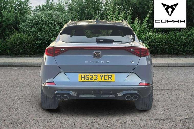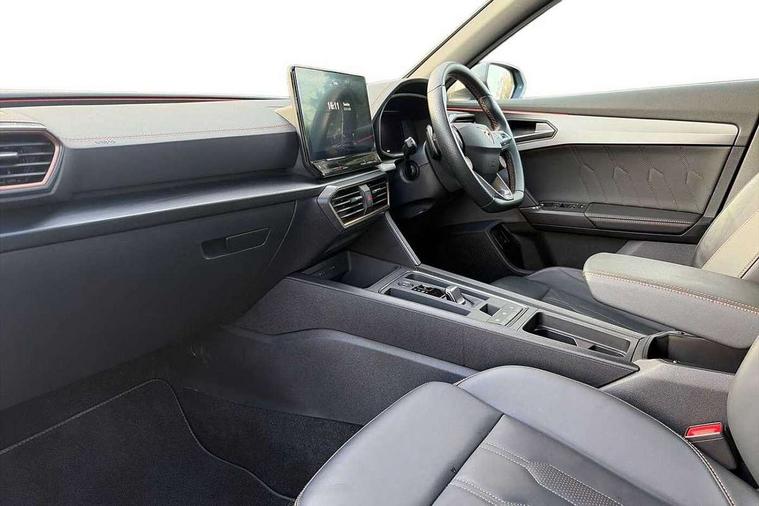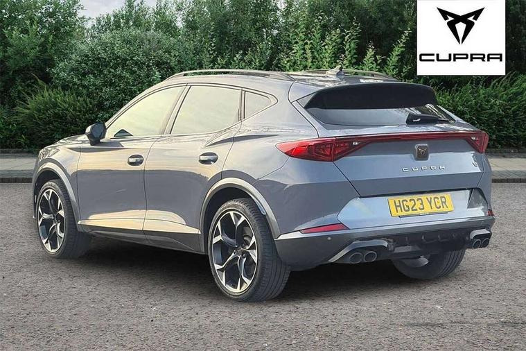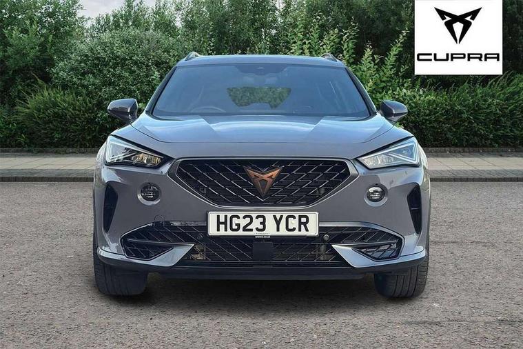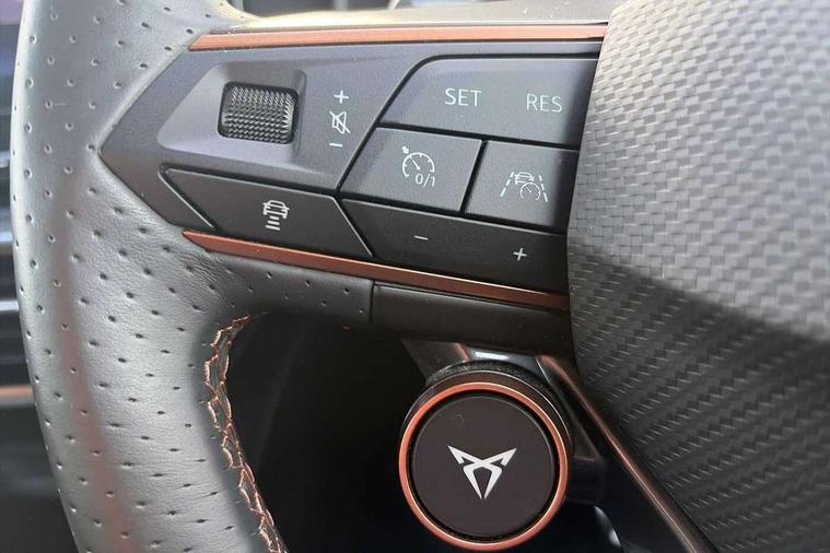Digital cockpit and configurable dashboard, Driver alert system, Dynamic chassis control with driving profile selection (Comfort, Sport, CUPRA, Individual), Forward collision warning with automatic braking, Lane assist, Navigation system with 12'' Touchscreen Display, Park assist (inc front/rear parking sensors), Predictive adaptive cruise control with speed limiter, RPM, trip computer, outside temp gauge, instrument light brightness, low fuel warning light, lights on reminder, gearshift indicator, Service interval indicator, Speed sensitive power steering, Start/stop system with regenerative braking, Virtual pedal and electric tailgate, Voice control system, Wired Android Auto, Wireless apple carplay, Wireless phone charger, Electronic locking differential and dynamic traction support, Sports suspension with front shock absoption, 2 front and 2 rear USB type C sockets, Auxiliary input socket, DAB radio, Auto dimming rear view mirror, Body colour door handles, Body coloured bumpers, Dark grey wing mirror, Daytime running light with automatic headlight control and coming home feature, Dynamic headlight range control, Electric front/rear windows, Electrically adjustable heated and folding door mirrors with memory function, Front fog lamps with cornering function, Gloss black roof rails and window surrounds, LED Headlights, LED Taillights with dynamic indicator, Rain sensing wipers, Rear diffuser with twin exhaust pipe on each side, Rear side wing doors, Rear wash/wipe, Sports bumpers, Third brake light, Tinted rear windows, VZ logo rear badging, Welcome lights, 12v power supply in centre console, 12V socket, 12v socket in loadspace, 2 front and 2 rear reading lights, 230V socket, 3 seat bench in 2nd row, 60/40 split rear bench seat with armrest and mechanical seat release, Black headlining, Cupra sports pedals, Dust/pollen filter, Front and rear head restraints, Front centre armrest, Height/reach adjust steering wheel, Illuminated interior front door sills, Illuminated sunvisor with mirror, Isofix, Leather heated multi-function sports steering wheel with start stop, CUPRA mode button and gear shift paddles, Luggage tie-down hooks, Single front passenger seat, Three zone climate control with control panel in rear, Variable luggage/load compartment floor, Wraparound lighting, Genuine Nappa leather Pack - Cupra, Safety and driving pack (XL) - Formentor, 3 point seatbelts on all rear seats, ABS, Brake control system - ESC and brake booster, Child proof door locks, Driver and front passenger airbags with front passenger airbag de-activation, Electronic parking brake, Front and rear disc brakes, Front side curtain airbags, Hill hold control, Public e-call, Seat belt reminder for front and rear seats, Tyre pressure monitoring system, Anti theft alarm system, Keyless entry and start system (KESSY), Locking wheel bolts, Copper and aluminium interior detailing, 19" 'Exclusive' machined sport matte black and silver alloy wheels, Space saver spare wheel,