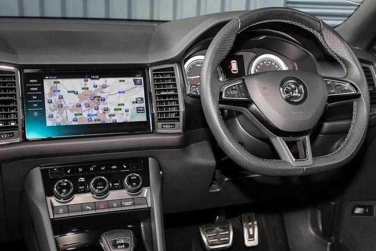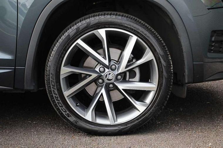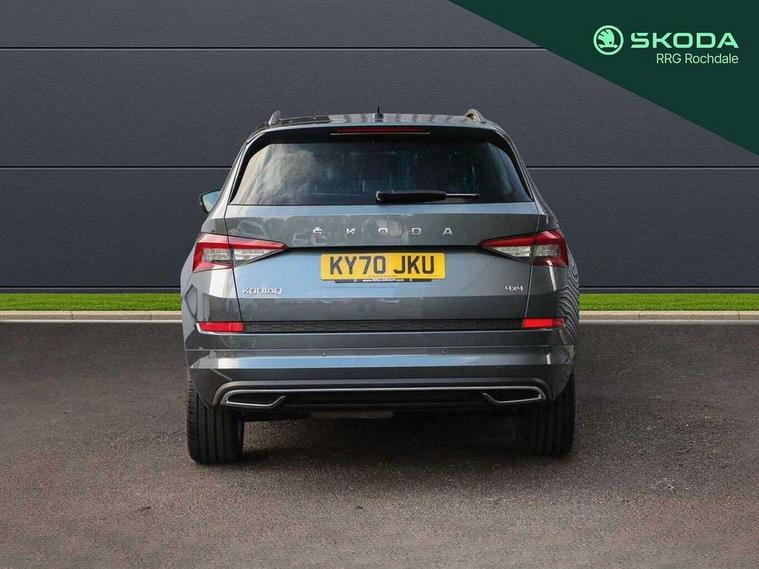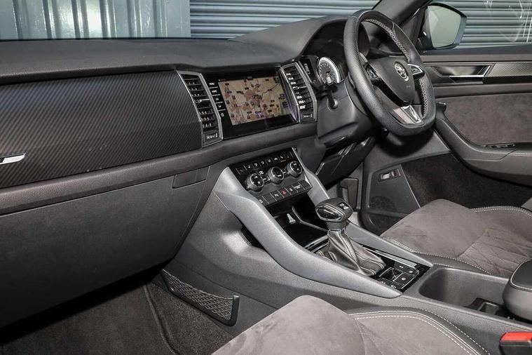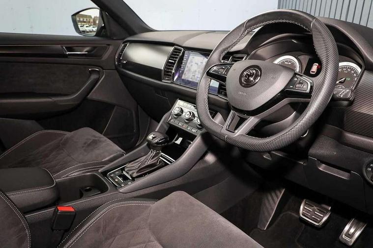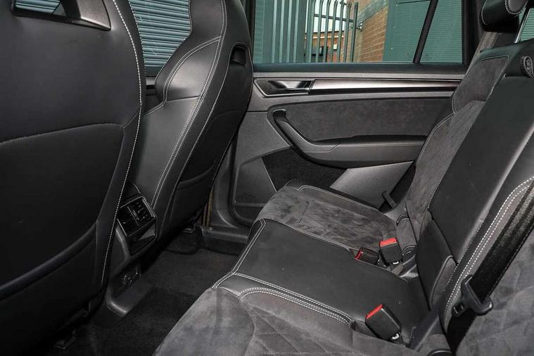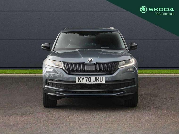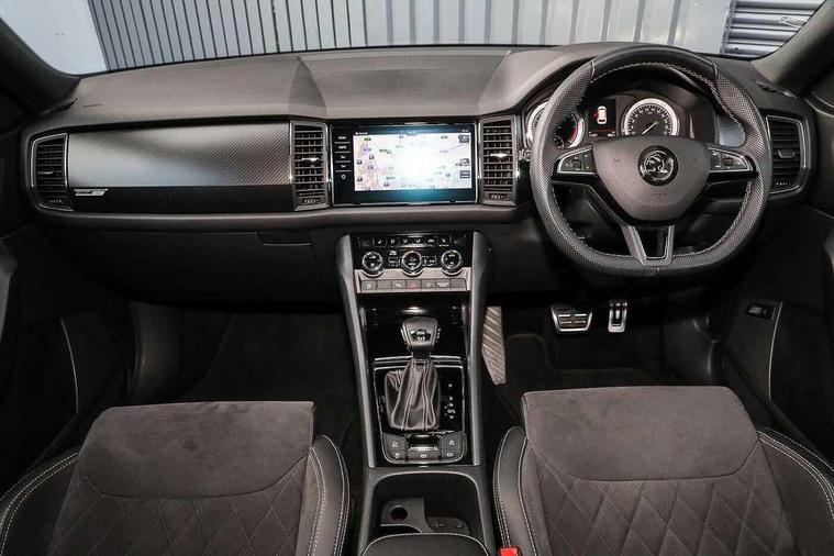 Bluetooth system, Columbus satellite navigation with 9.2" touch screen and integrated Wi-Fi + WLAN and web radio, Digital voice enhancement, ECO Stop/start function, Exterior temperature indicator, Map care, Progressive power assisted steering, SmartLink plus, Speed limiter, Sports dials, USB C Port x 2 in front centre console, Bolero Radio, DAB Digital radio, DVD System, Aero front windscreen wipers with intermittent function, Aero rear window wiper, Auto dimming rear view mirror, Automatic activation of hazard warning lights, Black electric window control buttons, Black roof rails and door mirrors with radiator grille and window surrounds, Black wheel arch surrounds, Body colour bumpers, Body colour door handles, Chrome exhaust tailpipe, Electric front and rear windows, Electrically adjustable/heated/foldable and auto dimming door mirrors with memory function, Front door steps with SportLine logo, Full LED Headlights with adaptive front light system and LED daytime running lights, Headlight washers, Heated rear window, LED front fog lights with static cornering light function, LED rear fog light, LED third brake light in rear spoiler, Light assistant (coming home/tunnel light), Rain and light sensors, Rear diffuser, Rear spoiler, Safety reflectors on front and rear doors, Sportline badge on front fender, Sports front and rear bumpers, Sunset privacy glass, Tailgate lettering in Black, Without engine designation, 12V socket in boot, 2 rails with 2 hooks including 4 hooks for net programme, 3 spoke leather sports heated multi-function steering wheel with hands off detection, 4 foldable roof handles with rear coat hooks, 4 lashing points on luggage floor, 60:40 foldable rear seat with sliding adjustment and backrest angle adjustment, Alcantara door panels, Alcantara/Leather upholstery with Sport seats with silver stitching, Aluminium pedals, Black roof headlining, Bottle holders in door panel in the 1.5 litre front and 1 litre rear, Cargo storage compartments, Centre console with open storage box, cup holder and 12V socket, Chrome headlight control button, Chrome interior door handles, Coat hooks on B pillar, Covered storage compartment on driver side, Front and rear door armrest with black adductor trim, Front and rear height adjustable headrests, Front centre armrest with storage compartment, cup holder and 12V socket, Front courtesy lights, Gear shift lever with chrome frame and black gloss insert, Illuminated and cooled glovebox, Illuminated luggage compartment, Isofix child seat fittings in outer rear seats with top tether, Manually adjustable steering column, Net programme in boot (1x horizontal Net, 2x vertical Nets), Overhead glasses storage compartment, Paddles on steering wheel for DSG gearbox, Pollen filter, Rear centre armrest with cupholders, Roll up luggage compartment cover with intermediate position, Small Bags on the inner sides of the front backrests, Storage compartment in lower middle instrument panel with closing, Three rear height adjustable headrests, Ticket holder on A Pillar, Umbrella in door panel, LED Interior Light pack - Kodiaq Scout/Sport Line/VRS/Laurin + Klement, Auto door release and activation of warning lights, Driver and passenger airbags, Electronic parking brake with hill hold control, Emergency rear braking signal, ESC (incl. ABS+MSR+ASR+EDS+HBA+DSR+RBS+MKB), Front and rear three point safety belt on all seats, Front assist includes AEB city/urban, Front passenger airbag deactivation switch, Front side airbags, Fuel cut off safety device, Head and knee airbags, Rear disc brakes, Safety vest holder in door, Seat belt reminder for all seats, Tailgate unlocking from outside, Two tone horn, Tyre pressure monitor, Warning lights in front doors, Alarm with interior monitoring and tilt sensor with safe function, Immobiliser, Keyless entry and start system (KESSY), Remote central locking, Carbon finish dashboard and door inserts, Chrome air vent surrounds, 20" Vega Anthracite alloy wheels with anti-theft wheel bolts,
