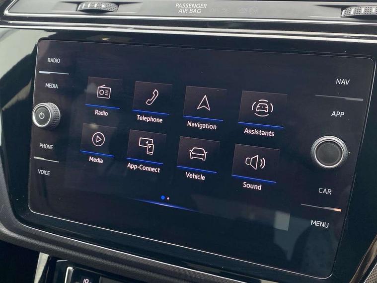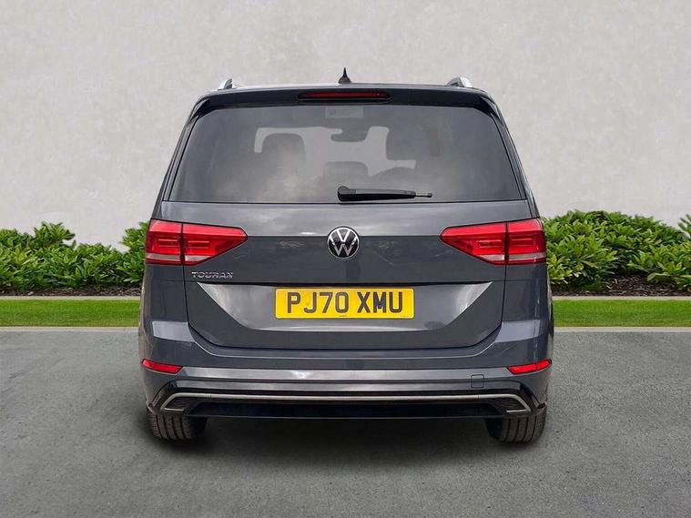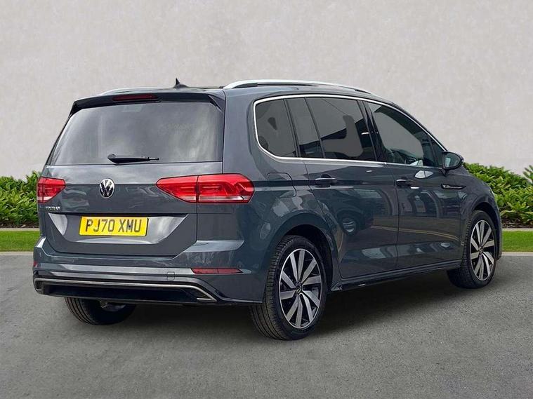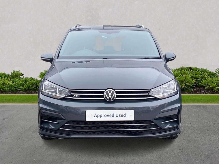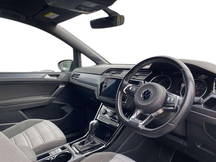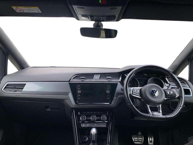 Adaptive cruise control, Audible lights on warning, Bluetooth telephone connectivity, Car information display, Driver alert system, Driver electronic voice amplification function, Electronic odometer, External temperature gauge, Flat tyre indicator, Mobile pairing with SMS function, Multifunction colour display, Rev counter with fuel gauge, Speed limiter, Speed sensitive power steering, Stop/start system, Think blue trainer driver tips and journey analysis, Trip and service interval display, Petrol Particulate Filter, XDS electronic differential lock, 4x20 watt output, Audio Connectivity System, DAB Digital radio, MP3/WMA compatability, SD card slot, Title and cover art display, USB connection, Aerial integrated into side window, Body colour bumpers, Body colour door handles, Body colour door mirrors with integral indicators, Chrome fog light surround, Chrome lower front bumper insert, Chrome trimmed front air intake surrounds, Chrome trimmed radiator grille louvre inserts, Chrome trimmed side windows, Dusk sensor + auto driving lights, Electric folding door mirrors with reverse activated kerb-view adjustment on passenger's door mirror, Front and rear electric windows, Fully galvanised body, Gloss black finish B pillar, Green tinted heat insulating glass, High level third brake light, Rear tinted glass from B-pillar backwards approx 65% tinted, Rear wash/wipe with intermittent wipe setting, Silver roof rails, Tailgate wiper- reverse gear activation, Twin chrome exhaust tailpipes, Unique R Line badging, Volkswagen roundel, Windscreen wipers intermittent wipe, 12V power point for Row 2, 12V socket in luggage compartment, 2 individual fold flat 3rd row seats, 2 three point seatbelts in 3rd row, 2nd row centre armrest, 2nd row centre seat converts into table, 3 single slide/fold/removable 2nd row seats, 3 Zone electronic climate control with automatic air recirculation, 3x3 point seatbelts on 2nd row with height adjust on outer seats, 4 boot load lashing points, 4 way adjustable front head restraints, 5 headrests, Aluminium kick plate, Ambient lighting in door trim and foot well, Black roof lining, Driver and front passenger under seat drawer, DSG Paddle Shifts, Dust/pollen filters, Foldable front passenger seat backrest, Front + rear carpet mats, Front and rear reading lights, Front centre armrest with storage compartment, Front comfort seats with lumbar support, Front cupholders x 2, Front passenger seat height adjust, Front seat R Line logo with rear seat backrest, Front seat storage pockets, Front seatback folding tables, Front seats with R-Line logo, Grey stitching on steering wheel, Height adjustable driver's seat, Height/reach adjust steering wheel, Illuminated glovebox, Illuminated vanity mirrors, Instrument lighting white adjustable panel illumination with red night time illumination, Interior light with delay, Isofix on 2nd row outer seats, Isofix on 3rd row seats, Large storage compartment in roof console, Leatherette on rear of front seats, Low tunnel 2nd row seat, Media box in dashboard on passenger side, Multi storage in passenger/luggage areas, Multi-function centre console with storage facilities, Multifunction leather trimmed steering wheel including leather trimmed gear knob with 3.5" screen with multifunction computer, R-Line door sill protectors, Retractable luggage cover, Split folding rear seat backrests, Stainless steel pedals, Storage bins on all doors, Convenience Pack - Touran, Mirror pack - Touran, R line styling pack - Touran, 3 point height adjustable front seatbelts, Auto hold function, Automatic post collision braking system, Door open warning reflectors, Driver/Front Passenger airbags, Drivers knee airbag, EDL + ASR, Electronic parking brake, Energy recovery system, ESC with ABS, First aid kit, Front and rear (row 2) curtain airbags, Front assist including city emergency braking, Front seat side impact airbags, Front/rear disc brakes, Hill hold control, Hydraulic Brake Assist (HBA), Loose wheel warning function, Manual passenger airbag deactivation function, Pre crash preventive occupant protection, Seatbelt warning lamp and buzzer, Traction control, Two tone horn, Warning triangle, Alarm with remote central locking and interior protection, Electronic engine immobiliser, Black lead grey decorative inserts dash and door panel, Chrome plated instrument surrounds, Embroidered emblems to headrestraints, 18" Marseille alloy wheels with self sealing tyres and anti-theft wheel bolts, Tyre mobility system,