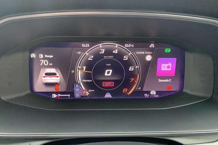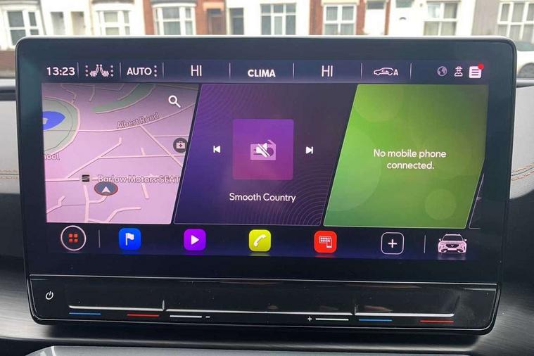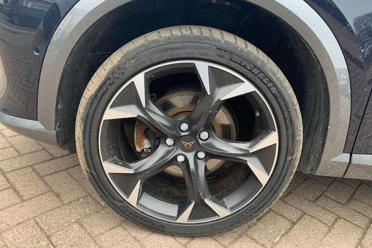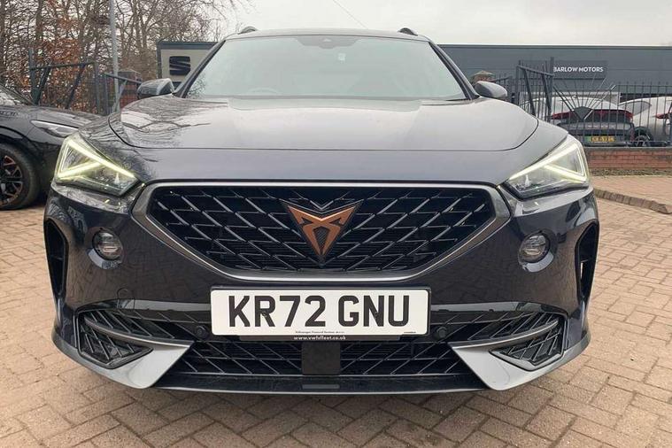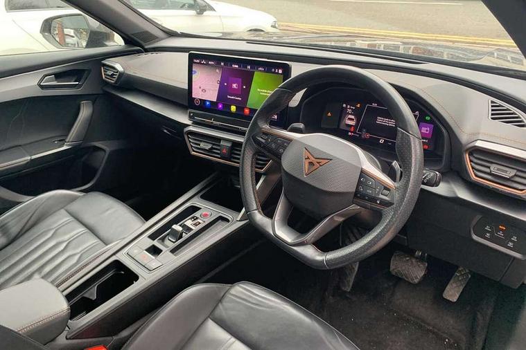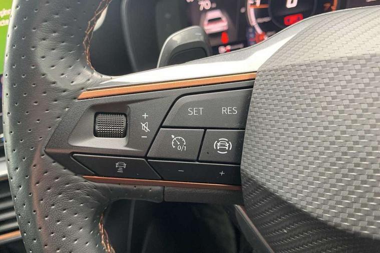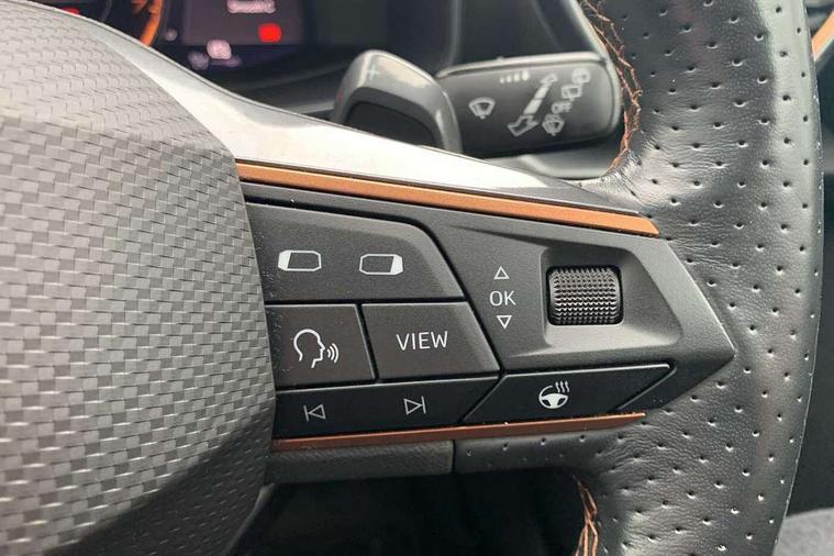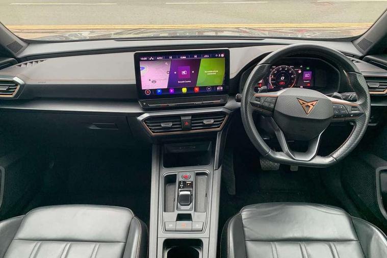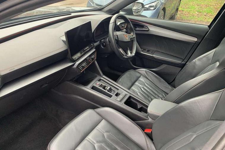 Digital cockpit and configurable dashboard, Driver alert system, Driving profile selection, Forward collision warning with automatic braking, Lane assist, Navigation system with 12'' Touchscreen Display, Park assist (inc front/rear parking sensors), PAS, Predictive adaptive cruise control with speed limiter, Rear view camera, RPM, trip computer, outside temp gauge, instrument light brightness, low fuel warning light, lights on reminder, gearshift indicator, Service interval indicator, Start/stop system with regenerative braking, Voice control system, Wireless apple carplay, Wireless phone charger, Electronic locking differential and dynamic traction support, Standard suspension, 2 front and 2 rear USB type C sockets, Auxiliary input socket, DAB radio, Auto dimming rear view mirror, Body colour door handles, Body coloured bumpers, Dark grey wing mirror, Daytime running light with automatic headlight control and coming home feature, Dynamic headlight range control, Electric front/rear windows, Electrically adjustable heated and folding door mirrors with memory function, Front fog lamps with cornering function, Gloss black roof rails and window surrounds, LED Headlights, LED Taillights with dynamic indicator, Rain sensing wipers, Rear diffuser with black simulated exhaust pipes, Rear side wing doors, Rear wash/wipe, Third brake light, Tinted rear windows, Welcome lights, 12v power supply in centre console, 12V socket, 12v socket in loadspace, 2 front and 2 rear reading lights, 230V socket, 3 seat bench in 2nd row, 60/40 split rear bench seat with armrest and mechanical seat release, Black headlining, Dust/pollen filter, Front and rear head restraints, Front centre armrest, Height/reach adjust steering wheel, Illuminated interior front door sills, Illuminated sunvisor with mirror, Isofix, Leather multi function heated steering wheel with gear shift paddles, Luggage tie-down hooks, Single front passenger seat, Three zone climate control with control panel in rear, Variable luggage/load compartment floor, Wraparound lighting, Genuine Nappa leather Pack - Cupra, 3 point seatbelts on all rear seats, ABS, Brake control system - ESC and brake booster, Child proof door locks, Driver and front passenger airbags with front passenger airbag de-activation, Electronic parking brake, Front and rear disc brakes, Front side curtain airbags, Hill hold control, Public e-call, Seat belt reminder for front and rear seats, Tyre pressure monitoring system, Anti theft alarm system, Keyless entry and start system (KESSY), Locking wheel bolts, Copper and aluminium interior detailing, 19" 'Exclusive' machined sport matte black and silver alloy wheels,