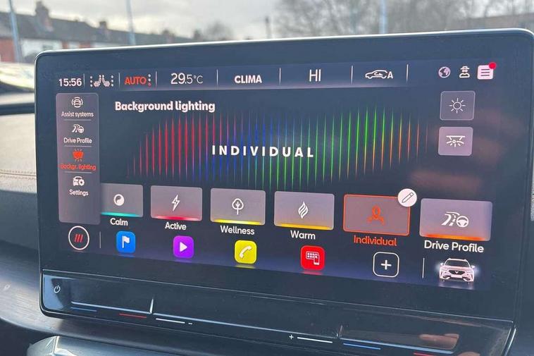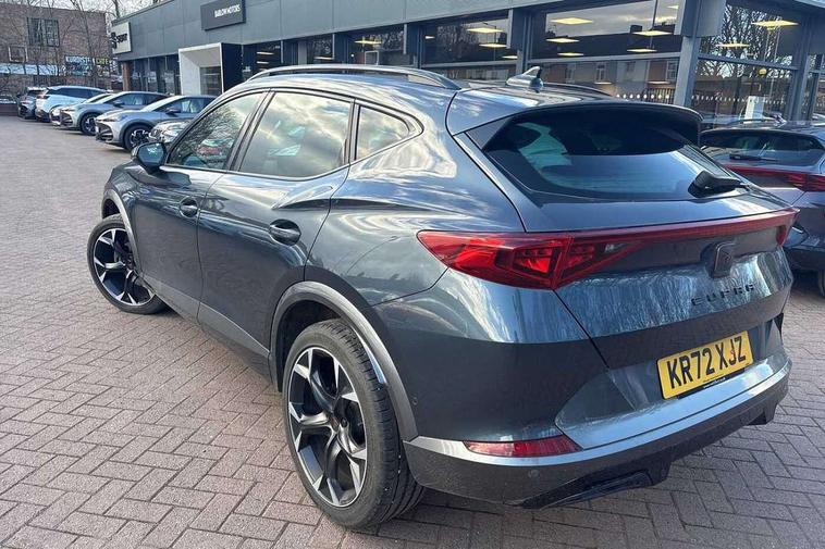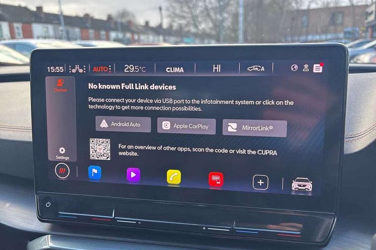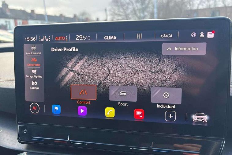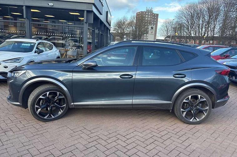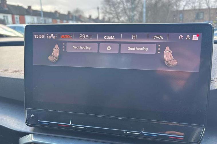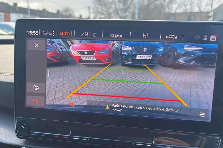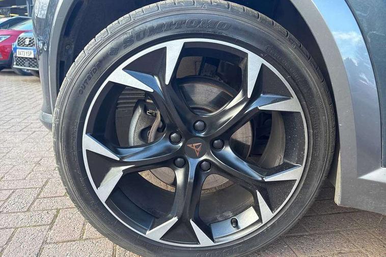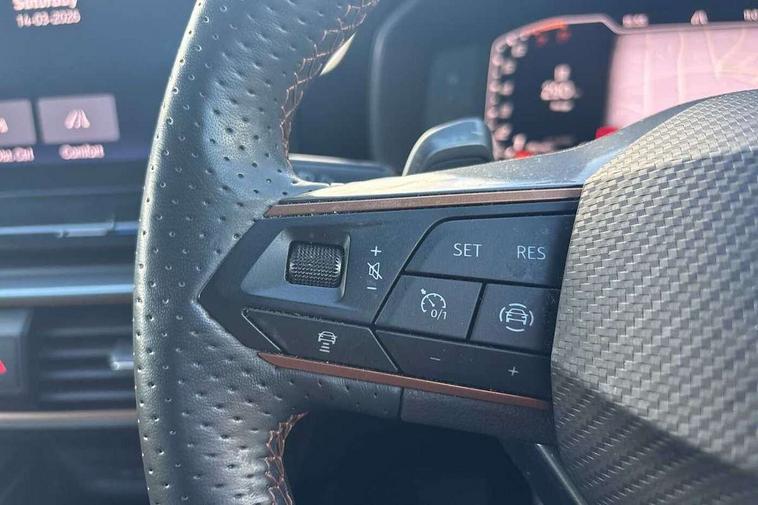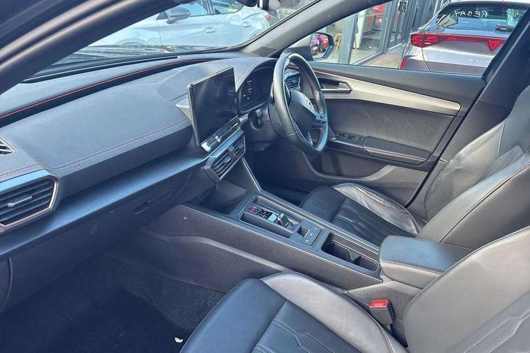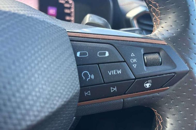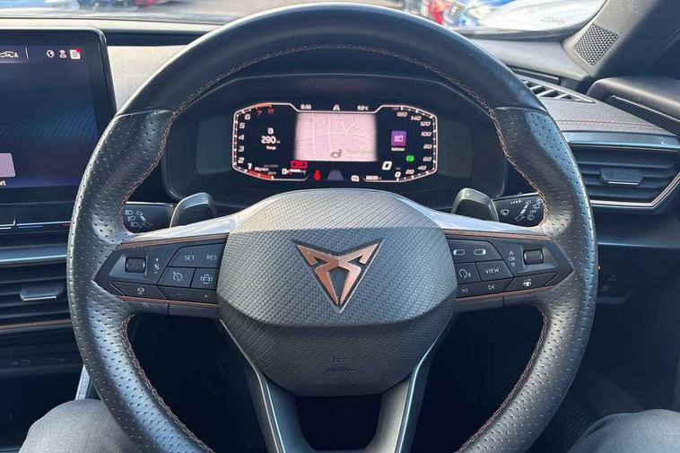 Digital cockpit and configurable dashboard, Driver alert system, Driving profile selection, Forward collision warning with automatic braking, Lane assist, Navigation system with 12'' Touchscreen Display, Park assist (inc front/rear parking sensors), PAS, Predictive adaptive cruise control with speed limiter, Rear view camera, RPM, trip computer, outside temp gauge, instrument light brightness, low fuel warning light, lights on reminder, gearshift indicator, Service interval indicator, Start/stop system with regenerative braking, Voice control system, Wireless apple carplay, Wireless phone charger, Electronic locking differential and dynamic traction support, Standard suspension, 2 front and 2 rear USB type C sockets, Auxiliary input socket, DAB radio, Auto dimming rear view mirror, Body colour door handles, Body coloured bumpers, Dark grey wing mirror, Daytime running light with automatic headlight control and coming home feature, Dynamic headlight range control, Electric front/rear windows, Electrically adjustable heated and folding door mirrors with memory function, Front fog lamps with cornering function, Gloss black roof rails and window surrounds, LED Headlights, LED Taillights with dynamic indicator, Rain sensing wipers, Rear diffuser with black simulated exhaust pipes, Rear side wing doors, Rear wash/wipe, Third brake light, Tinted rear windows, Welcome lights, 12v power supply in centre console, 12V socket, 12v socket in loadspace, 2 front and 2 rear reading lights, 230V socket, 3 seat bench in 2nd row, 60/40 split rear bench seat with armrest and mechanical seat release, Black headlining, Dust/pollen filter, Front and rear head restraints, Front centre armrest, Height/reach adjust steering wheel, Illuminated interior front door sills, Illuminated sunvisor with mirror, Isofix, Leather multi function heated steering wheel with gear shift paddles, Luggage tie-down hooks, Single front passenger seat, Three zone climate control with control panel in rear, Variable luggage/load compartment floor, Wraparound lighting, Genuine Nappa leather Pack - Cupra, 3 point seatbelts on all rear seats, ABS, Brake control system - ESC and brake booster, Child proof door locks, Driver and front passenger airbags with front passenger airbag de-activation, Electronic parking brake, Front and rear disc brakes, Front side curtain airbags, Hill hold control, Public e-call, Seat belt reminder for front and rear seats, Tyre pressure monitoring system, Anti theft alarm system, Keyless entry and start system (KESSY), Locking wheel bolts, Copper and aluminium interior detailing, 19" 'Exclusive' machined sport matte black and silver alloy wheels,