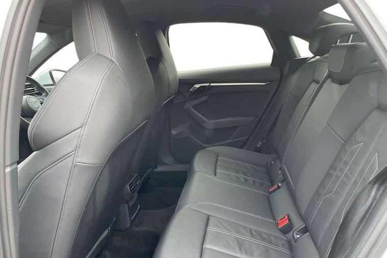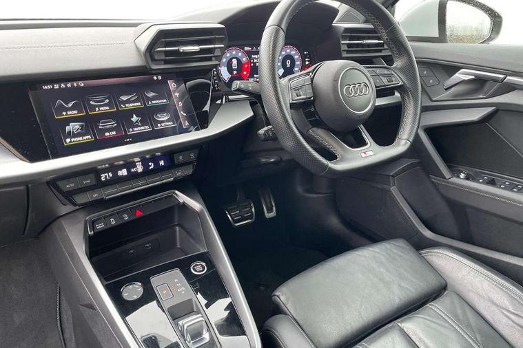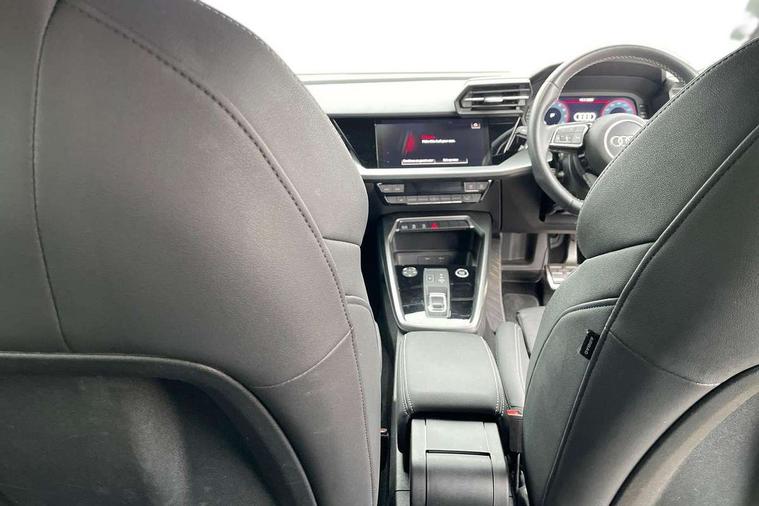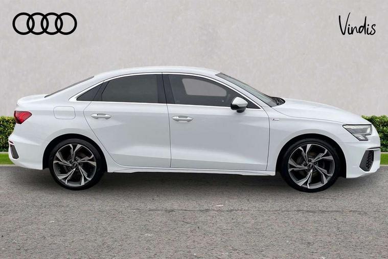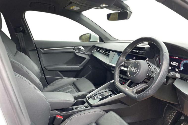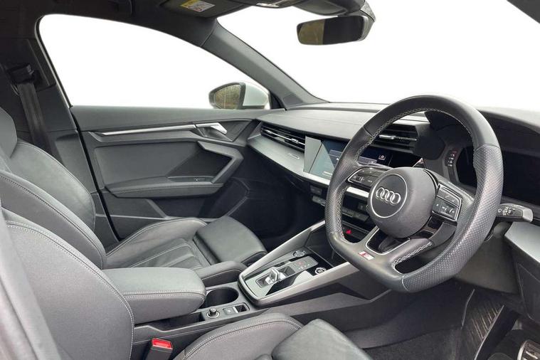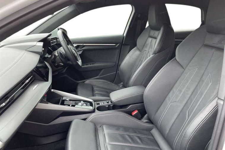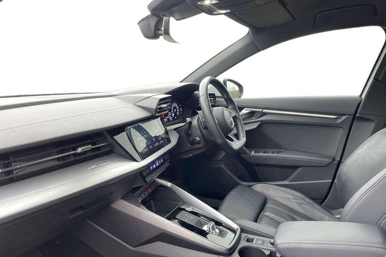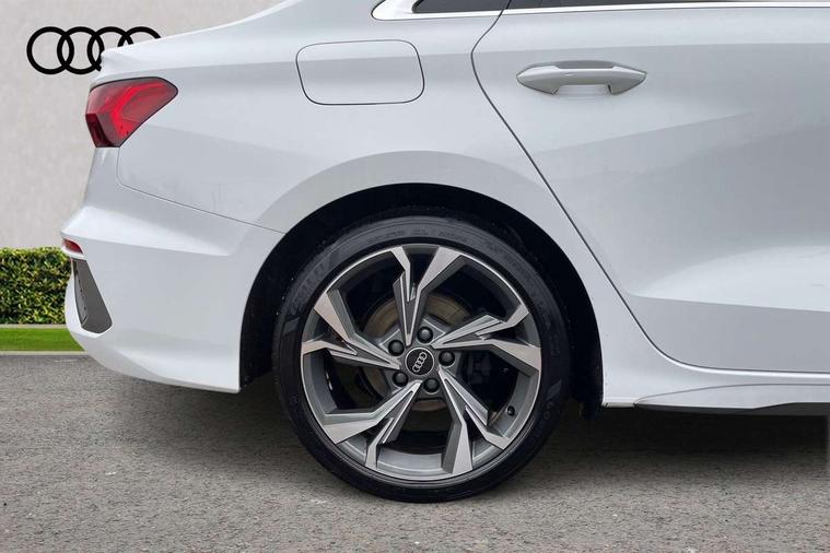 Audi connect emergency call and service, Audi drive select (Auto, Comfort, Dynamic, Efficiency and Individual), Audi smartphone interface, Audi Virtual Cockpit - 10.25" digital and colour instrument cluster, Automatic start/stop system with recuperation, Bluetooth interface, Collision avoidance assistant, Electromechanical power speed sensitive steering, Lane departure warning system, MMI Navigation Plus with high resolution 10.1" colour touch screen display, Service indicator, Voice control system with natural language interaction, 2x USB Type C ports (for charging and data transfer), 6 passive loudspeakers, CD player, DAB Digital radio, 3rd brake light, Acoustic glass windscreen, Aluminium window trim, Auto dimming frameless rear view mirror, Electrically adjustable/heated/folding/auto dimming door mirrors with integrated LED indications + kerb view function for passenger side, Front electric windows, Illuminated door sills with aluminium inserts at the front with S logo, LED daytime running lights, LED headlights with LED rear lights and dynamic rear indicators, Light and rain sensors, Model and engine designation badges at rear, Privacy glass - dark tinted rear window, rear door and side windows, Rear electric windows, S line bumpers, S roof spoiler, 12V socket and storage compartment in front centre console, 40/20/40 split folding rear seat bench with cupholder, Black cloth headlining, Dual zone electronic climate control, Front and rear centre armrest in leather, Front and rear headrests, Front/rear floor mats, Height and reach adjustable steering wheel, Interior lighting - glove compartment light and right hand side, Luggage compartment floor covering, Manual boot compartment lid, Manually adjustable front sport seats, Seat side bolsters, Stainless steel pedals and front footrest in black, Twin leather upholstery with front sports seats S embossed logo, Aluminium interior elements pack - A3, S line styling pack - A3 Saloon, 3x3 point rear seat belts, Driver and front passenger airbag with passenger airbag deactivation, Electronic Stabilisation Control (ESC) including ABS, ASR and EDL, First aid kit with warning triangle and 2 safety vests, Front side airbags with head airbags and interaction airbag, Hill hold assist, Pre-sense front with pedestrian and cyclist detection, Seatbelt monitoring, Tyre pressure loss indicator, Anti theft alarm, Anti-theft wheel bolts, Electronically operated child lock, Immobiliser, Remote control central locking, Aluminium air vent surrounds, Aluminium trim elements, Dark spectrum aluminium inlays, accent surfaces in the dashboard and centre console in platinum grey silk effect paint finish,