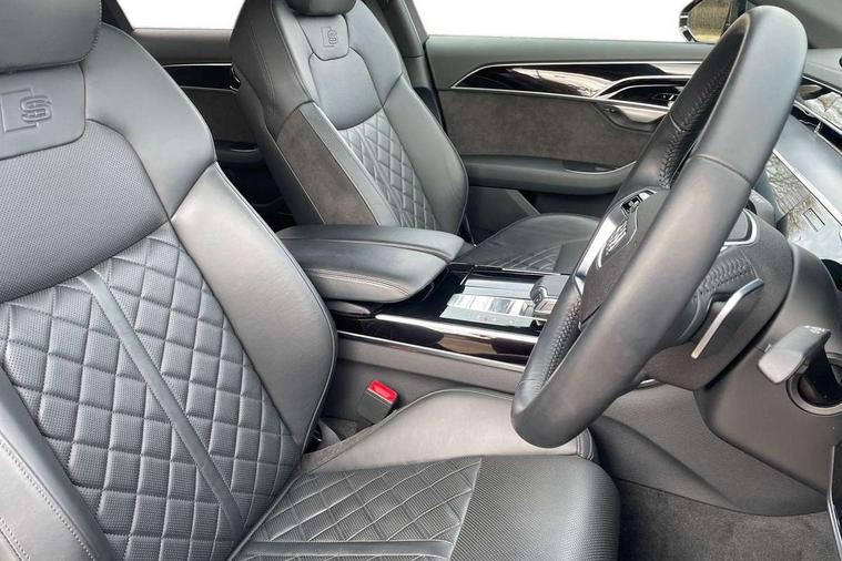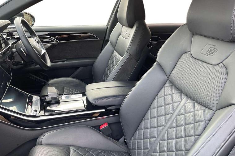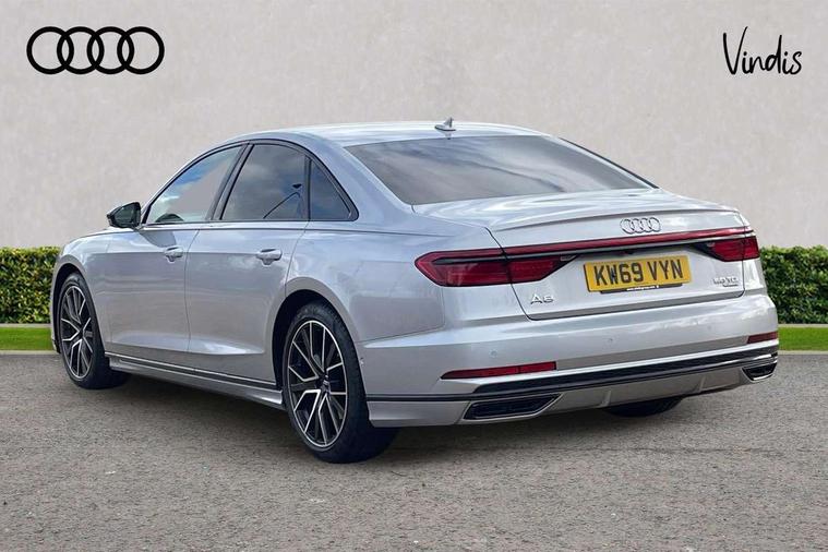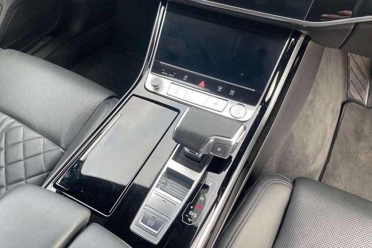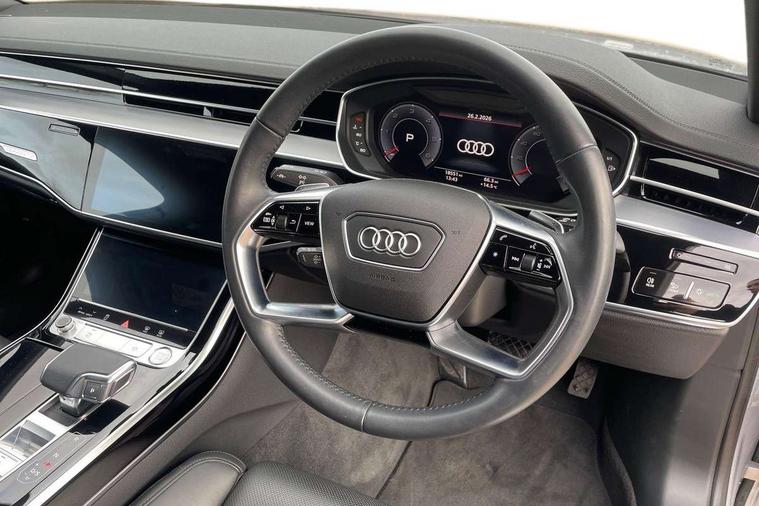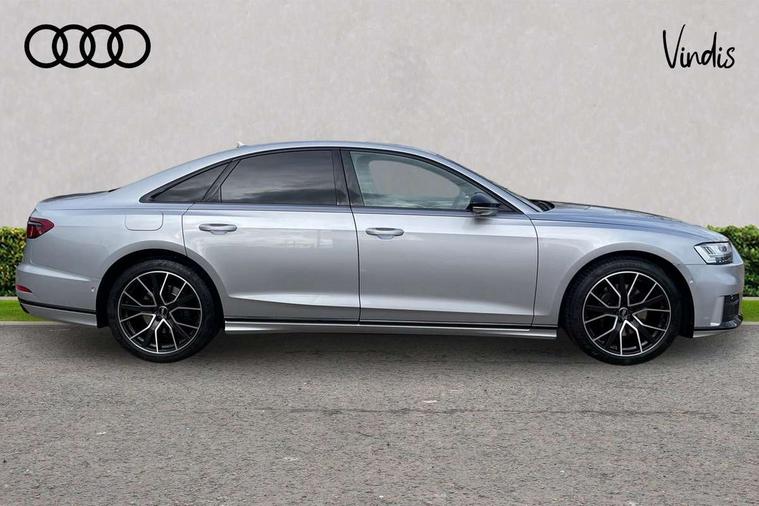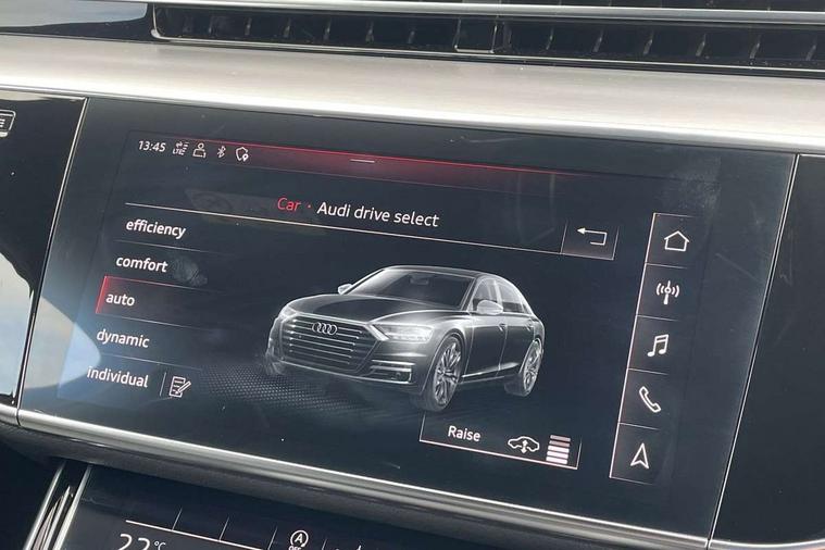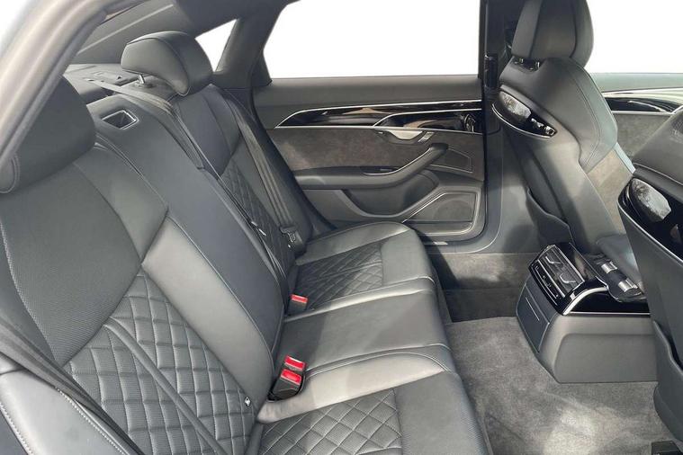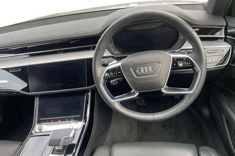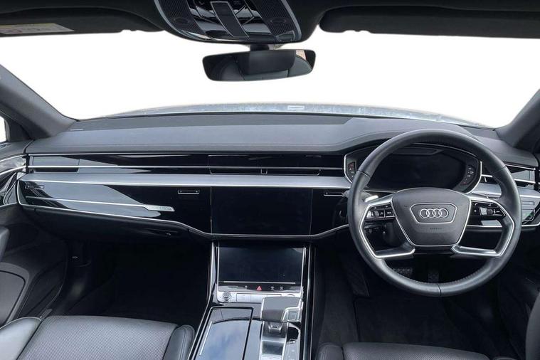 'Lights On' Reminder warning buzzer, Adaptive cruise assist with Stop and Go, Audi connect safety and service (e-call), Audi drive select, Audi phone box with wireless charging, Audi virtual cockpit, Audi wireless smartphone interface, Camera based traffic sign recognition, Colour driver's information system display, Electro - mechanical power assisted steering, Head up Display, Lane departure warning including emergency assist, MMI navigation plus with MMI touch, Operating buttons in black, glass with extended aluminium, Parking system plus - front + rear sensors, Power door closure, Power operated tailgate, Rear view camera, Remote fuel filler release, Service interval indicator, 24 litre AdBlue tank, 8 speed transmission with hill hold assist, Adaptive air suspension, Diesel particulate filter, Quattro all wheel drive with self locking centre differential, Audi music interface, Audi sound system, DAB digital radio module, DVD System, MMI radio plus, USB connection, Acoustic double glazing, Audi space frame, Auto dimming rear view mirror, Automatic headlight control system, Body colour bumpers, Body colour door handles, Body colour side protection with aluminium trim strips, Electric front windows, Electric rear windows with isolation switch, Electrically adjustable heated folding + automatically dimming exterior mirrors with memory function and integrated LED indicators, HD matrix healights with LED rear lights + dynamic rear indicators, Heat insulating darkened glass in side and rear windows, Heated rear window, Heated windscreen washer jets, High beam assist, LED brake lights, LED daytime running lights, Privacy glass, Reverse activated kerb-view adjustment on passenger's door mirror, Side skirts, Sports bumpers, 2 zone automatic air conditioning, 230V socket, 3 seater rear seat system, 4 way electric lumbar support for driver and front passenger, Centre console with cupholders, Climate controlled seats, Comfort centre armrest front, Door armrest with storage, Door pockets with bottle holder, Driver and front passenger side sunvisors with illuminated vanity mirrors, Dust/pollen filters, Electric adj front seatbelt height + memory, Electric auxiliary air heater, Electric front seats with memory function, Front centre armrest, Front/rear floor mats, Glove compartment cooling, Heated front seats, Height/reach electric steering column with easy exit function, Isofix child seat mounting points on outer rear seats, Leather gearknob, Passenger footwell storage net, Reading lights, Rear centre armrest, Rear headrests, Roof mounted sunglasses holder, Twin spoke leather multifunction steering wheel with gearshift paddles, Valcona leather upholstery with front sports seats in diamond quilted with S embossed logo, Black exterior styling pack - A8, LED ambient interior lighting pack - A8, 3 point seatbelts on all rear seats, ABS/EBD, Active front headrest system, ASR traction control, Audi pre sense basic, Audi pre sense front, EDL traction control, Electromechanical parking brake, ESP, Extended pedestrian protection measures, Front and rear side airbags with head airbag system, Front passenger airbag deactivation, Rear child proof door locks, Seatbelt reminder + electric contact in buckle + advanced safety equipment, Tyre pressure warning light, Warning triangle and first aid kit, Advanced key, Anti theft alarm tow away protection, Anti-theft wheel bolts and wheel loosening detection, Locking wheel bolts, Remote central locking, Dark matt brushed aluminium lower inlays, Piano black finish upper inlays,