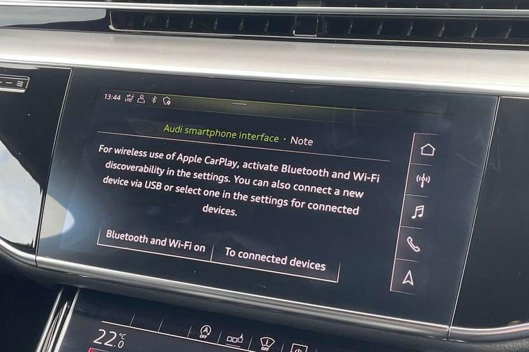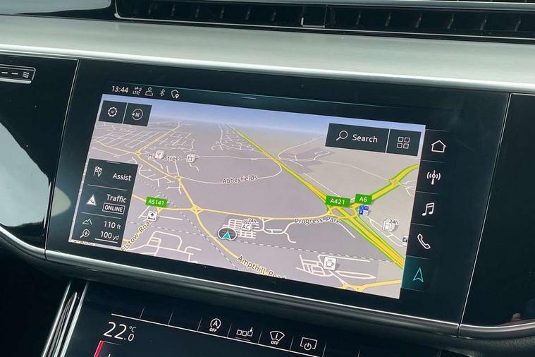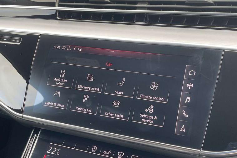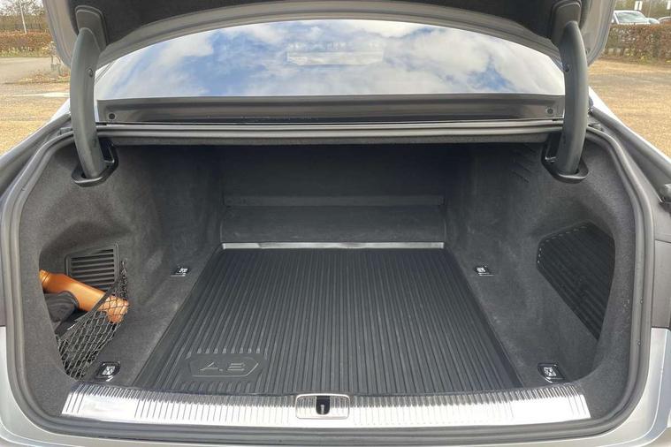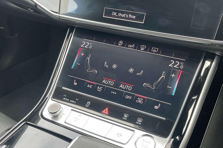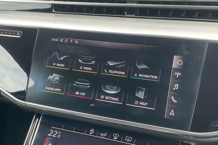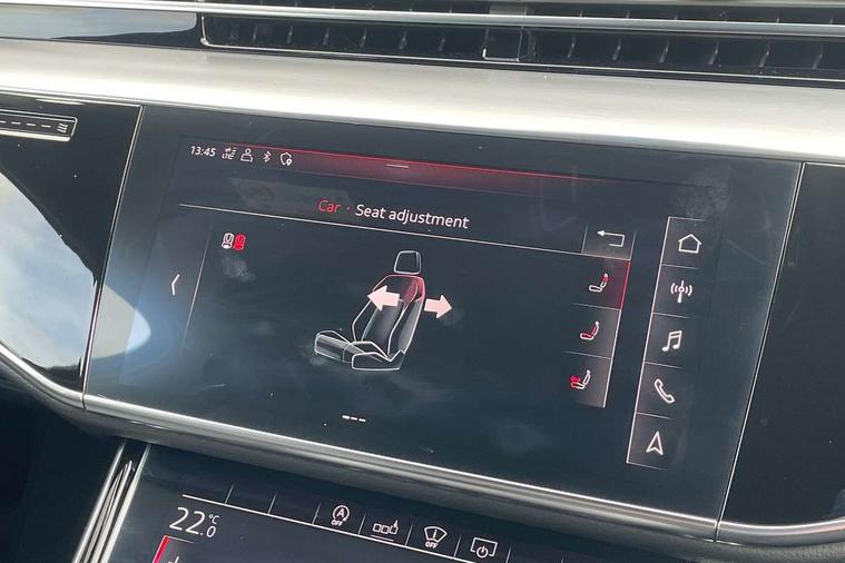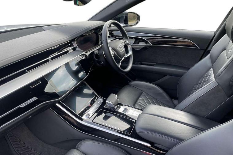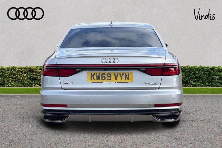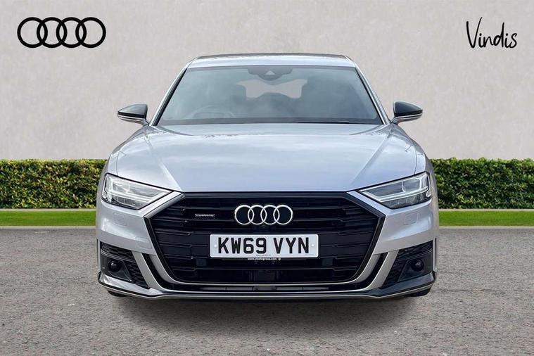 'Lights On' Reminder warning buzzer, Adaptive cruise assist with Stop and Go, Audi connect safety and service (e-call), Audi drive select, Audi phone box with wireless charging, Audi virtual cockpit, Audi wireless smartphone interface, Camera based traffic sign recognition, Colour driver's information system display, Electro - mechanical power assisted steering, Head up Display, Lane departure warning including emergency assist, MMI navigation plus with MMI touch, Operating buttons in black, glass with extended aluminium, Parking system plus - front + rear sensors, Power door closure, Power operated tailgate, Rear view camera, Remote fuel filler release, Service interval indicator, 24 litre AdBlue tank, 8 speed transmission with hill hold assist, Adaptive air suspension, Diesel particulate filter, Quattro all wheel drive with self locking centre differential, Audi music interface, Audi sound system, DAB digital radio module, DVD System, MMI radio plus, USB connection, Acoustic double glazing, Audi space frame, Auto dimming rear view mirror, Automatic headlight control system, Body colour bumpers, Body colour door handles, Body colour side protection with aluminium trim strips, Electric front windows, Electric rear windows with isolation switch, Electrically adjustable heated folding + automatically dimming exterior mirrors with memory function and integrated LED indicators, HD matrix healights with LED rear lights + dynamic rear indicators, Heat insulating darkened glass in side and rear windows, Heated rear window, Heated windscreen washer jets, High beam assist, LED brake lights, LED daytime running lights, Privacy glass, Reverse activated kerb-view adjustment on passenger's door mirror, Side skirts, Sports bumpers, 2 zone automatic air conditioning, 230V socket, 3 seater rear seat system, 4 way electric lumbar support for driver and front passenger, Centre console with cupholders, Climate controlled seats, Comfort centre armrest front, Door armrest with storage, Door pockets with bottle holder, Driver and front passenger side sunvisors with illuminated vanity mirrors, Dust/pollen filters, Electric adj front seatbelt height + memory, Electric auxiliary air heater, Electric front seats with memory function, Front centre armrest, Front/rear floor mats, Glove compartment cooling, Heated front seats, Height/reach electric steering column with easy exit function, Isofix child seat mounting points on outer rear seats, Leather gearknob, Passenger footwell storage net, Reading lights, Rear centre armrest, Rear headrests, Roof mounted sunglasses holder, Twin spoke leather multifunction steering wheel with gearshift paddles, Valcona leather upholstery with front sports seats in diamond quilted with S embossed logo, Black exterior styling pack - A8, LED ambient interior lighting pack - A8, 3 point seatbelts on all rear seats, ABS/EBD, Active front headrest system, ASR traction control, Audi pre sense basic, Audi pre sense front, EDL traction control, Electromechanical parking brake, ESP, Extended pedestrian protection measures, Front and rear side airbags with head airbag system, Front passenger airbag deactivation, Rear child proof door locks, Seatbelt reminder + electric contact in buckle + advanced safety equipment, Tyre pressure warning light, Warning triangle and first aid kit, Advanced key, Anti theft alarm tow away protection, Anti-theft wheel bolts and wheel loosening detection, Locking wheel bolts, Remote central locking, Dark matt brushed aluminium lower inlays, Piano black finish upper inlays,