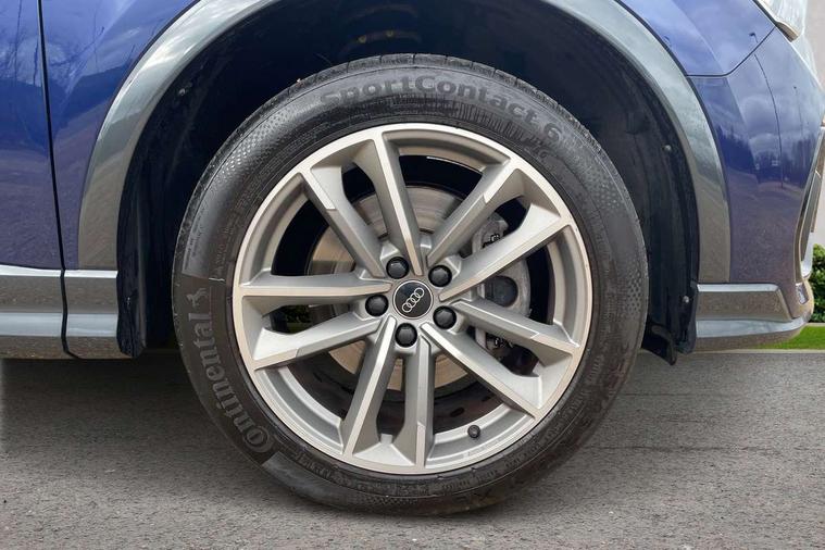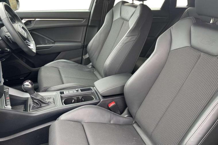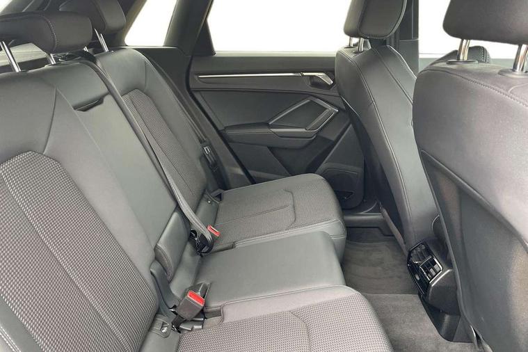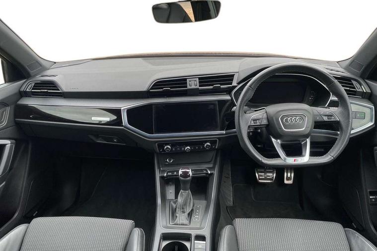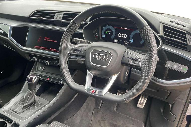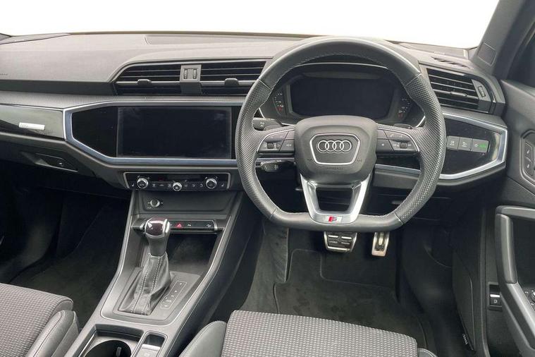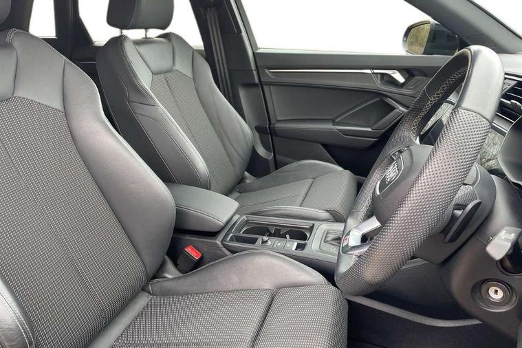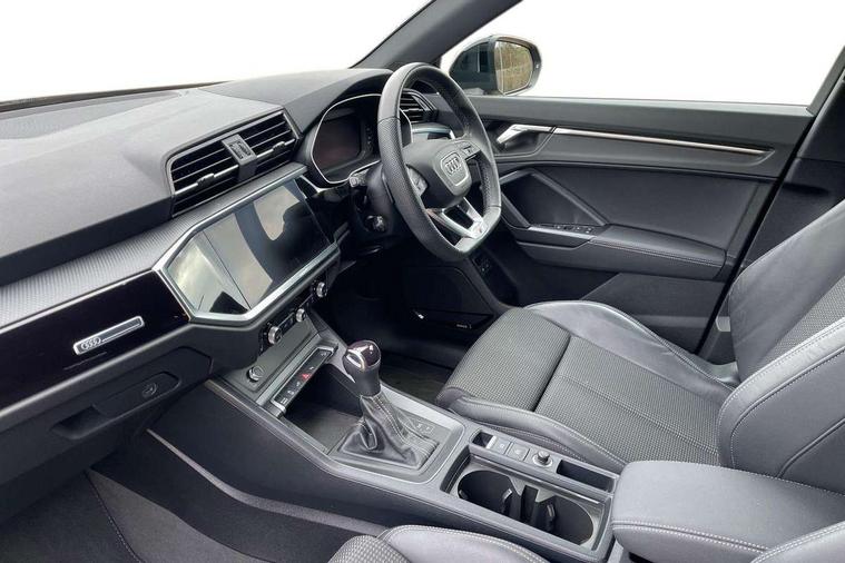 Amazon alexa Integration, Audi drive select, Audi lane departure warning, Audi Virtual Cockpit - 10.25" display, Bluetooth interface, Camera based traffic sign recognition, Legal emergency call, MMI Navigation Plus with high resolution 10.1 inch touchscreen colour display, Power operated tailgate, Progressive steering, Service interval indicator, Smartphone interface includes wireless Apple carplay/Android Auto, Start stop system with recuperation, Voice control system with natural language interaction, 3 pin 10 amp domestic charging cable, 3.6 kw On-board charger, Type 2 mode 3 32 amp charging cable, Type 2 socket for AC charging, 2 USB-C ports with charge and data functions, 6 passive loudspeakers, DAB digital radio module, Acoustic windscreen, Auto dimming frameless rear view mirror, Black roof rails, Electrically folding, adjustable and heated door mirrors with integrated LED side indicators and kerb view function for passenger side, Front and rear electric windows, Front fog lights, Grille vertical bars in aluminium silver/Matt, High gloss black finish B and C pillars, LED Dynamic rear indicators, LED headlights with LED daytime running lights, LED rear lights, LED third brake light, Privacy glass dark tinted rear and rear-side windows (from B-pillar backwards), Rain and light sensors, Rear diffuser grille in grained matt black, Rear diffuser strip in matt anthracite black, Rear side wing doors, Rear wiper, S line bumpers in contrasting Manhattan grey, Variable front intermittent wipers, 12V socket in rear centre console, 3 seat bench in 2nd row, 40:20:40 folding with manual adjustment for 60:40 forwards/backwards position and backrest angle, Adjustable rear seat bench/backrest with centre armrest and cupholder, Black cloth headlining, Dual zone electronic climate control, Front and rear black floor mats with contrast stitching in rock grey, Front and rear headrests, Front and rear roof module including reading lights, Front centre armrest, Glove compartment lighting, Height and reach adjustable steering wheel, Illuminated door sill trims with S logo, ISOFIX child seat mounting for front passenger with airbag deactivation and outer rear seat including top tether attachment point for outer rear seats, Luggage compartment light, Manual front seats with height adjustment, Perforated leather gearknob, Single front passenger seat, Stainless steel luggage compartment sill finisher, Stainless steel pedals, Ambient lighting pack - Q3, Black styling pack - Q3, Non smoking pack - Q3, 3x3 point rear seatbelts, 6 airbags - Driver, front passenger, curtain and side windows, Audi pre-sense front with pedestrain and cyclist recognition, Electrically operated child locks on rear doors, Electromechanical parking brake, Electronic stabilisation control including ABS, ASR and EDL, Front seatbelt reminder, Hill descent control, Hill hold assist, Pre sense basic, Seatbelt monitoring, Tyre pressure warning, Warning triangle and first aid kit, Anti theft alarm, Anti theft wheel bolts, Immobiliser, Remote central locking, Aluminium look interior elements, Detail dashboard around MMI touch colour display in glass look, black with surround in aluminium look, Leatherette door armrest, Piano black inlay, 19" 5 twin arm design diamond cut audi sport alloy wheels in matt grey look, Tool kit, Tyre repair kit,
