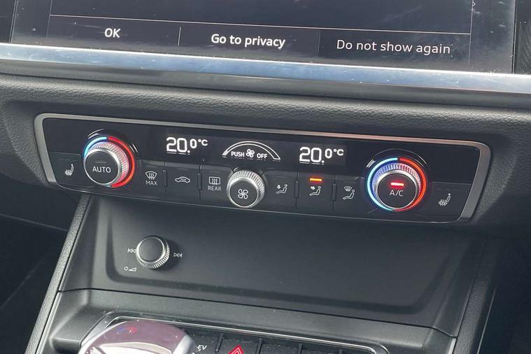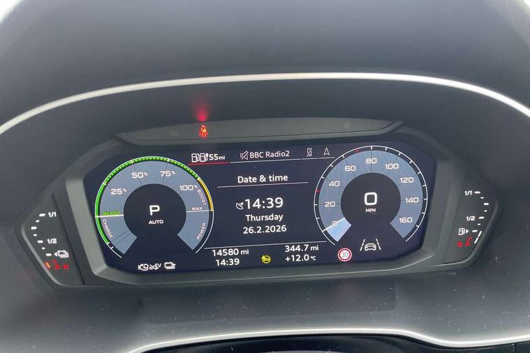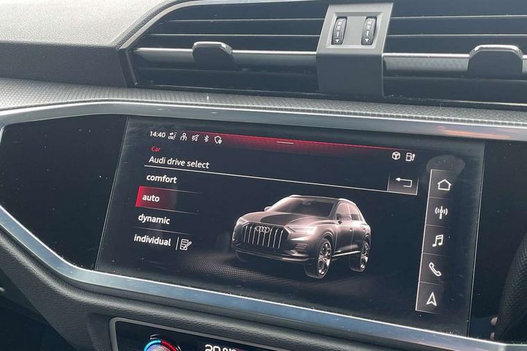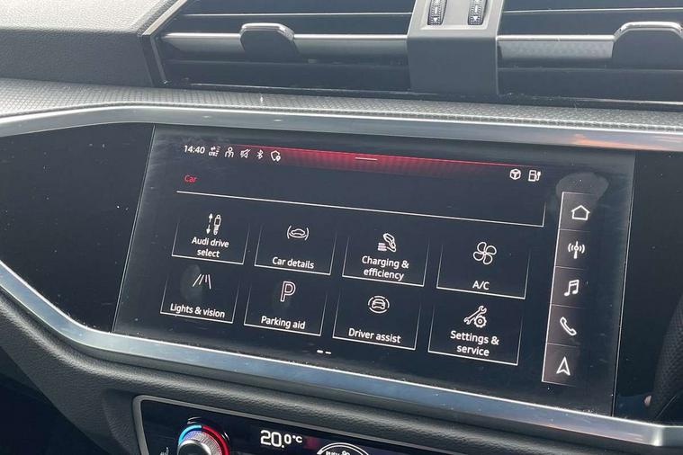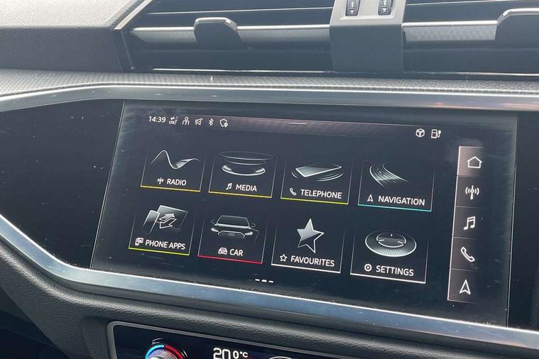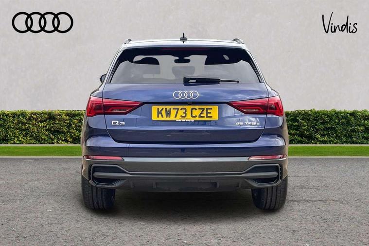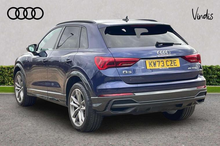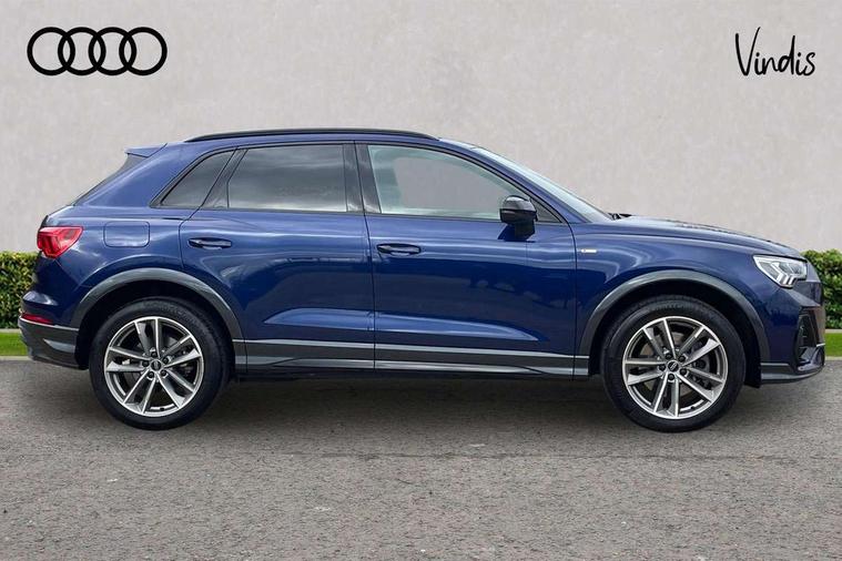 Amazon alexa Integration, Audi drive select, Audi lane departure warning, Audi Virtual Cockpit - 10.25" display, Bluetooth interface, Camera based traffic sign recognition, Legal emergency call, MMI Navigation Plus with high resolution 10.1 inch touchscreen colour display, Power operated tailgate, Progressive steering, Service interval indicator, Smartphone interface includes wireless Apple carplay/Android Auto, Start stop system with recuperation, Voice control system with natural language interaction, 3 pin 10 amp domestic charging cable, 3.6 kw On-board charger, Type 2 mode 3 32 amp charging cable, Type 2 socket for AC charging, 2 USB-C ports with charge and data functions, 6 passive loudspeakers, DAB digital radio module, Acoustic windscreen, Auto dimming frameless rear view mirror, Black roof rails, Electrically folding, adjustable and heated door mirrors with integrated LED side indicators and kerb view function for passenger side, Front and rear electric windows, Front fog lights, Grille vertical bars in aluminium silver/Matt, High gloss black finish B and C pillars, LED Dynamic rear indicators, LED headlights with LED daytime running lights, LED rear lights, LED third brake light, Privacy glass dark tinted rear and rear-side windows (from B-pillar backwards), Rain and light sensors, Rear diffuser grille in grained matt black, Rear diffuser strip in matt anthracite black, Rear side wing doors, Rear wiper, S line bumpers in contrasting Manhattan grey, Variable front intermittent wipers, 12V socket in rear centre console, 3 seat bench in 2nd row, 40:20:40 folding with manual adjustment for 60:40 forwards/backwards position and backrest angle, Adjustable rear seat bench/backrest with centre armrest and cupholder, Black cloth headlining, Dual zone electronic climate control, Front and rear black floor mats with contrast stitching in rock grey, Front and rear headrests, Front and rear roof module including reading lights, Front centre armrest, Glove compartment lighting, Height and reach adjustable steering wheel, Illuminated door sill trims with S logo, ISOFIX child seat mounting for front passenger with airbag deactivation and outer rear seat including top tether attachment point for outer rear seats, Luggage compartment light, Manual front seats with height adjustment, Perforated leather gearknob, Single front passenger seat, Stainless steel luggage compartment sill finisher, Stainless steel pedals, Ambient lighting pack - Q3, Black styling pack - Q3, Non smoking pack - Q3, 3x3 point rear seatbelts, 6 airbags - Driver, front passenger, curtain and side windows, Audi pre-sense front with pedestrain and cyclist recognition, Electrically operated child locks on rear doors, Electromechanical parking brake, Electronic stabilisation control including ABS, ASR and EDL, Front seatbelt reminder, Hill descent control, Hill hold assist, Pre sense basic, Seatbelt monitoring, Tyre pressure warning, Warning triangle and first aid kit, Anti theft alarm, Anti theft wheel bolts, Immobiliser, Remote central locking, Aluminium look interior elements, Detail dashboard around MMI touch colour display in glass look, black with surround in aluminium look, Leatherette door armrest, Piano black inlay, 19" 5 twin arm design diamond cut audi sport alloy wheels in matt grey look, Tool kit, Tyre repair kit,