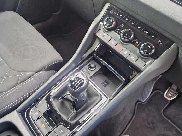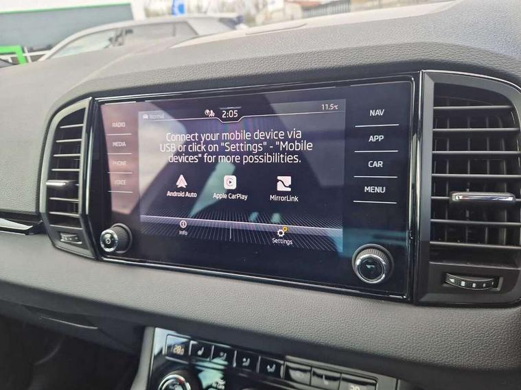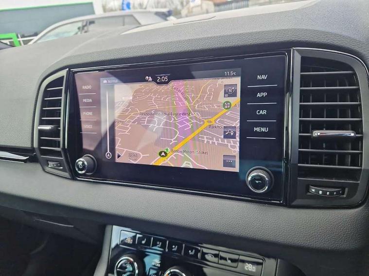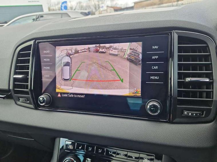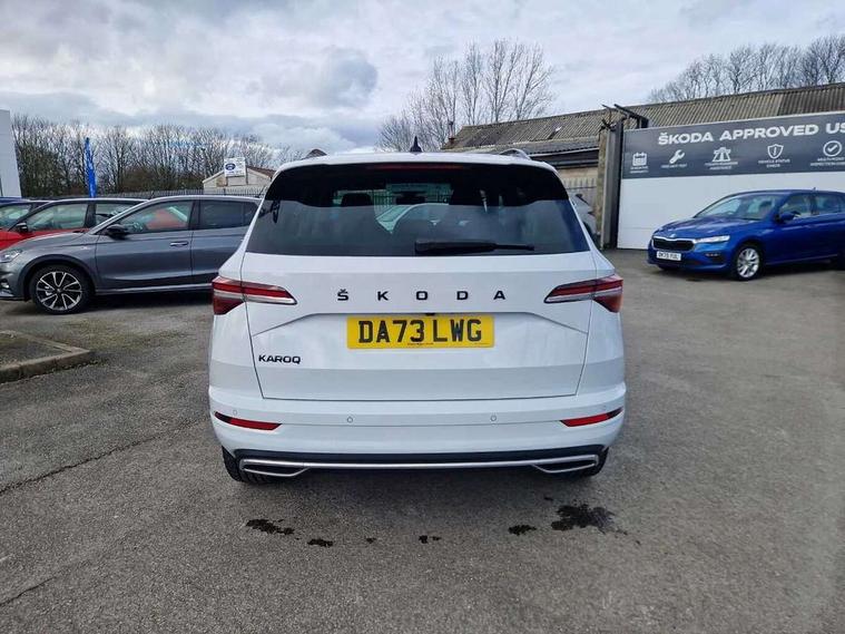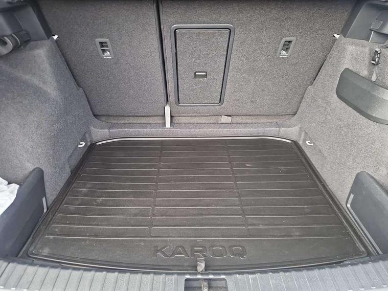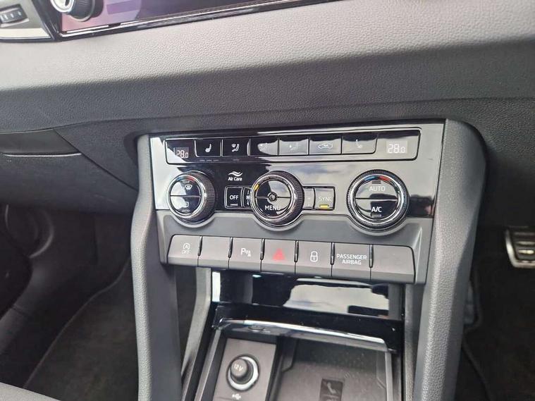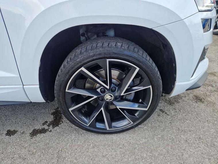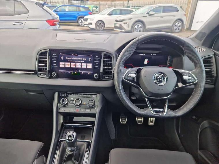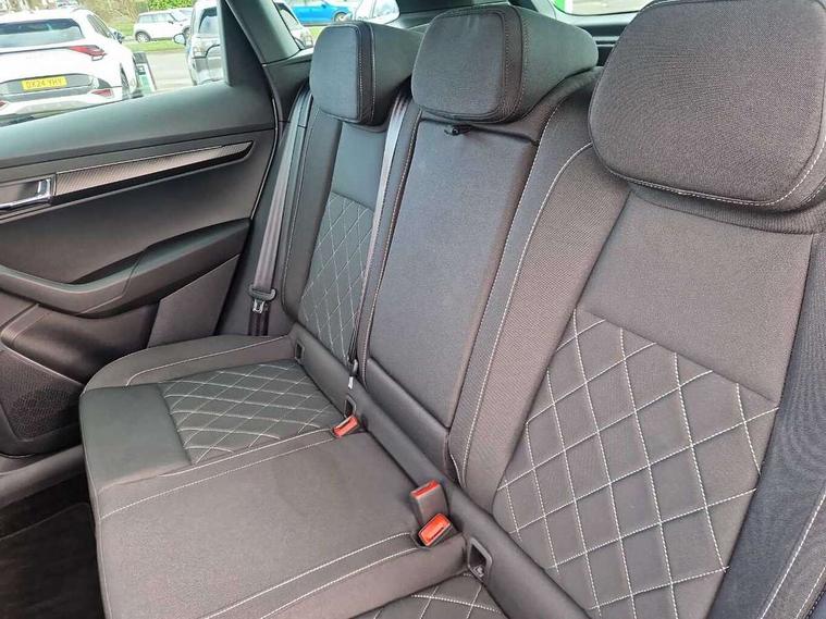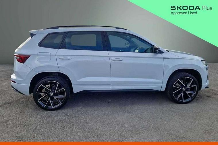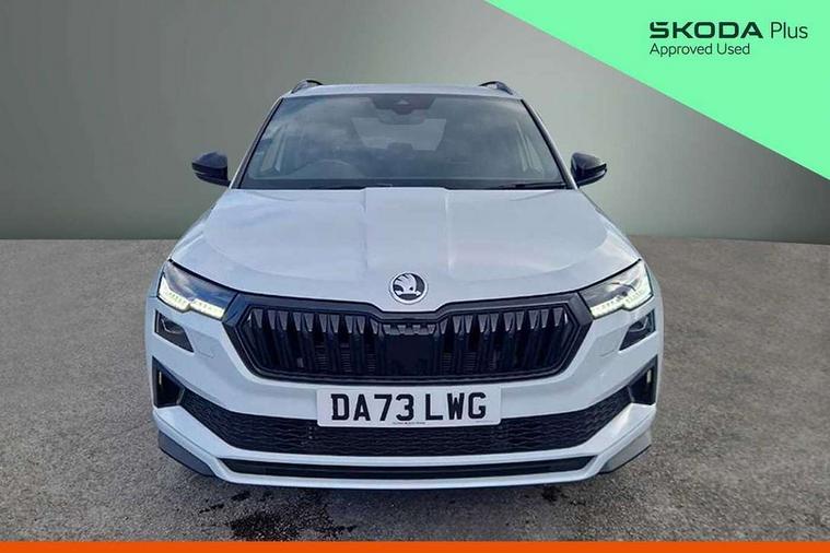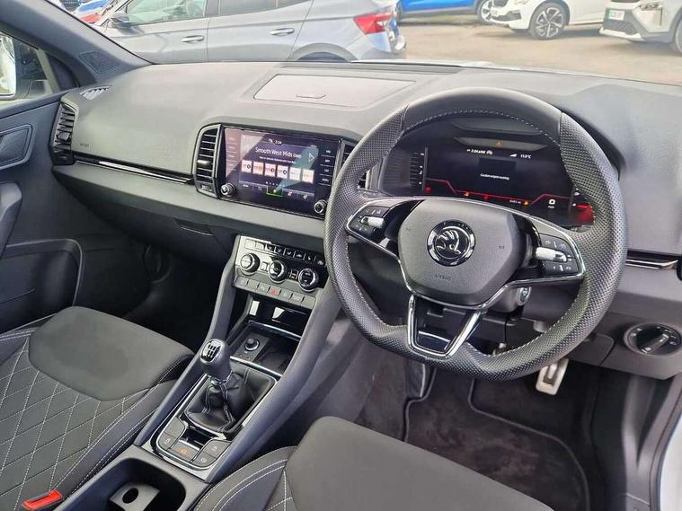 8" Digital display, Care connect, Driver fatigue sensor, Emergency services call system, Outside temperature gauge, Service interval indicator, SmartLink wireless for Apple and wired for Android, Start/stop system with regenerative braking, USB C Port x 2 in front centre console, Virtual cockpit, Virtual pedal with electrically operated boot door, 8 Speakers, DAB radio with Bluetooth, USB connection, Wireless charging without wireless aerial connection, Acoustic glass, Aero front windscreen wipers with intermittent function, Auto dimming rear view mirror with light and rain sensors, Black door mirrors, Black electric window control buttons, Black radiator grille, Black roof rails, Body colour door handles, Electric front and rear windows with child proof lock, Front door steps with SportLine logo, Heated rear windscreen, LED daytime running lights, LED rear lights with high functionality welcome effect and dynamic indicators, Light assistant (coming/leaving home/tunnel light), Panoramic sliding sunroof, Plastic scuff plates, Privacy glass, Protective door side sills in body colour, Rear diffuser, Rear side wing doors, Rear spoiler, Rear window wiper with washer system and intermittent control, Safety reflectors on front doors, Skoda lettering on tailgate in black, Sportline badge on front fender, Sportline decorative inserts with badging, Sports front and rear bumpers, 1.5 litre bottle holders in driver and front passenger door panels, 12V socket in boot, 12v socket in front centre armrest with storage compartment and rear air vents, 3 rear height adjustable headrests, 3 seat bench in 2nd row, 3 spoke leather sports multifunction steering wheel and silver stitching, 4 foldable roof handles with rear coat hooks, Black floor carpet, Black roof headlining, Chrome inner door handles, Double sided boot floor, Foldable hooks in the boot, Front head restraints, Height adjustable front three point seats belts with tensioners, Height/reach adjust steering wheel, Ice scraper, Illuminated glovebox, Illuminated luggage compartment, Isofix child seat preparation outer rear, Manual lumbar support for front seats, Pen holder, Pollen filter, Rear boot cover, Rear reading lights, Rear seats fixed folding and divided 60:40, Rubbish bin door, Safety vest holder, Single front passenger seat, Storage box in upper central dashboard closed, Sunvisors with illuminated vanity mirrors, Textile floor mats, Ticket holder, Titan black interior ceiling, Welcome animation with sportline logo, Boot pack - Karoq, Light Pack - Karoq, Parking pack - Karoq, Automatic door unlocking in case of crash, Automatic fuel cut off in case of crash, Child locks on rear doors, Driver airbag, Electronic parking brake with auto hold function, Emergency rear braking signal, ESC including ABS, MSR, ASR, EDS, HBA, DSR, RBS, MKB and traction control, Front side airbags, Hill hold control, Knee airbags, Passenger airbag with switch-off function, Pedestrian monitor, Seatbelt reminder signalisation and pretensioner for all seats, Three point seatbelts rear, Two tone horn, Tyre pressure display, Tyre pressure monitor, Alarm with interior monitoring, back up horn and tilt sensor with safe function, Electronic engine immobiliser, Keyless entry and start/stop, Remote central locking with 2 remote folding keys, Black air vent surround, Black centre console, Satin black dashboard, Satin black door trim, 19" Sagitarius anthracite alloy wheels with matt black aero inserts, Anti-theft wheel bolts protection, Matt black aero hub caps, Tool kit,