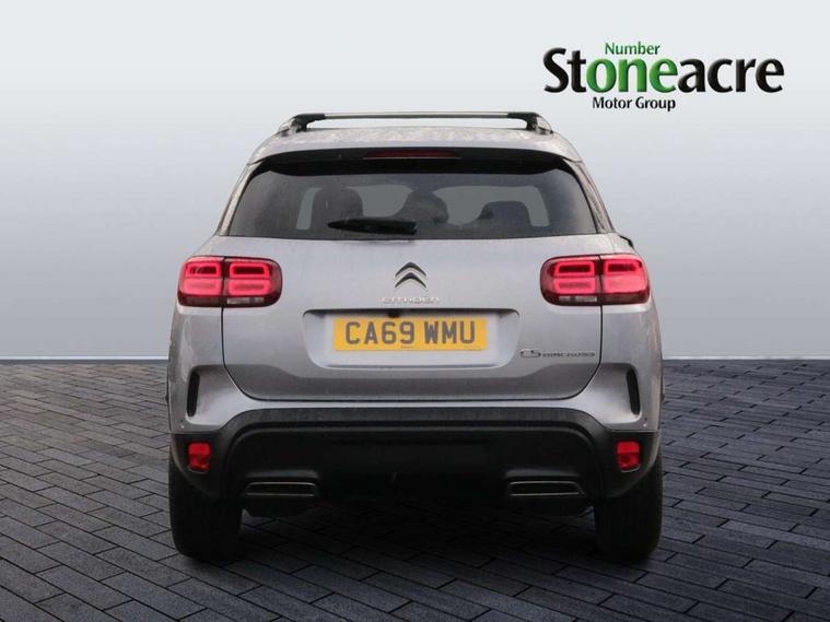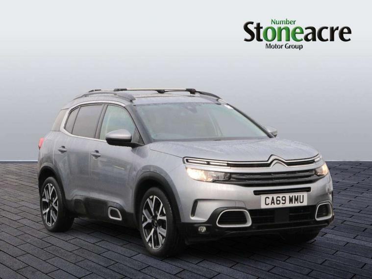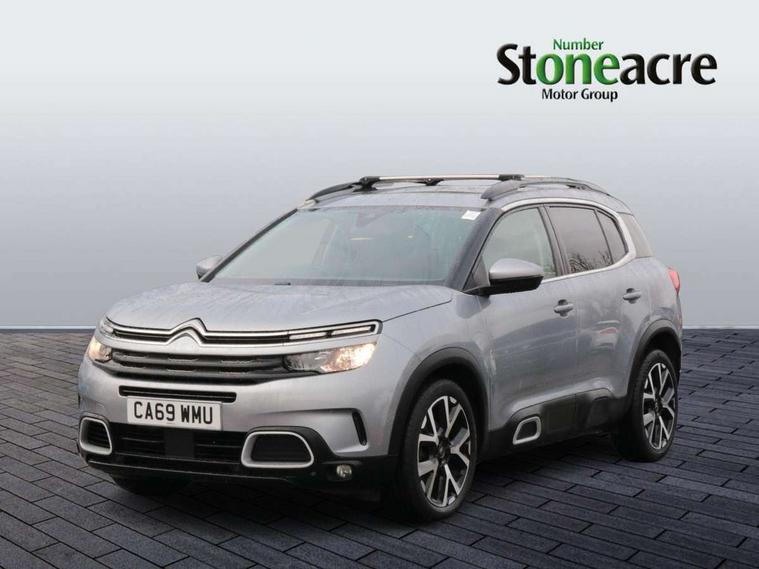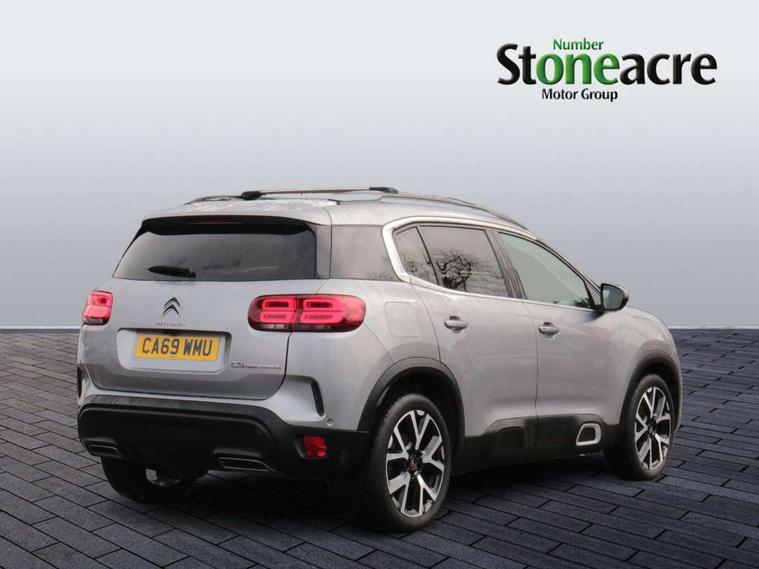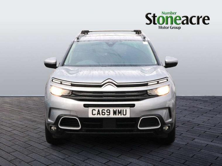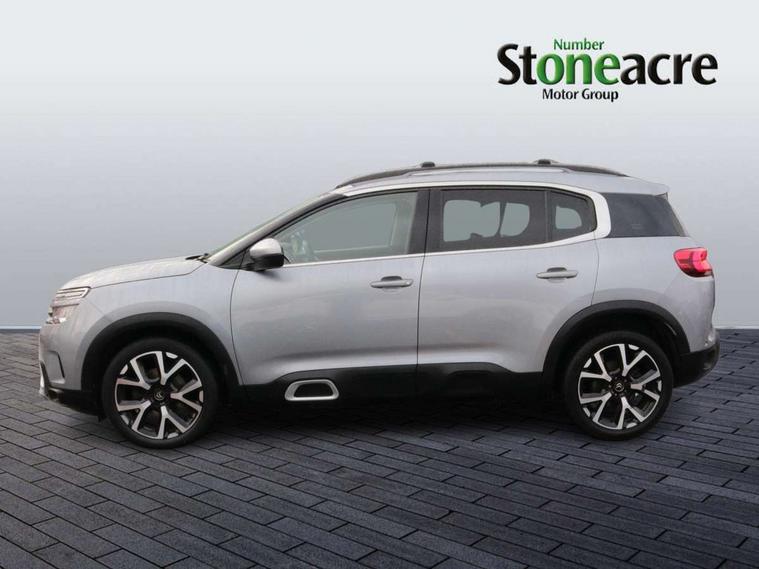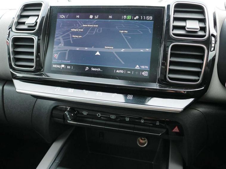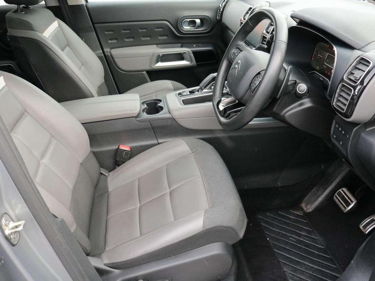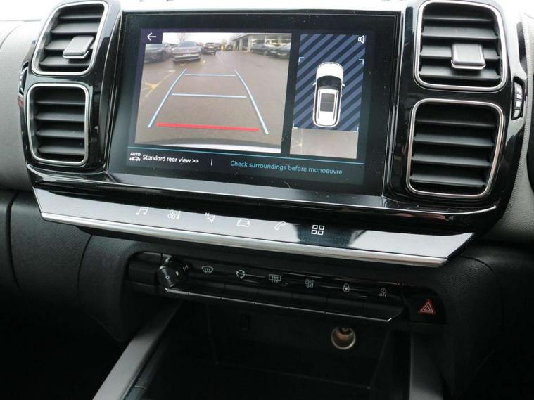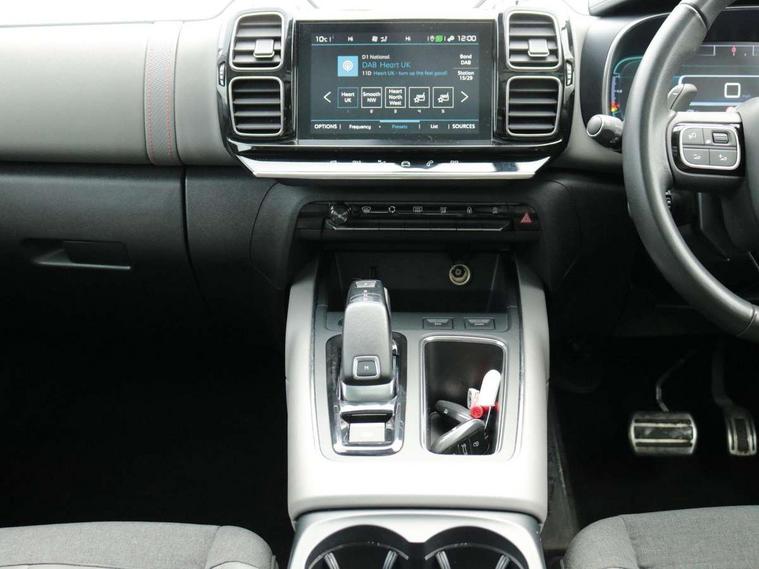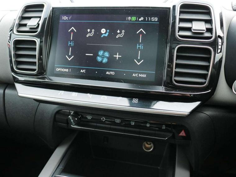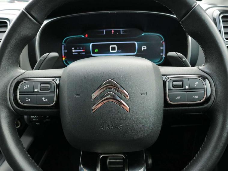 12.3" customisable TFT instrument display, Active blind spot monitoring system, Active cruise control with stop and go, Active lane departure warning system, Bluetooth telephone facility, Central 8" capacitive touch screen, Citroen connect box emergency assist system, Citroen connect Nav with connect box, Citroen connected CAM, Coffee Break Alert, Driver attention alert system, Eco+ mode, Electric power steering, Extended traffic sign recognition and recommendation, Exterior temperature indicator with ice warning, Foot operated hands free tailgate includes keyless entry and start, Gear efficiency indicator, Highway driver assist, Mirror screen with mirror link, apple carplay and android auto, Multi function trip computer, Park assist function with auto parallel and bay parking, Rear parking sensors, Reversing camera displayed on the central screen, Speed limit recognition and recommendation, Suspension with Progressive Hydraulic Cushions, 2 USB sockets, Auxiliary input socket, DAB (Digital Audio Broadcasting), AM/FM and MP3 compatible radio with two tweeters and four speakers, Voice recognition for radio, navigation and telephony features, 3D effect LED rear lights, Acoustic laminated front windows, Acoustic laminated windscreen with rain and brightness sensors, Airbump panels with colour insert on lower portion of the doors, Auto dimming electrochrome rear view mirror, Automatic headlight activation via windscreen mounted sensors, Automatic triggered rear windscreen wiper in reverse gear, Automatic windscreen wipers, Body colour door handles, C5 Aircross monogram on boot rear, Citroen logo and monogram on rear, Dark tinted rear windows and rear windscreen, Electric, heated and folding door mirrors with integrated LED indicator and kerb puddle light, Front fog lights with cornering function, Front windscreen wiper with magic wash cleaning system, Gloss black finish on A and B pillar and aerodynamic trim, Gloss black upper and matte black lower grille, Guide me home headlight function, Halogen headlights, Halogen rear fog lights, Halogen rear number plate lights, Headlights left on audible warning, Heated rear windscreen with integrated antenna, High level LED centre brake light, Intelligent high beam headlights (auto dipping main beams), LED daytime running lights, LED front indicators, Longitudinal roof bars, Matte black lower rear skirt, Matte black rear bumper facia, Matte black side sill with anodised silver colour touch, Matte black wheel arch extensions, One touch electric front/rear windows with pinch protection, Painted front bumper, Painted rear bumper, Panoramic opening glass roof with electric blind, Roof coloured rear spoiler, Satin chrome C signature, Satin chrome window surround, Twin exhaust effect trim, 12V socket in boot, 12V socket in cabin, 2 Central illuminated cup holders, 2 Position boot floor, 2 way lumbar adjustment for driver, 2x Rear coat hooks, 3 Independent full size rear seats with adjustable recline angle, 3x Grab handles retractable with damping, Advanced comfort seats, Air recirculation when reverse gear is engaged, Aluminium pedals and foot rest, Anti odour and pollen filter, Central front armrest with butterfly wing opening and illuminated storage compartment, Dashboard open central storage compartment, Dimmable white mood lighting, Dual zone automatic climate control, Electric driver seat adjustment (height, fore/aft and backrest angle), Fixing rings 4 in load compartment, Front + rear carpet mats, Front and rear LED welcome/LED rear reading lights, Front door pockets store up to 1.5L bottle and A4 note pad, Front seat back map pockets, Height and reach adjustable leather steering wheel with 2 control zones, Hinged rear parcel shelf, Isofix child seat preparation for front passenger seat, Leather interior door handles, Leather steering wheel with satin chrome inserts and radio controls, Manual passenger seat adjustment (height, fore/aft and backrest angle), Multi function steering wheel, Open central storage area below touch screen, Open storage area next to gear selector, Rear centre console ventilation system, Rear door pockets store up to 0.5L bottle, Rear passenger air vents, Satin chrome digital instrument panel and touchscreen trim, Satin chrome gear lever, Satin chrome interior door handles, Seatbelt not fastened audible and visual alert for front seats, Seatbelt unfastened on the move audible and visual alert for front and rear seats, Smooth opening flocked glove box with lighting, Stainless steel front Citroen embossed sill scuff plates, City camera pack - C5 Aircross, Safety plus pack - C5 Aircross, 2x Isofix child seat fitting on outer rear seats, 3x Rear three point retractable seatbelts with pretensioners and force limiters in the outer rear seats, ABS/EBD, Adaptive driver and front passenger airbags with passenger airbag deactivation function, Collision risk alert, Driver and front passenger side airbag, DSC (Dynamic Stability Control) and ASR (Electronic Anti-skid System), Electric child locking functionality on rear windows and doors, Electronic parking brake, ESP including traction control and stability programme, Front and rear curtain airbags, Front optimised safety headrests and 3 x rear retractable headrests with height adjustable, Front three point retractable seatbelts height adjustable with pre tensioners and force limiters, Front ventilated disc brakes and rear disc brakes, Hill start assist, Post collision safety brake, Two tone horn, Tyre under inflation indicator, Alarm - perimetric and volumetric alarm with anti-lifting mechanism, Automatic door locking, Automatic hazard light activation upon heavy brake application, Electronic code immobiliser, Keyless entry and start, Remote central locking + deadlocks, Gloss black touch screen surround with integrated tactile buttons and chrome finisher, Leather effect dashboard facia, Satin chrome air vent decors, Soft touch matte dashboard with grey insert,