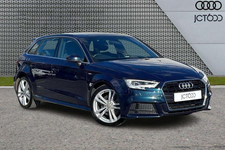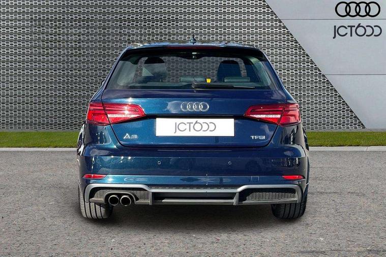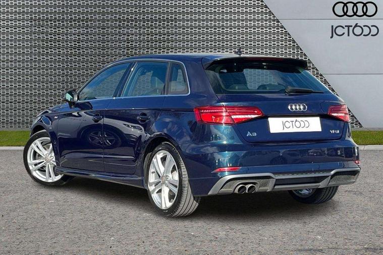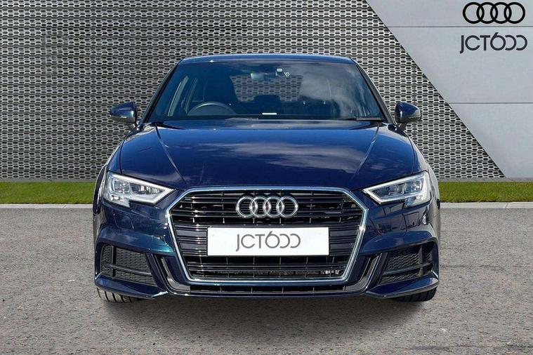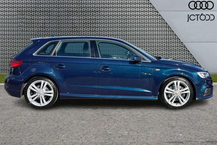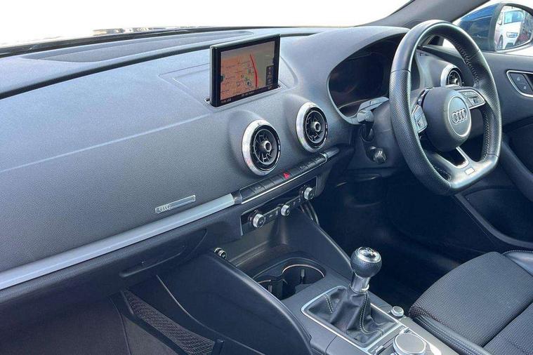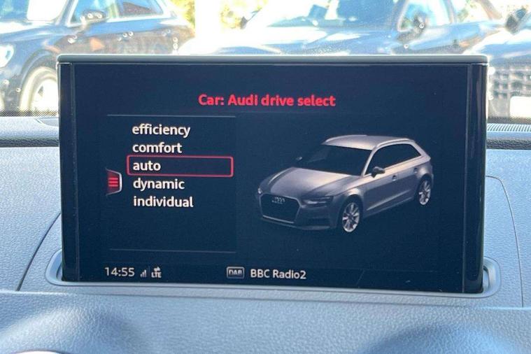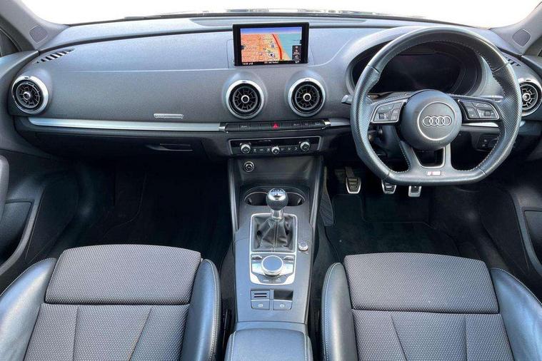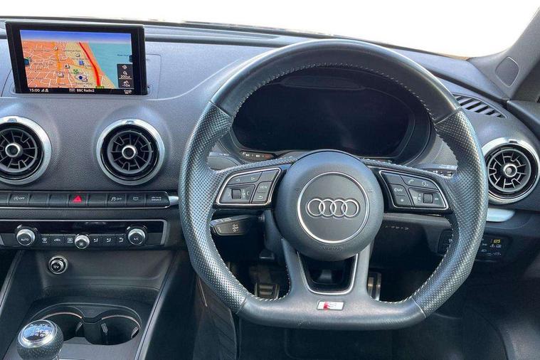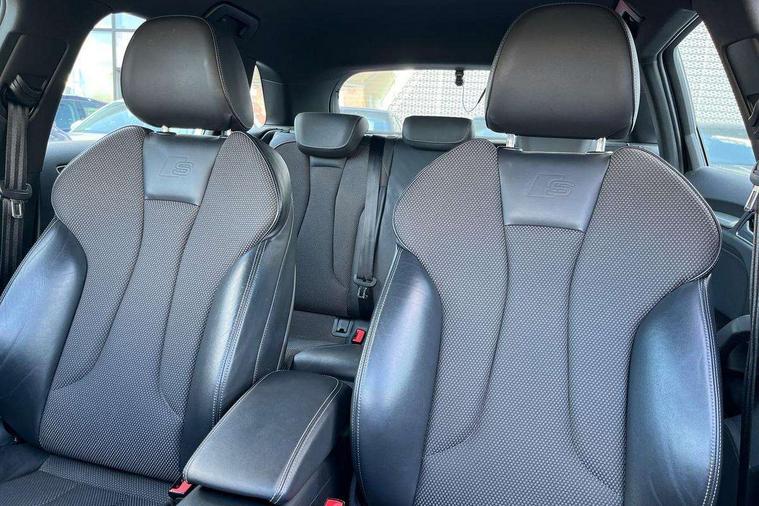 Audi connect, Audi drive select, Audi smartphone interface, Colour driver's information system display, Electro-mechanical PAS, HDD satellite navigation system radio single CD/DVD player MMI control system, Mobile telephone preparation - bluetooth interface, Service interval indicator, Speed limit display, Voice control system, 2 USB ports, Audi music interface, Auxiliary input socket, CD player, DAB Digital radio, MMI radio plus with 7" colour MMI screen and MMI controller, Aluminium window trim, Auto dimming rear view mirror with light and rain sensors, Body colour bumpers, Body colour door mirrors with integral indicators, Body colour roof spoiler, Chrome exhaust tailpipes, Electric front windows, Electric operated/heated door mirrors, Electric rear windows, Heated windscreen washer jets, LED daytime running lights, Matt black radiator grille, Rear wiper, S Line body styling, Sport specific side air inlet grille and diffuser insert, 3 adjustable rear headrests, 3 spoke flat bottomed multi-function leather steering wheel, 4 lashing points to secure luggage, Adjustable front armrest, Black cloth headlining, Dual zone electronic climate control, Front and rear interior lights with delay, Front passenger seat isofix location point, Front sports seats, Front/rear floor mats, Height/depth adjustable steering column, Illuminated glovebox, ISOFIX child seat preparation+airbag deactivation, Jack and tool kit, Stainless steel pedals, Storage compartment in centre console, Storage compartment under front seats, Storage compartments in doors, LED interior light pack - A3/RS3, Non smoking pack - A3, Storage and luggage pack - A3/RS3, 3 point seatbelts on all seats, ABS/EBD, Active bonnet, Active front headrests, ASR, Curtain airbags, Driver and passenger side airbags, Driver/Front Passenger airbags, Drivers knee airbag, EDL, Electromechanical parking brake, ESC - Electronic Stability Control + traction control, Front passenger airbag deactivation, Manual rear child locks, Multi-Collision braking, Seatbelt warning, Tyre pressure warning, Warning triangle and first aid kit, Anti theft alarm, Anti-theft wheel bolts, Remote control central locking, Thatcham category 1 alarm + immobiliser, Aluminium air vent surrounds, Aluminium trim elements, Matt brushed aluminium inlays, Space saver spare wheel,