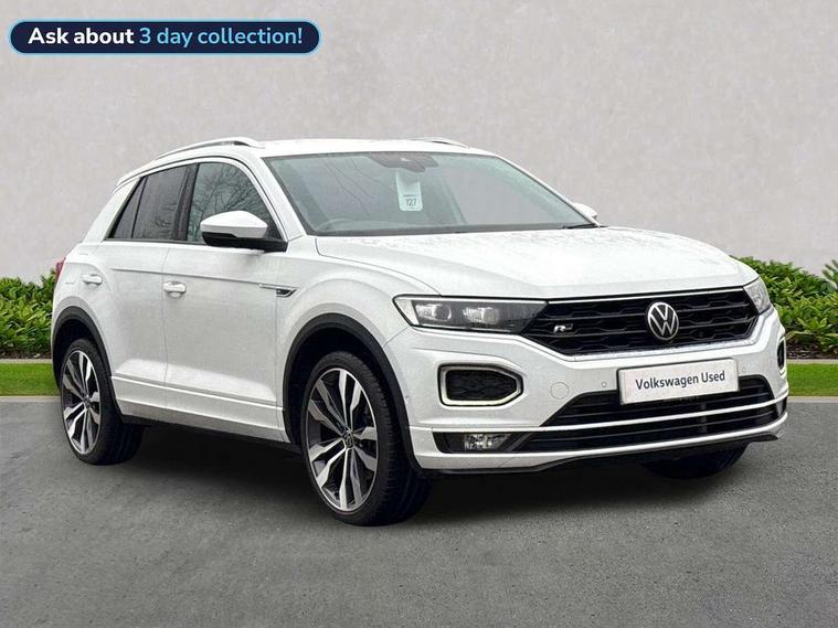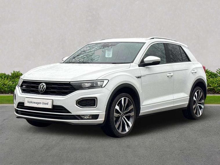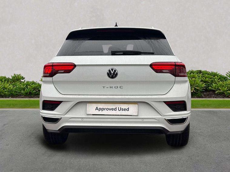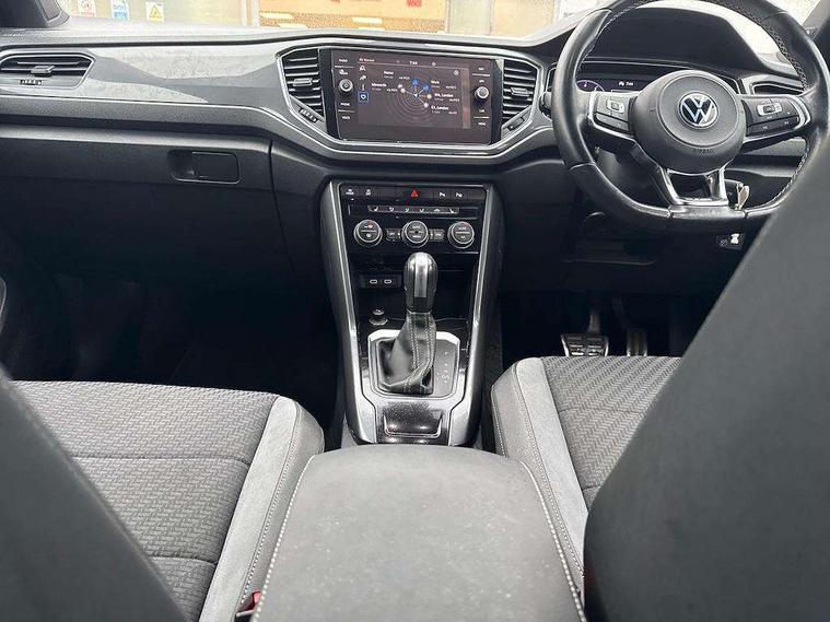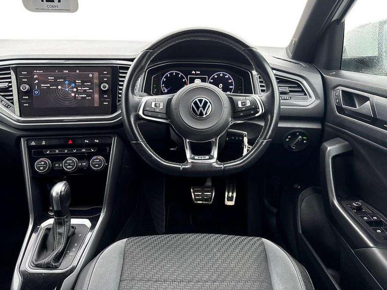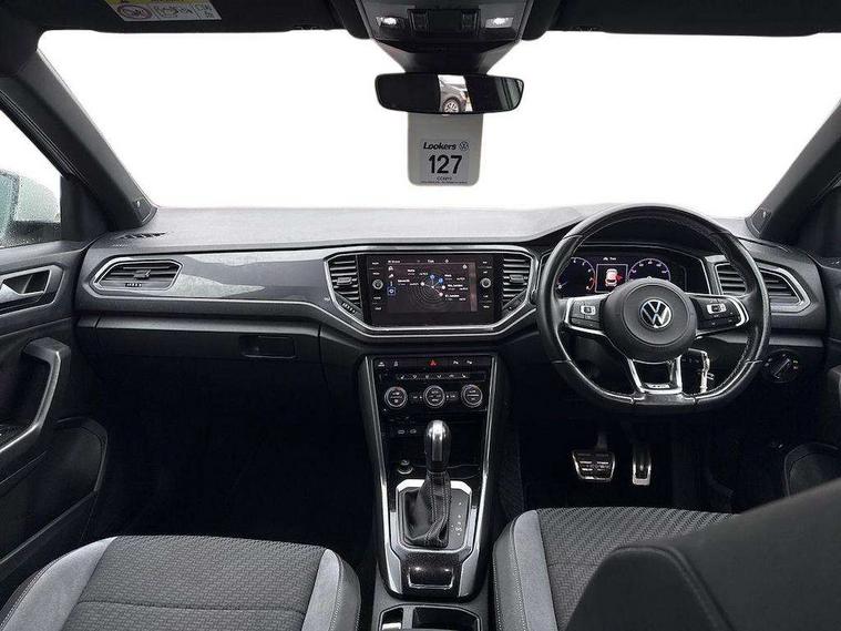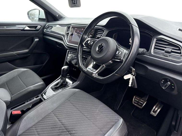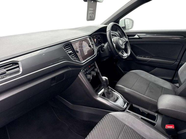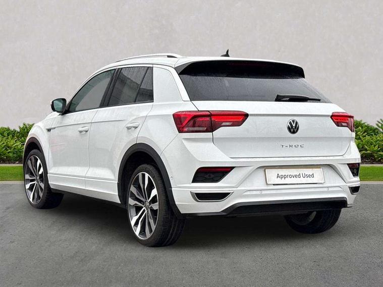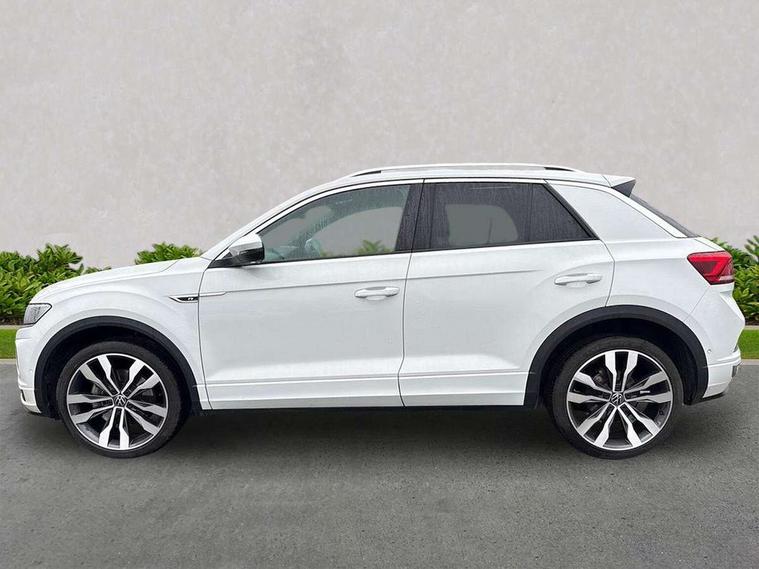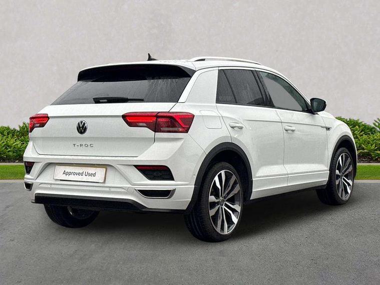 'Lights On' Reminder warning buzzer, Adaptive cruise control, Bluetooth telephone and audio connection for compatible devices, Car information display, Digital Cockpit Pro - Active info display, Driver alert system with audible and visual fatigue detection system, Driver tips and journey analysis, Emergency call service, Lane assist with warning text instrument cluster, Modified key software - reduce switch off time for key status change to Long no motion, Multifunction camera, Multifunction computer with visual gear change recommendation for fuel consumption, Navigation system discover media including streaming and internet, Service interval indicator, Think blue trainer driver tips and journey analysis, Traffic sign recognition, Voice activation, Warning sound and light for front seatbelts unfastened, Wireless app connect for apple carPlay, Battery regeneration during braking, Rear shock absorption for sports version, Start/stop function with battery regeneration, DAB Digital radio, Disk brakes in front, Diversity antenna for FM reception, Music playback - MP3, WMA and AAC files, Premium USB cable in choice of either Apple or Android smartphone compatibility, SD card slot, Simultaneous pairing of 2 compatible mobile devices, SMS functionality - read, compose and send SMS messages using touch-screen display, Storage compartment with longitudinal and height adjustable in armrest and two rear air vents, Three route options - Fast, Short, Eco, Title and cover art display, USB-C Interface and USB charging socket, Auto dimming interior rear view mirror, Automatic coming/leaving home lighting function and daytime running lights, Automatic hazard lights activation under emergency braking, Black grained lower door protectors, Body colored door lower parts, Body colour door handles, Body colour rear roof spoiler, Chrome effect left and right trapezoid exhaust tailpipe fascia surround, Chrome plated moldings, Chrome trim on upper and lower radiator grille, Dusk sensor, Dynamic headlight range control with self adjusting whilst driving, Electrically foldable, adjustable and heated door mirrors with puddle lights and reverse activated kerb-view adjustment on passenger's door mirror, External USB type C socket and charging sockets, Front and rear electric windows, Front fog lights with static cornering function, Front windscreen wiper with intermittent wipe and 4 position delay, Fully galvanised body, Heated rear window, Heated windscreen washer jets, High level 3rd brake light, LED darkened rear light clusters, LED headlamps with automatic range adjustment and unique signature LED separate daytime running lights, LED rear number plate lights, LED tail lamp rear comination lamps, Privacy glass, R-Line design body coloured bumpers, Rain sensor, Rear tinted glass from B-pillar backwards approx 65% tinted, Rear wash/wipe with intermittent wipe setting, Silver anodised roof rails, Volkswagen roundel, 12V socket in centre console storage area, 3 rear head restraints, 4 load lashing points in luggage compartment, Aluminium pedals, Black roof lining and sun visors, Branded points of interest, Carbon flag cloth upholstery, Chrome plated radiator grille inserts, air vent surrounds and light switch surrounds, Climate control - 2 zone electronic air conditioning with automatic air recirculation and allergy filter, Door and side trim panel, Door and side trim panel in foam film, insert in leatherette, Drawer under drivers seat, Front + rear carpet mats, Front centre armrest, Front cupholders x 2, Front seat back storage pockets, Front sports seats with R-Line logo on seat backrest, Glovebox, Heated front seats, Height adjustable front seats, Height/reach adjust steering wheel, Instrument lighting, white adjustable panel illumination, Interior light delay, Interior light in footwell, Isofix easy fit child seat preparation for 2 outer rear seats, Leather gearshift knob, Leather multi function sport steering wheel with gear change selection via paddle shift on steering wheel, LED interior light with switch off delay/dimmer and 2 front/rear LED reading lights, Load through provision with single cup holder when folded down, Luggage compartment cover, removable, Luggage compartment lighting, R Line badge, Scuff plates in door apertures, Split folding rear seat backrests with centre armrest, Stainless steel pedals, Storage compartment in left and right luggage area, Storage compartment in rear doors, Storage compartments in driver and front passenger doors, Sunvisors with illuminated vanity mirrors, Unique R Line door sill protectors, White ambient lighting, R line styling pack - T-Roc, Winter pack - T-Roc, 3 rear three point seatbelts, ABS, Curtain airbags, Driver and front passenger safety-optimised head restraints, Drivers and front passengers airbags with passengers deactivation switch, Drivers seatbelt reminder, Electronic parking brake with auto hold, Electronic stability control (ESC) includes ASR, EDL, EDTC and trailer stabilisation function, Front assist with city emergency braking and pedestrian monitoring, Front seat side impact airbags, Hill start assist, Predictive pedestrian protection, Rigid safety cell with front and rear crumple zones, Single tone horn, Three point height adjust front seatbelts + pretensioners, Tyre pressure loss indicator, Ventilated front and rear disc brakes, Volkswagen roadside assistance, Alarm with remote central locking and interior protection, Electronic engine immobiliser, Remote central locking with SAFELOCK, radio remote control with 2 remote control folding keys, Shadow grey decorative inserts in dash, centre console and door panel, 19" Suzuka alloy wheels with low rolling resistance tyres and anti wheel bolts,