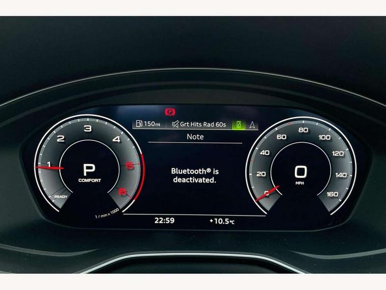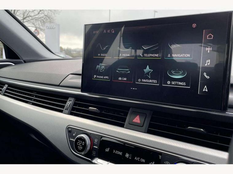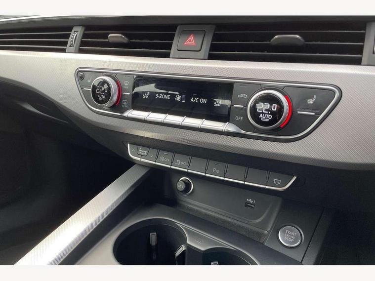 Audi connect safety and service (e-call), Audi drive select, Audi parking system plus with front and rear sensors, Audi smartphone interface, Audi virtual cockpit, Automatic start-stop system with coasting functionality and efficiency programme, Bluetooth interface, Cruise control system with speed limiter, Electric boot lid release, Electromechanical power steering, MMI Navigation plus with MMI touch includes 10.1" high resolution colour MMI display, 3D map, Rear view camera, Voice control system, Comfort dynamic suspension, 2 USB charging ports, 8 passive loudspeakers, DAB digital radio reception, Auto dimming rear view mirror, Body coloured door mirrors, Electrically folding auto dimming/adjustable/heated door mirrors with LED side indicators and kerb view function for passenger side, LED headlights and rear lights with LED daytime running lights, New design rear diffuser, Rain and light sensors, Windscreen with acoustic glazing, 3 spoke high multi-function leather sport steering wheel with paddle shift and height and reach adjustable, 4 way electric lumbar support for driver and front passenger, 40/20/40 split folding 3 rear seat bench in 3 parts with rear centre armrest, Deluxe 3 zone electronic climate control, Door sill trims with aluminium inlay, Front and rear head restraints, Front centre armrest, Heated front seats, Interior lighting, ISOFIX child seat mounting and top tether, Manual seat adjustment, High gloss package - A4, 3 rear seatbelts, 6 airbags - Driver, front passenger, curtain and side windows, Electronic Stabilisation Control (ESC) including ABS, ASR and EDL, Hill hold assist, Multi collision brake assist, Pop-up bonnet for pedestrian protection, Pre sense city, Seatbelt monitoring, Warning triangle and first aid kit, Anti theft alarm, Anti theft wheel bolts, Keyless Go, Tool kit, Tyre repair kit,
