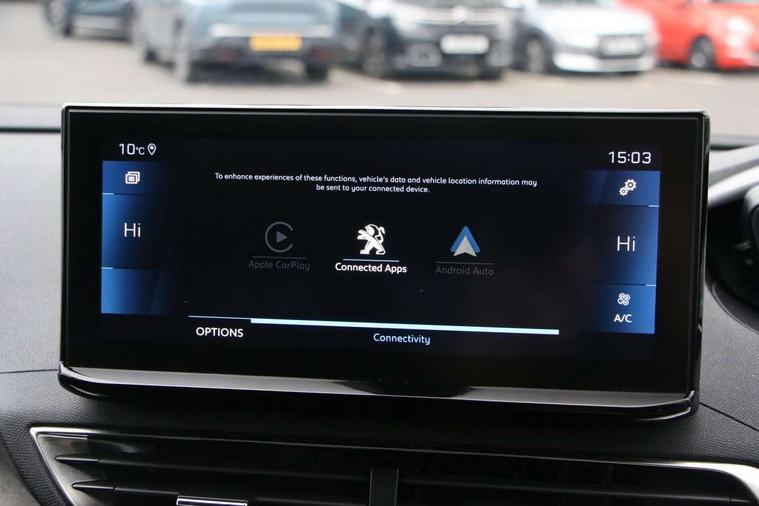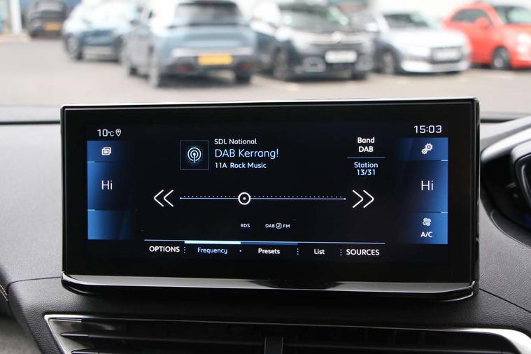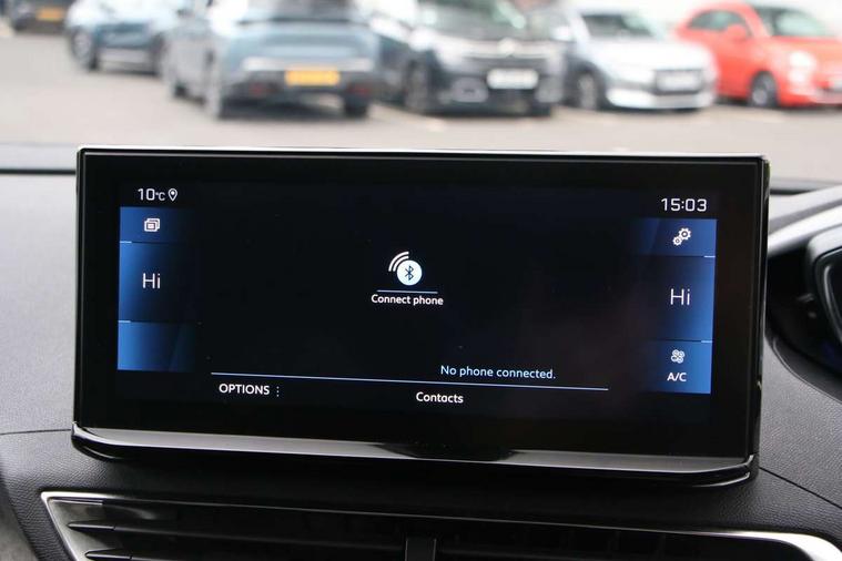 10" High Definition Capacitive Touchscreen, 3D connected navigation + voice control, Bluetooth telephone connection, Driving timer alert system, Extended traffic sign recognition, Exterior temperature gauge with frost alarm, Lane departure warning system, Mirror screen with Apple CarPlay and Android auto, Multi function trip computer, Passive blind spot monitoring without Steering correction, Peugeot i-cockpit with 12.3" headup digital instrumental panel, 8.0" capacitive touch screen and compact sports steering wheel, PEUGEOT SOS and assistance, Rear passenger USB charging sockets (x2) (type A), Speed limit recognition, Sports button, Dynamic stability control, Bi Tuner radio including DAB, USB socket, Automatic activation of hazard warning lights, Black diamond roof and nera black door mirror shells, Black rubber side window trim, Body colour door handles, Body coloured rear spoiler, Body protectors in black, Chrome front wing trim, Dark tinted rear side and tailgate windows, Electric folding door mirrors with exterior courtesy LED lighting, Electric front/rear windows with one touch/auto up/down, Electrically heated door mirrors, Fog Mode, Frameless electrochrome rear view mirror, Front windscreen wiper with magic wash cleaning system, Full LED headlights with static corner lighting and Daytime Running Light extension, Gloss black B and C pillar and aerodynamic deflector trim, Gloss black front bumper air scoops, Gloss black rear cluster connecting strip, GT emblem (front wings and tailgate), Headlights left on audible warning, Heated rear windscreen with integrated antenna, LED rear lights including reversing lights, scrolling indicators and PEUGEOT '3Claw Effect' light signature (with daylight function), LED rear number plate lighting, LED side indicator lights integrated into door mirrors, Rear windscreen wiper with auto activation when reversing, Twin exhaust effect trim, 2 cupholders in front centre console, 3 x 12V power sockets, 4 Grab handles retractable and damped, Aikinite stitching in armrest, gear lever and dashboard facia, Aluminium pedals, Automatic and dual zone diffusion air conditioning system, Blue ambient lighting for connecting zone, Blue ambient lighting to front door panels, central storage and cupholders, Brumeo fabric trimmed door armrests, Central front armrest with butterfly wing opening, Tramontane double stitching and illuminated storage compartment, Electric power steering with reach and rake adjustable steering column, Flocked front door pocket interior with blue ambient lighting, Flocked glovebox interior, Foldable front passenger seat, Footwell lighting, Front ambient lighting, Front interior light with reading spotlights (x2), row 2 interior light with reading spotlights (x2), Gear shift indicator, Illuminated glovebox, Illuminated vanity mirror, Isofix child seat fittings x 3 in the second row, LED interior lighting, Map pocket on front seat backs, Mistral floor mats with Aikinite contrast stitching, Mistral full grain perforated leather steering wheel with aikinite stitch detail and satin chrome 'GT' emblem, Rear ventilation system, Retractable parcel shelf, Roof lining and windscreen pillars in Mistral black, Satin chrome digital instrument panel and touchscreen trim, Satin chrome front door panel recess trim, Satin chrome interior door handles, Satin chrome scorpion's tail and toggle switch trim, Seatbelt not fastened audible and visual alert for front seats, Seatbelt unfastened on the move audible and visual alert for front and rear seats, Third row seats (can be stored under bootfloor or removed completely), Twin rear coat hooks, Children's pack - 5008, Drive Assist Plus Pack - 5008, Driver sport pack - 5008, Visibility pack - 5008, ABS + EBD + EBA, Adaptive driver and front passenger airbags including passenger airbag deactivation function, Electronic parking brake, ESP and ASR traction control with deactivation switch, Five 3 point rear safety belts, Front and rear curtain airbags, Front optimised safety headrests and rear retractable headrests (x3), height adjustable, Front side airbags, Front three point retractable seatbelts height adjustable with pre tensioners and force limiters, Front ventilated disc brakes, Hill start assist, Rear disc brakes, Rear three-point retractable seatbelts (x3) with pre-tensioners and force limiters in the outer rear seats, Two tone horn, Automatic door locking when moving off, Child lock control of rear doors and windows, Electronic code immobiliser, key operated exterior door lock from the left hand door, Keyless start, Perimetric and volumetric alarm with lift and tilt sensor, Peugeot Open and Go System, Remote control central locking with two plip keys, Satin chrome dash trim, Puncture repair kit including compressor, sealant cartridge and towing eye,