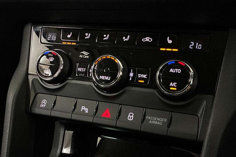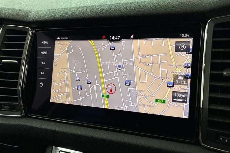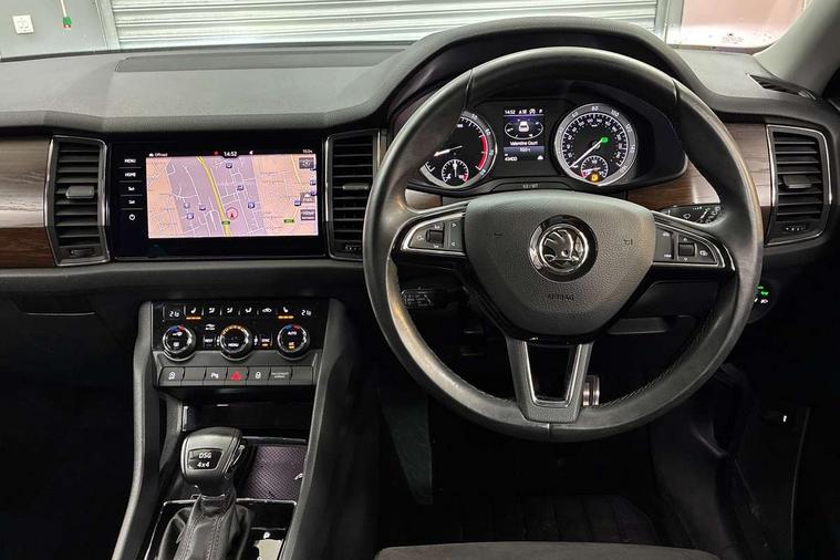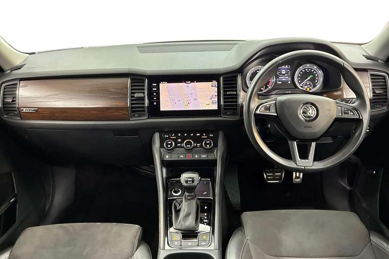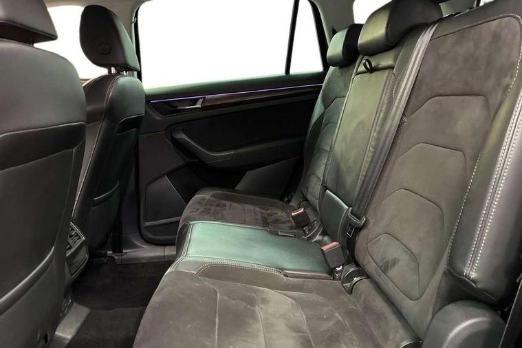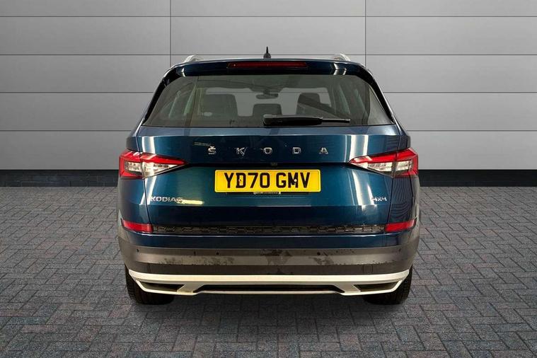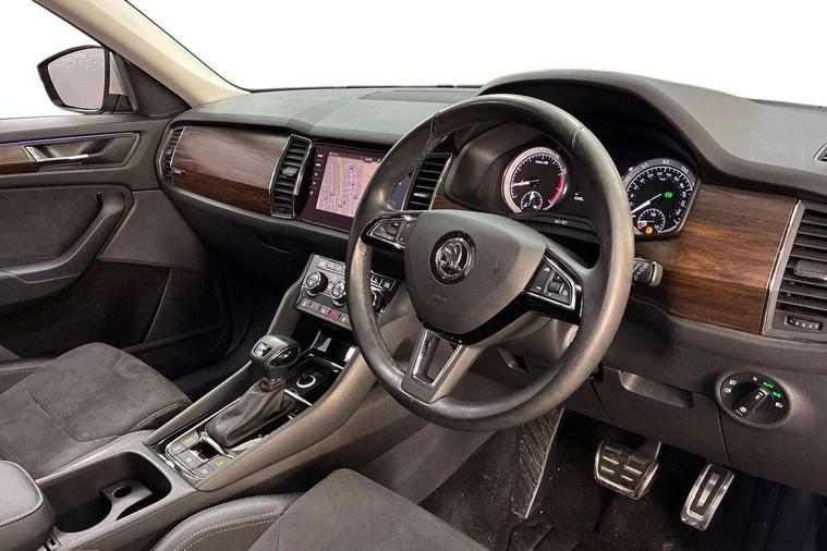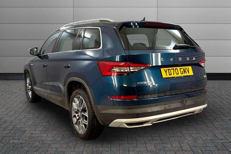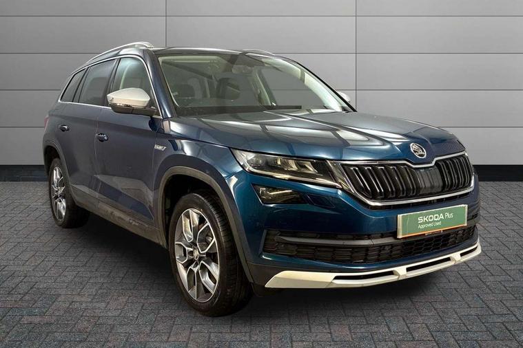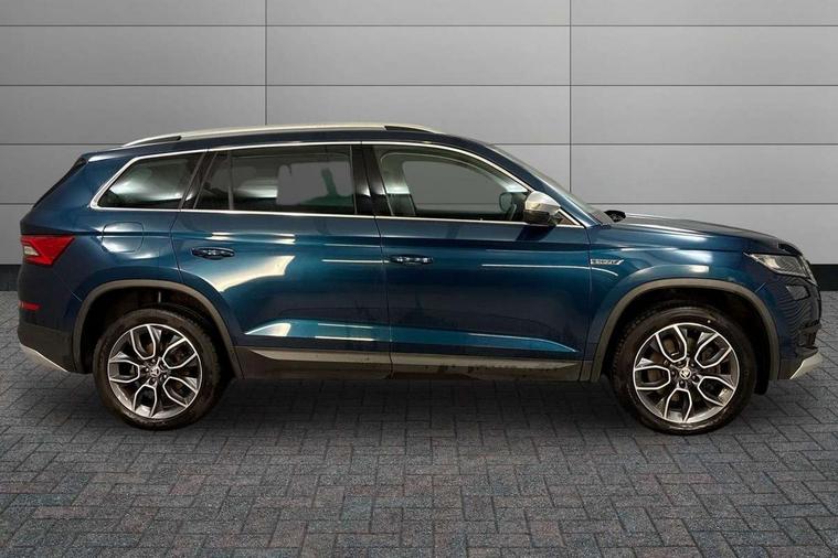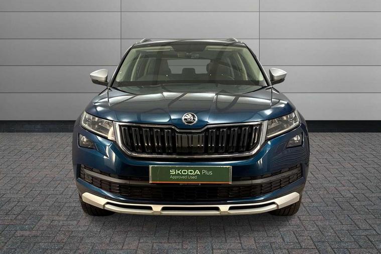 Bluetooth system, Colour multifunction trip computer, Columbus satellite navigation with 9.2" touch screen and integrated Wi-Fi + WLAN, Digital voice enhancement, ECO Stop/start function, Exterior temperature indicator, Map care, Progressive power assisted steering, SmartLink plus, Speed limiter, Tailgate unlocking from outside, Bolero Radio, DAB Digital radio, DVD System, USB and SD card connectivity, Aero front windscreen wipers with intermittent function, Aero rear window wiper, Auto dimming rear view mirror, Automatic activation of hazard warning lights, Black electric window control buttons, Black wheel arch surrounds, Body colour bumpers, Body colour door handles, Electric front and rear windows, Electrically adjustable/heated/foldable and auto dimming door mirrors with memory function, Front and Rear door steps, Full LED Headlights with adaptive front light system and LED daytime running lights, Headlight washers, Heated rear window, Invisible tailpipe, LED front fog lights with static cornering light function, LED rear fog light, LED third brake light in rear spoiler, Light assistant (coming home/tunnel light), Radiator grille frame in matt black with chrome strip, Rain and light sensors, Rear diffuser, Rear spoiler, Safety reflectors on front and rear doors, Scout badge on front fender, Scout off road front and rear bumpers, Silver roof rails and door mirrors, Sunset privacy glass, Without engine designation, 12V socket in boot, 2 rails with 2 hooks including 4 hooks for net programme, 4 foldable roof handles with rear coat hooks, 4 lashing points on luggage floor, 60:40 foldable rear seat with sliding adjustment and backrest angle adjustment, Alcantara door panels, Alcantara upholstery with Scout logo, Aluminium pedals, Bottle holders in door panel in the 1.5 litre front and 1 litre rear, Cargo storage compartments, Centre console with open storage box, cup holder and 12V socket, Chrome headlight control button, Chrome interior door handles, Coat hooks on B pillar, Covered storage compartment on driver side, Electrically adjustable front seats with lumbar support and memory function, Front and rear door armrest with black adductor trim, Front centre armrest with storage compartment, Front/rear courtesy lights, Gear shift lever with chrome frame and black gloss insert, Height adjustable front headrests, Height adjustable rear headrests, Illuminated and cooled glovebox, Illuminated luggage compartment, Isofix system on outer rear seats, Manually adjustable steering column, Net programme in boot (1x horizontal Net, 2x vertical Nets), Overhead glasses storage compartment, Pollen filter, Rear centre armrest with cupholders, Roll up luggage compartment cover with intermediate position, Small Bags on the inner sides of the front backrests, Small pockets on the inner side of the front backrests, Storage compartment in lower middle Instrument panel, illuminated with closing, Three rear height adjustable headrests, Ticket holder on A Pillar, Umbrella in door panel, Welcome animation with Scout logo, Chrome pack - Kodiaq, LED Interior Light pack - Kodiaq Scout/Sport Line/VRS/Laurin + Klement, Rough Road pack - Kodiaq, Auto door release and activation of warning lights in the event of an accident, Driver and passenger airbags, Electronic parking brake with hill hold control, Emergency rear braking signal, ESC (incl. ABS+MSR+ASR+EDS+HBA+DSR+RBS+MKB), Front and rear three point safety belt on all seats, Front assist includes AEB city/urban, Front side airbags, Fuel cut off safety device, Head and knee airbags, Off road switch, Passenger airbag deactivate switch, Rear disc brakes, Safety vest holder in door, Seat belt reminder for all seats, Two tone horn, Tyre pressure monitor, Warning lights in front doors, Alarm with interior monitoring and tilt sensor with safe function, Immobiliser, Keyless entry and start system (KESSY), Remote central locking, Scout plaque on the dashboard, 19" Crater anthracite alloy wheels with anti-theft wheel bolts,