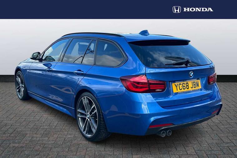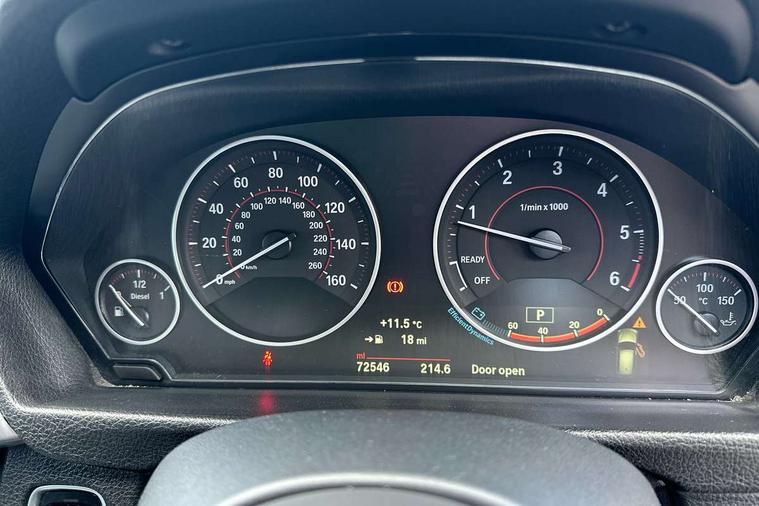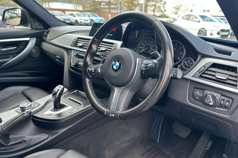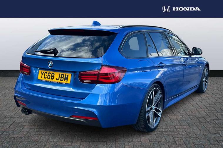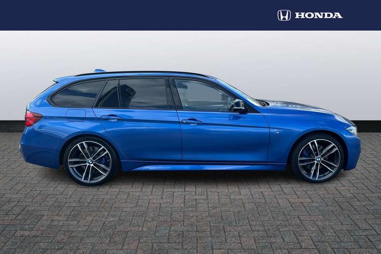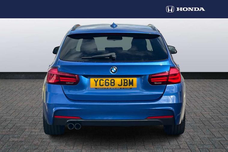 Automatic start/stop system, Automatic tailgate operation, Average speed gauge, BMW Online services, BMW remote services, BMW Teleservices, Brake force display, Brake pad wear indicator in front and rear, Check Control warning system for monitoring of lights and door/luggage compartment open warning, Controller and Control Display+6.5" monitor, Digital clock, Door/boot open warning light, iDrive controller on centre console, Instrument cluster with speedometer with mph readout, tachometer, fuel gauge and oil temperature gauge, Lights on warning, M Sport instrument cluster, Odometer, Oil sensor for level and grade, On board computer, On board diagnostics, Operation warning of all exterior lights, Optimum shift indicator, Outside temperature display, Pesonal profile, Real time traffic information, Service interval indicator, Trip computer, Battery cut-out switch, Diesel particulate filter, Drive Performance Control, Electronic differential lock, Incorrect fuelling protection, Multi-link rear suspension, Sport automatic transmission with steering-wheel mounted gearshift paddles and launch control, BMW professional radio/CD/MP3, CD player, DAB Digital radio, Harman/Kardon loud speaker system, 2 speed adjustable intermittent wipers with wash/wipe function, Active air flap radiator grille, Auto dimming rear view mirror, Automatic headlight beam throw control, Body colour bumpers, Body colour door handles, Body colour roof mouldings, Clear indicator lenses, Dark chrome exhaust tailpipe, Dark headlamp surround, Darkened rear light clusters, Direction indicator, side repeaters, integrated in exterior mirrors, Door sill finisher with M designation, Dynamic brake lights, Electric front and rear windows with one touch/convenient open/close function, Front and rear bumper system with replaceable deformation elements, Green tinted heat insulating glass, Heated rear window with automatic switch off, Heated windscreen washer jets, High beam assistant, High gloss black air inlets, High gloss black finish B pillar, High gloss black rear bumper insert, High gloss shadow line, High level third brake light, Independent opening for tailgate window, LED fog lights, LED rear lights, LED welcome home lights, M aerodynamic body styling, Matt black exterior trim, Rain sensor + automatic driving lights control, Rear wash/wipe, Shark fin roof aerial, Sun protection glass, Visible VIN plate, 12V sockets in front centre console and passenger footwell, 3 rear seat head restraints, 4 foldable grab handles - rear with clothes hook, 4 lashing points on luggage floor, 40:20:40 split folding rear bench seat, Anthracite headlining, Automatic interior light soft on/soft off system, Dual zone automatic air conditioning, Folding front centre armrest + storage, Front and rear door armrests, Front and rear velour floor mats, Front door storage bins with bottle holder, Front sports seats with electric side bolster adjustment, Glovebox light, Glovebox opener with chrome spider, Height adjustable front headrests, Indirect front interior illumination - soft-light function, Leather gear knob, Leather gear selector lever handle, Leather handbrake lever, Luggage compartment lighting, Reach + rake adjustable steering column, Rear centre armrest with 2 cupholders, Rear child seat isofix attachment with passenger airbag deactivation, Retractable luggage cover, Separation net, Storage compartment in rear centre console, front and rear door trims and under luggage compartment, Sunvisors with illuminated vanity mirrors and ticket pocket, Through load system, Toolkit located in luggage compartment, Two front cup holders with a sliding lid, Extended lighting package - 3 Series, Extended storage pack - 3 Series Touring/Saloon, High gloss shadow line pack - 3 Series, Interior lights pack - 3 Series Touring, Luggage compartment storage pack - 3 Series Touring, 3 point seatbelts on all seats (2 front, 3 rear), front pyrotechnic belt tensioners and belt force limiters, rear coded belt buckles, ABS, Automatic Stability Control (ASC), BMW emergency call, Brake drying, Brake energy regeneration, Braking pre-tensioning, Cornering brake control (CBC), Crash sensor, Driver and front passenger front and side airbags with passenger deactivation and ITS front and rear head airbags, DSC+, Dynamic brake control, Dynamic Traction Control - DTC, Hill start assist, M Sport braking system, Rear child proof door locks, Seatbelt security check for driver seat, Side impact protection, Twin horns, Tyre pressure monitor, Ventilated front and rear disc brakes, Warning triangle and first aid kit, Alarm system (Thatcham 1) with remote control and electronic engine immobiliser, Automatic drive away locking facility, Central locking switch for all doors, fuel filler cap and luggage compartment, Remote control including integrated key with blue insert, Start/stop button with Comfort Go keyless engine start and auto Start/stop deactivation button, Air-conditioning and radio control panel with Chrome highlight, 19" M double spoke alloy wheels style in bicolour orbit grey - style 704M, Low rolling resistance tyres, Run-flat tyres,