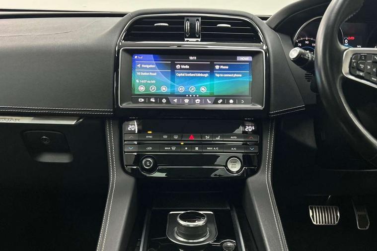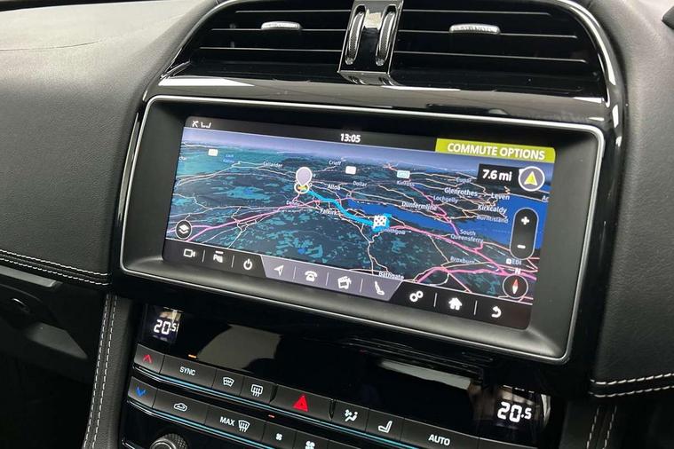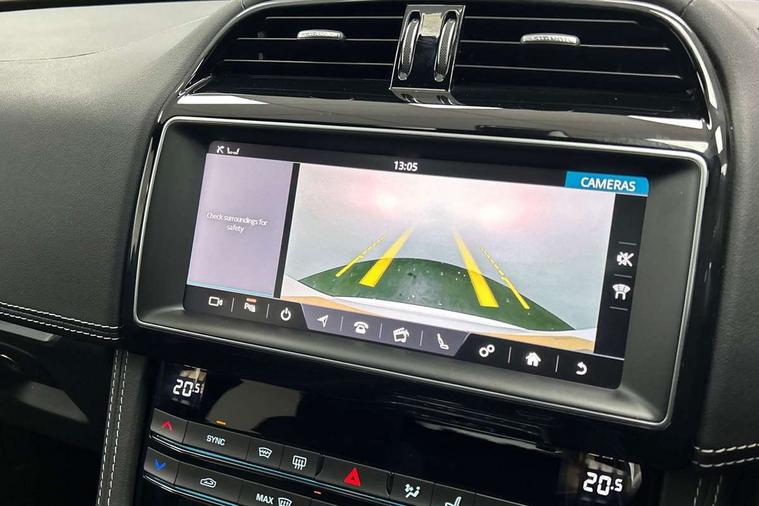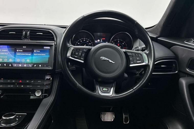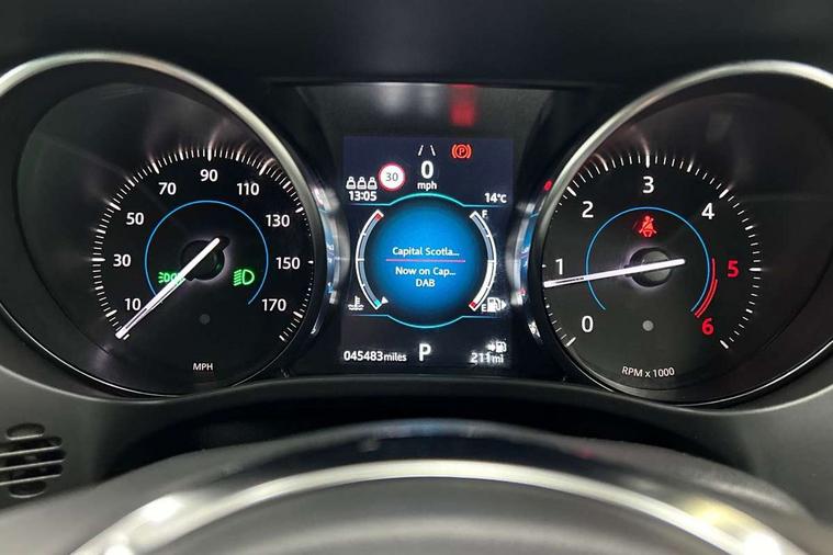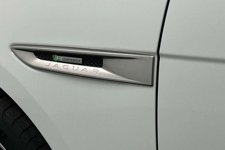 Analogue dials with 7" central TFT display, Android Auto, Apple car play, Driver condition monitor, Eco driving style assistant, Electric power assisted steering, InControl remote premium, JaguarDrive control, Lane departure warning system, Lane keep assist with driver alert control, Outside temperature gauge, Pro services and wifi hotspot, Push button starter, Rotary shifter, Service interval indicator, Speed proportional steering, Start up sequence with movement in dials and lighting, Traffic sign recognition, Trip computer, Voice control system, 8 speed automatic transmission, All terrain progress control, All Wheel Drive (AWD), Open differential with torque vectoring by braking, AM/FM radio, Bluetooth connectivity including audio streaming, DAB Radio (Digital Audio Broadcasting), Dynamic volume control, InControl apps, InControl protect, 3 flash lane change indicators, Antenna roof pod in gloss black, Approach Illumination, Auto dimming rear view mirror, Automatic headlights, Body colour bumpers, Body colour door mirrors, Electric front/rear windows with one touch/auto up/down, Front fog lights, Green tinted heat insulating glass, Headlight power wash, Heated rear window with timer, Jaguar script and leaper, LED tail lights, Non acoustic front windscreen, R-sport body kit, R-Sport front bumpers, R-Sport rear bumpers, Rain sensor windscreen wipers, Rear fog lights, Rear metal tread plates, Rear wiper, Single sided twin tailpipes with 75mm finishers, Trailer stability assist, Variable front intermittent wipers, 12V power point front, 3 rear headrests, 40:20:40 split folding rear bench seat, Bright metal foot pedals, Centre armrest console, Centre console with side storage, Door sill tread plates, Fold flat front seats, Front centre armrest with storage compartment, Front headrests, Glovebox finisher with jaguar script, Hooks in loadspace, Illuminated glovebox, Illuminated luggage compartment, Interior front door handles with separate locking switches, ISOFIX on outer rear seats, Jaguar sense, Luggage tie downs in loadspace, Multifunction steering wheel, Overhead lighting console, Passive front head restraints, Perforated grained leather upholstery with contrast stitching, Premium carpet mats, R-Sport branded soft grain leather sport steering wheel, Rear air vents, Rear armrest with twin cupholders, Rear centre headrest, Reversible boot floor, Satin chrome gearshift paddles, Sunvisors with illuminated vanity mirrors, Twin front cupholders with cover, 3x3 point rear seatbelts, ABS, All surface progress control (ASPC), Anti-whiplash front headrests, Autonomous emergency braking (AEB) with forward facing camera, Brake pad warning light, Driver/Front Passenger airbags, DSC - Dynamic Stability Control, Electronic parking brake, Front and rear curtain airbags, Front and rear seatbelt reminder, Front passenger seat occupancy sensor, Front side airbags, Hill launch assist, Power operated child locks, Torque vectoring brake, Traction control, Tyre pressure monitoring system, Unpainted brake calipers, Immobiliser, Keyless start, Locking wheel nuts, Perimeter alarm, Remote central locking, Valet mode, Luxtec door trim, Luxtec wrapped instrument panel topper with wrapped binnacle, Satin chrome centre console storage surround finishers, Satin chrome touchscreen surround,
