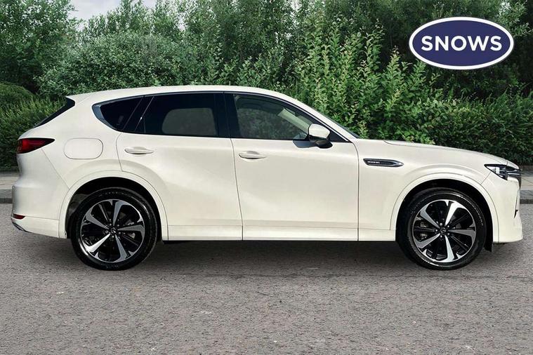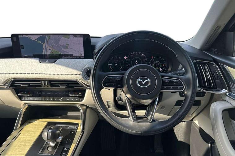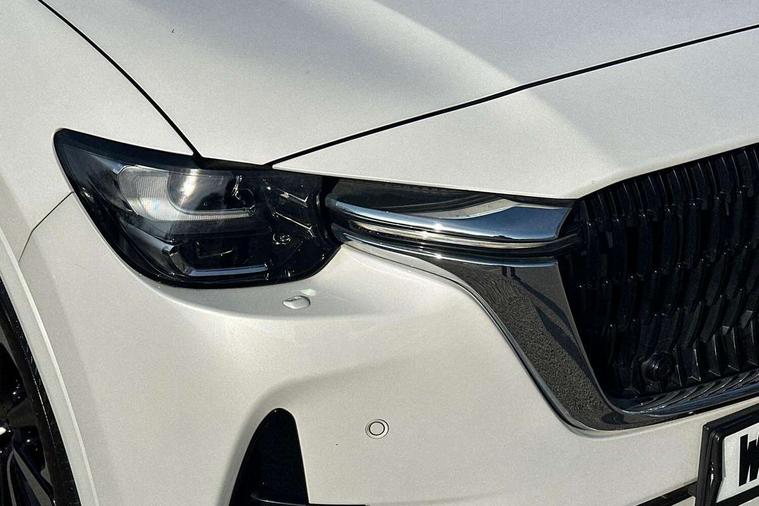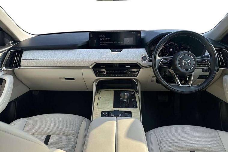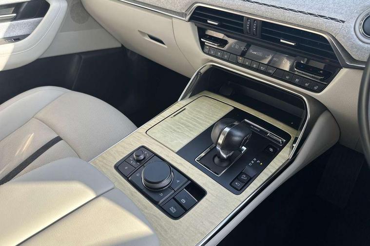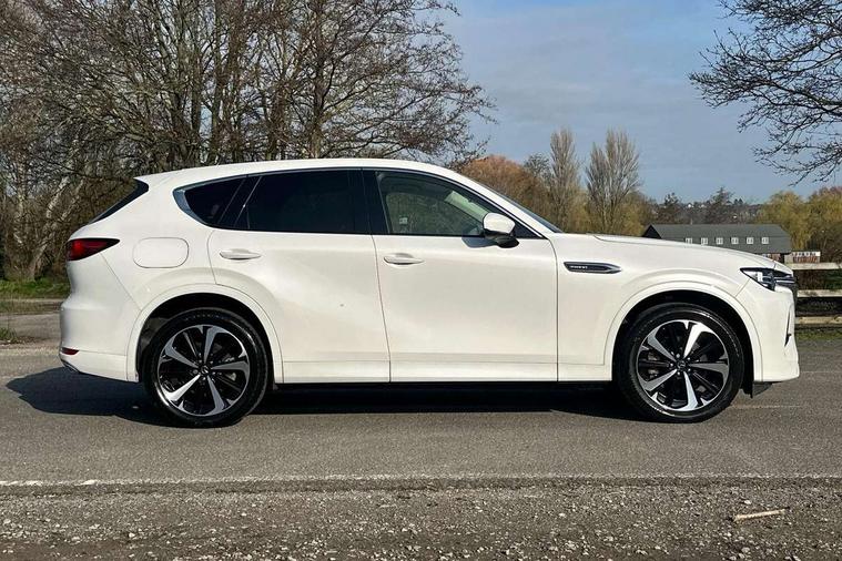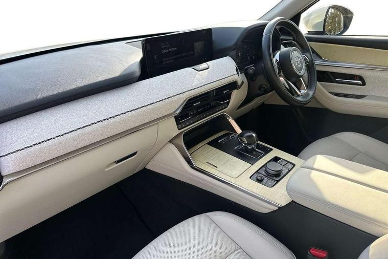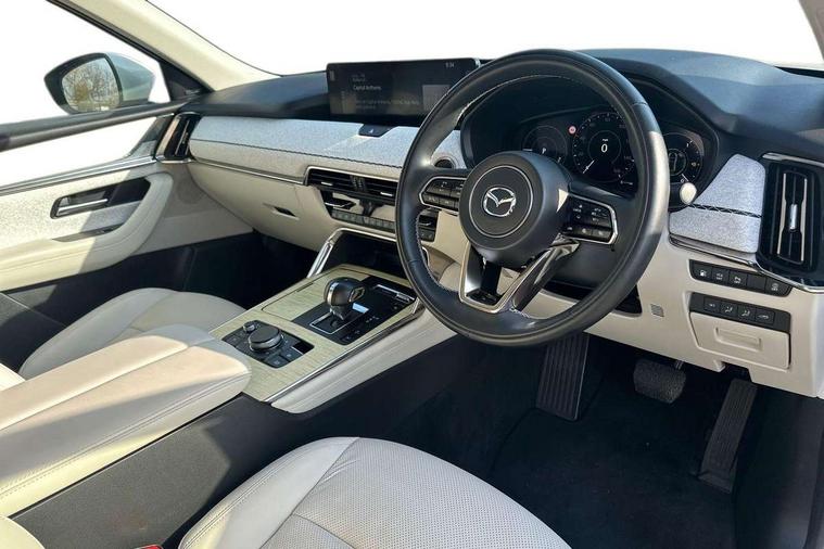 Emergency lane keeping with blind spot assist, Low washer fluid warning light, 12.3" Colour entertainment centre display with mazda connect infotainment, 12.3" TFT Colour display, Adjustable speed limiter, Blind spot assist, Blind spot monitoring with rear cross traffic alert, Dashboard leather with feature stitching, Distance alert system, Driver attention alert system, Driver Monitoring with personal identification, E-call with GPS, Emergency stop signalling system, Exit warning function, Front and rear parking sensors, Ingress / Egress support and automatic driver position guide, Integrated bluetooth, Intelligent speed assist, Kinematic posture control, Lane keep assist system (LAS) with Lane departure warning system (LDWS), Mazda Driver Personalisation System, Mazda Navigation System with european mapping, Multimedia Commander, PAS, Power lift gate with handsfree function, Power start/stop button, Reversing camera with static guide lines, Speed alert, Traffic sign recognition, Trip computer, Windscreen projected colour active driving display, Wireless apple car play/android Auto, Type 2 Mode 2 cable for AC charging via UK 3-pin plug, 7.2 kw On board Charger, Mi-Drive (Normal, Sport, Off-road, Towing and EV mode), Type 2 Mode 3 cable for AC charging via home or public charge points, AM/FM and DAB radio, Bose surround sound system with 12 Speaker, Bose center point, Bass match and audio pilot technology, Steering wheel mounted audio/bluetooth controls, USB-C inputs (x2 front and x2 rear), Auto dimming driver's door mirror, Automatic headlight levelling, B-pillar and C-pillar garnishes in gloss black finish, Body colour roof spoiler, Body coloured bumpers, Body coloured door mirrors, Body coloured wheel arch and side mouldings, Bright decoration panel, Chrome finish signature wing in front grille, Chrome front side garish, Chrome headlight lense, Chrome side window surrounds, Coming/leaving home lighting function, Dusk sensing headlights, Electric front/rear windows with one touch auto up/down, Electrically adjustable, heated auto power folding door mirrors with memory, Frameless auto dimming interior rear view mirror, Front kodo turn signal, Front wiper de-icer, Gloss black bar type front grille, Headlight washers, High beam control, LED 3rd brake light, LED rear signature combination lamps, Rain sensing front wipers with adjustable sensitivity and speed, Rear side wing doors, Rear wiper, Signature LED daytime running lights, 12v power outlet - front, 12V socket in boot, 3 height adjustable rear headrests, 3 seat bench in 2nd row, 40/20/40 split folding rear seats with quick levers in the boot, Ambient lighting, Cargo net, Chrome interior trim accents with steering wheel centre bezel, surround of engine start / stop button and glove box handle, Door panel trim vinyl leather with armrest, Driver and front passenger two rear grab handles with rear coat hooks, Driver and front passenger visors with covered vanity mirror and driver ticket holder, Driver seat electric tilt, slide, recline, height and lumbar adjustment, Driver, front passenger and two rear door pockets, Driver/passenger front seatback pockets, Dual zone climate control air conditioning with rear air vents, Electric telescopic and tilt adjustment steering wheel, Folding rear centre armrest with two cup holders, Front centre storage with two cupholders, Front down lamp with front and rear foot lamps, Front headrests, Front passengers seat electric slide, recline, height and lumbar adjustment, Front seat ventilation with 3-stage setting, Glovebox illumination, Heated front seats with 3 stage setting, Heated leather wrapped steering wheel, Heated outer rear seats with 3-stage setting, ISOFIX child seat anchorage points attached on outer rear seats, Karakuri tonneau cover, Leather wrapped gear shift knob, LED illumination luggage compartment, Nappa leather upholstery, Paddle shift, Practical and spacious front centre armrest storage, Rear seat recline function for rear passenger comfort, Remote fold down rear seats, Roof mounted sunglasses holder, Single front passenger seat, 3 point ELR front seat belts x2 with pretensioners, 3 point ELR rear seat belts, Active bonnet, Anti-lock braking system (ABS), Drivers knee airbag, DSC - Dynamic Stability Control, Electronic parking brake with auto disengage function and auto hold function, Front and rear curtain airbags, Front dual stage driver and single stage front passenger airbags, Front passenger airbag cut-off switch, Front side airbags, Front smart city brake support, Hill decent control, Hill launch assist, Manual rear child locks, Seatbelt reminder for driver/front passenger and rear seats, Traction control, Tyre pressure monitoring system (TPMS), Remote central locking with deadlocking and automatic door lock when driving, Smart keyless entry, Thatcham accredited alarm and immobiliser, Cloth with "X" stitch dashboard panel, White maple wood centre console panel, 20" Black metallic mechined alloy wheels, Emergency tyre repair kit,