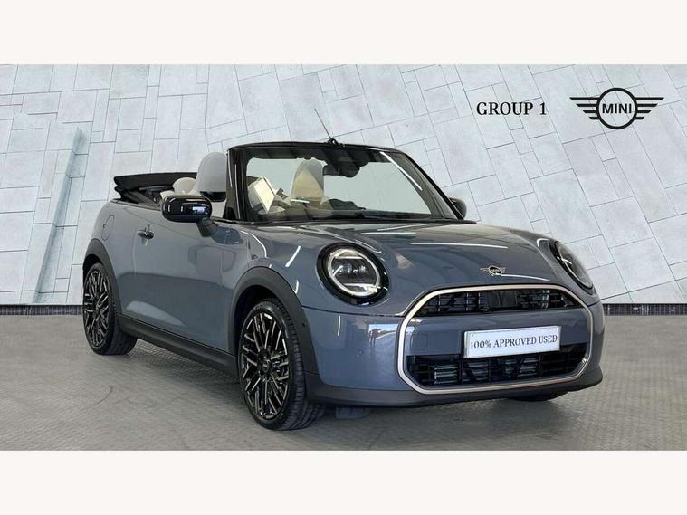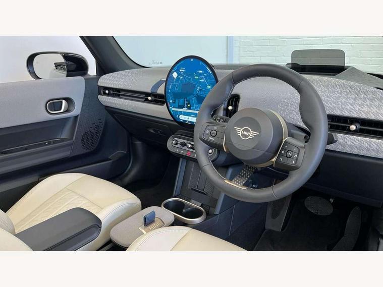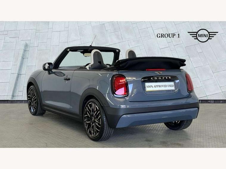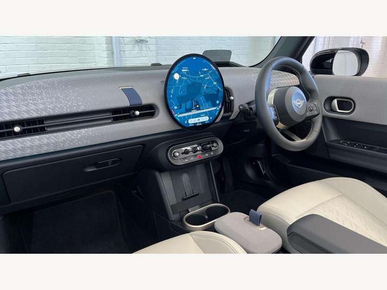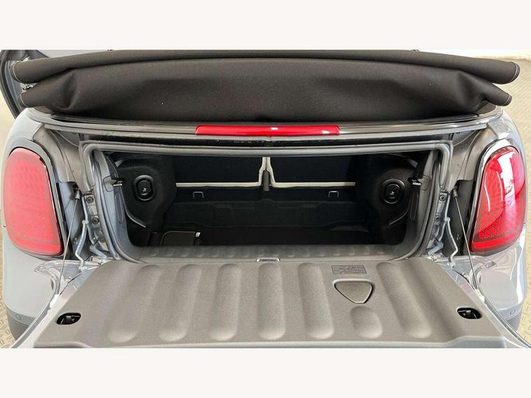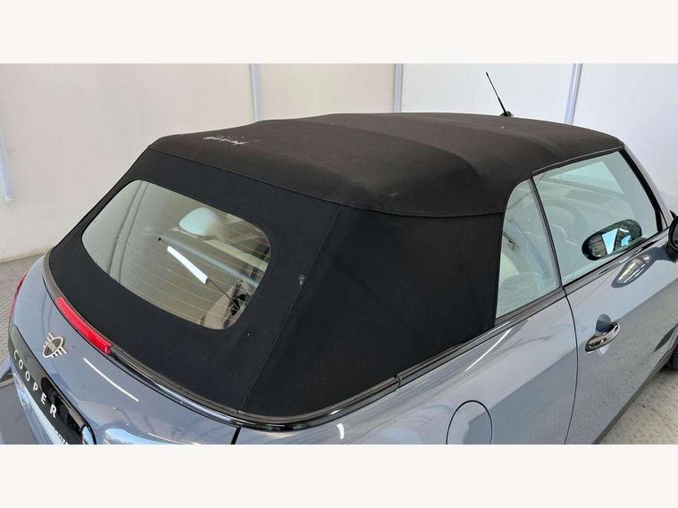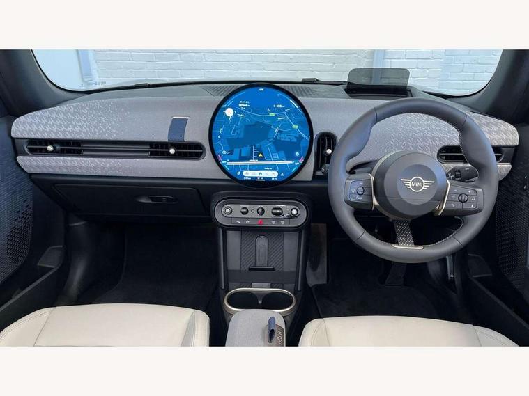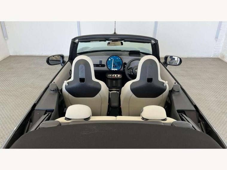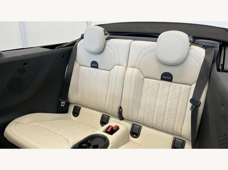 Central toggle bar, Circular OLED Screen, Compatible mobile phone bluetooth with audio streaming, Cruise control, Digital instrument cluster, e-Call (emergency call), MINI Experience Modes, Mini navigation system, On board computer, PAS, Service interval indicator, 7 speed steptronic transmission with double clutch, DAB Digital radio, Auto headlights, Electric front windows, LED 3rd brake light, LED daytime running lights, LED Headlights, LED indicator lights, LED rear lights, Logos in Vibrant Silver, Rain sensor window wipers, Rear boot, Rear fog lights, Vibrant Silver Grill Surround, Wind deflector, 2 seat bench in second row, 2 zone automatic air conditioning, 60/40 rear seat bench, Ambient lighting, Dark headliner, Floor mats, Front and rear head restraints, Front compact armrest, Heated steering wheel, Height adjustable passenger seat, Lidded storage box in grey knit, Luggage compartment lighting, Single front passenger seat, Sport Vescin Steering Wheel black with vibrant silver accents, Sunvisors with vanity mirrors, Vescin synthetic leather upholstery includes dash knit in beige with grey accents, Driving assistant pack - Cooper Convertible, Park assistant pack - Cooper Convertible, 3 point seatbelts on all four seats, 6 Airbags - front, side, head and seat belt tensioners, Anti-lock braking system (ABS), DSC - Dynamic Stability Control, Electronic parking brake, Front and rear disc brakes, Front ISOFIX (iSize), Front passenger airbag deactivation, Traction control, Tyre pressure monitoring system, Alarm, Immobiliser, Remote central locking, Blue decorative dash strap, Tyre repair kit,