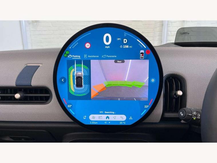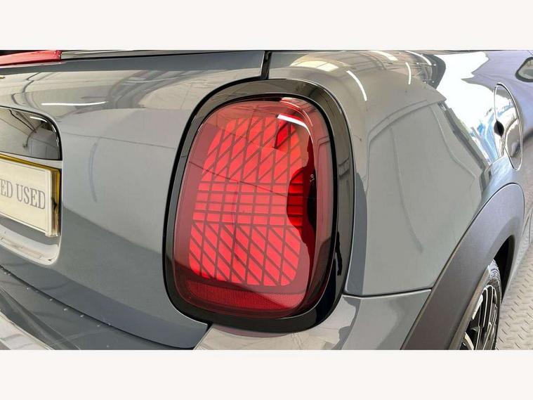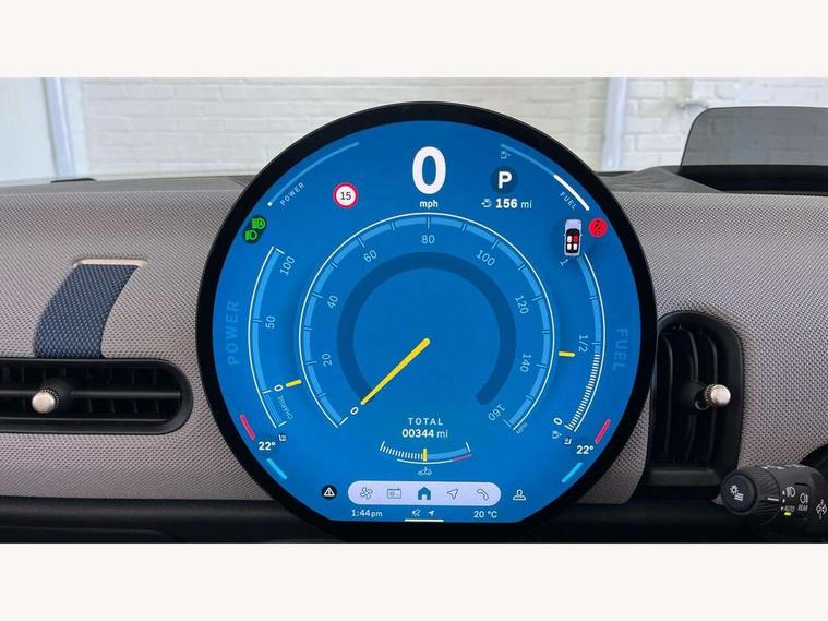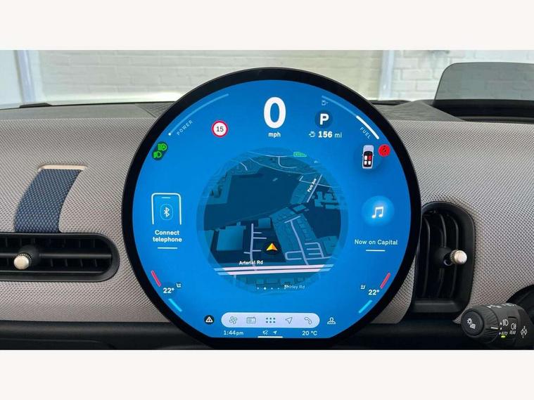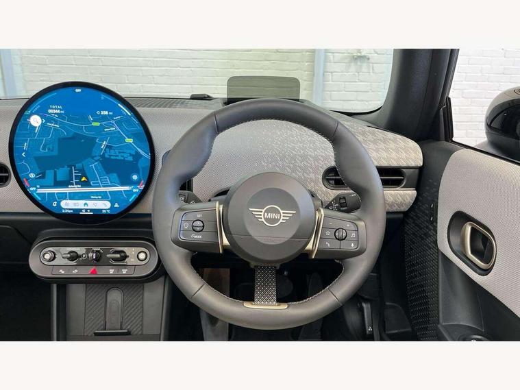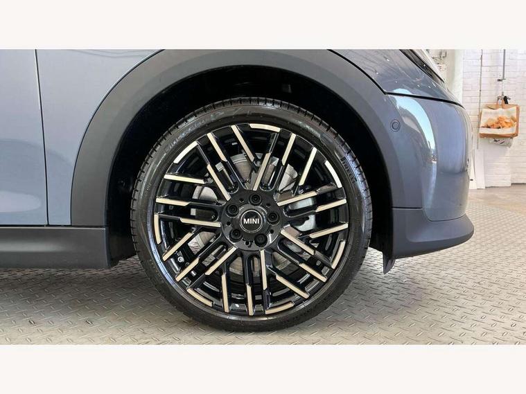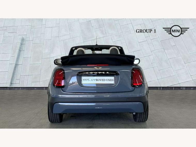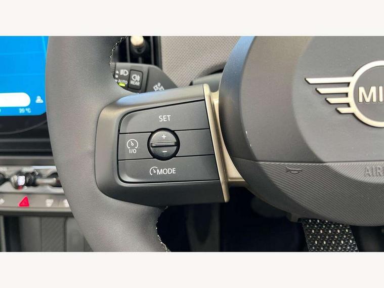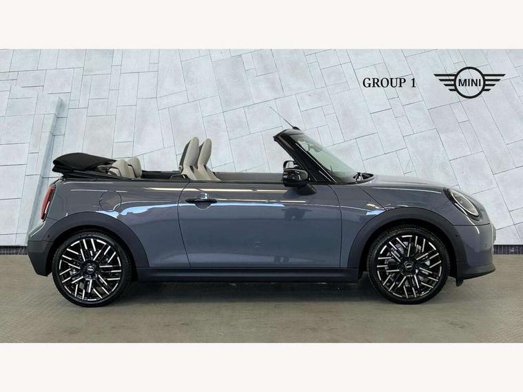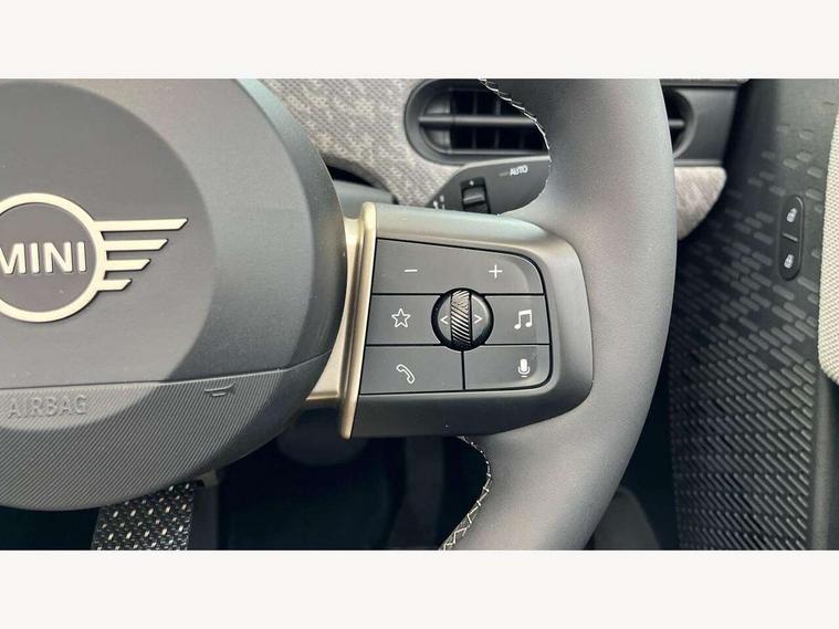 Central toggle bar, Circular OLED Screen, Compatible mobile phone bluetooth with audio streaming, Cruise control, Digital instrument cluster, e-Call (emergency call), MINI Experience Modes, Mini navigation system, On board computer, PAS, Service interval indicator, 7 speed steptronic transmission with double clutch, DAB Digital radio, Auto headlights, Electric front windows, LED 3rd brake light, LED daytime running lights, LED Headlights, LED indicator lights, LED rear lights, Logos in Vibrant Silver, Rain sensor window wipers, Rear boot, Rear fog lights, Vibrant Silver Grill Surround, Wind deflector, 2 seat bench in second row, 2 zone automatic air conditioning, 60/40 rear seat bench, Ambient lighting, Dark headliner, Floor mats, Front and rear head restraints, Front compact armrest, Heated steering wheel, Height adjustable passenger seat, Lidded storage box in grey knit, Luggage compartment lighting, Single front passenger seat, Sport Vescin Steering Wheel black with vibrant silver accents, Sunvisors with vanity mirrors, Vescin synthetic leather upholstery includes dash knit in beige with grey accents, Driving assistant pack - Cooper Convertible, Park assistant pack - Cooper Convertible, 3 point seatbelts on all four seats, 6 Airbags - front, side, head and seat belt tensioners, Anti-lock braking system (ABS), DSC - Dynamic Stability Control, Electronic parking brake, Front and rear disc brakes, Front ISOFIX (iSize), Front passenger airbag deactivation, Traction control, Tyre pressure monitoring system, Alarm, Immobiliser, Remote central locking, Blue decorative dash strap, Tyre repair kit,