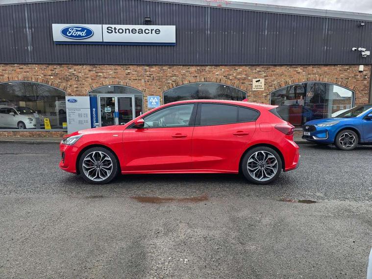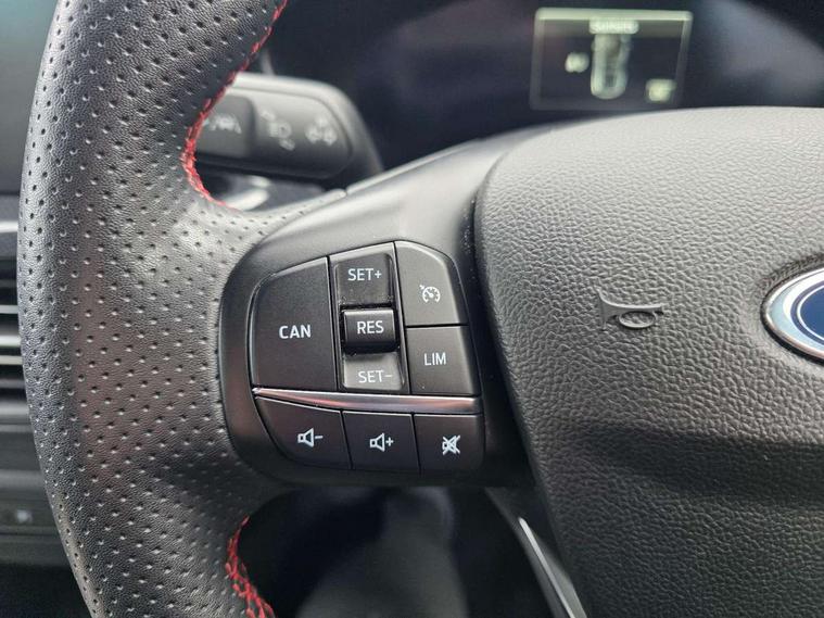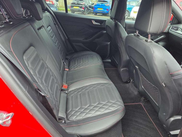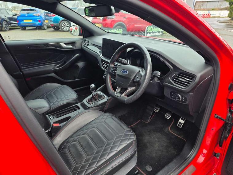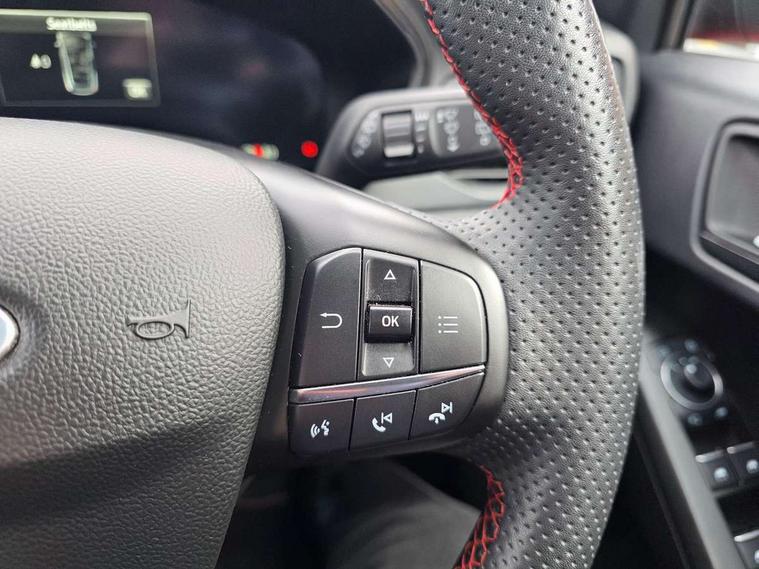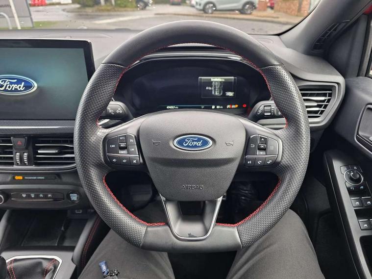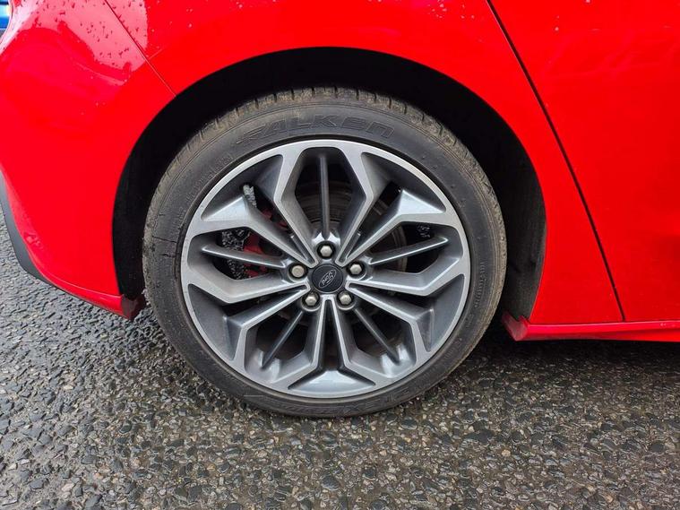 12.3" Digital instrument cluster, Bluetooth system, Digital clock, E-call, Easy fuel capless refuelling system, Eco mode, Ford SYNC 3 navigation with 8" TFT touchscreen, DAB radio and app link Android auto/Apple carplay, Intelligent speed assist, Lane keeping system - lane keeping alert and lane keeping aid, PAS, Selectable drive mode, Trip computer, Sports tuned suspension, 2 USB ports, Aux input, Auto dimming rear view mirror, Auto headlamps (on/off), Automatic rain sensing wipers, Body colour large rear spoiler, Body coloured bumpers, Body coloured door handles, Body coloured electrically operated and heated door mirrors with side indicators, Electrically operated front and rear windows with one touch opening and closing, Front variable intermittent wipers with electric wash, Heated rear window, LED daytime running lamp, Polished twin tailpipe, Power folding door mirrors with puddle lights, Quickclear heated windscreen, Rear privacy glass, Rear side wing doors, ST-Line upper and lower grille with full body styling kit and wing badges, Tailgate wash/wipe, Third brake light, Unique door and instrument panel inserts, 3 seat bench in 2nd row, 3 spoke flat bottomed Sensico steering wheel with red stitching, 6 way power adjustable driver seat, Aluminium gear knob, Dark headliner, Driver's lumbar support, Dual zone electronic air temperature control, Front and rear floor mats with red stitching, Heated driver and front passenger seats, Heating for Sensico steering wheel, Height adjustable front headrests, Isofix child seat preparation, Reach + rake adjustable steering column, Rear centre headrest, Sensico premium upholstery, Single front passenger seat, Soft console knee pads with red stitching, 3x3 point rear seatbelts, ABS+Electronic Brake force Distribution, Auto hold function, Driver airbag, Electronic parking brake, Electronic stability control, Front and rear seatbelt reminder, Front inertia reel height adjustable seatbelts with pre-tensioners, Front passenger airbag, Front side airbags, Hill start assist, Passenger airbag deactivate switch, Post collision braking, Pre collision assist with autonomous emergency braking and pedestrian/cyclist detection, Remote/power child rear door locks, Side curtain airbags, Three rear inertia reel lap/diagonal seatbelts, Tyre pressure monitoring system, Ford keyfree system with Keyless entry and keyless start/sleep mode key fob, MyKey system, Remote central locking & engine immobiliser, Thatcham category 1 alarm, 18" 5x2 spoke gloss black machined finish alloy wheels, Mini steel spare wheel,
