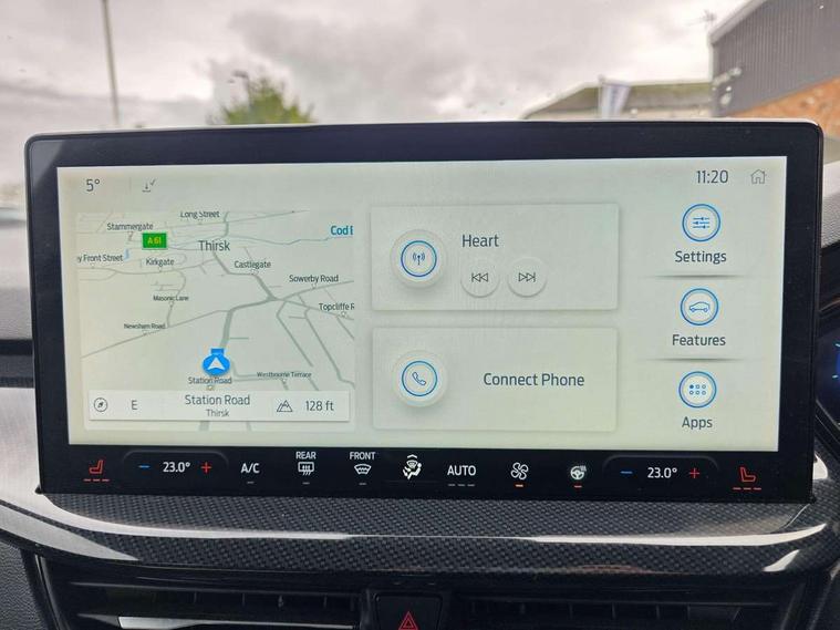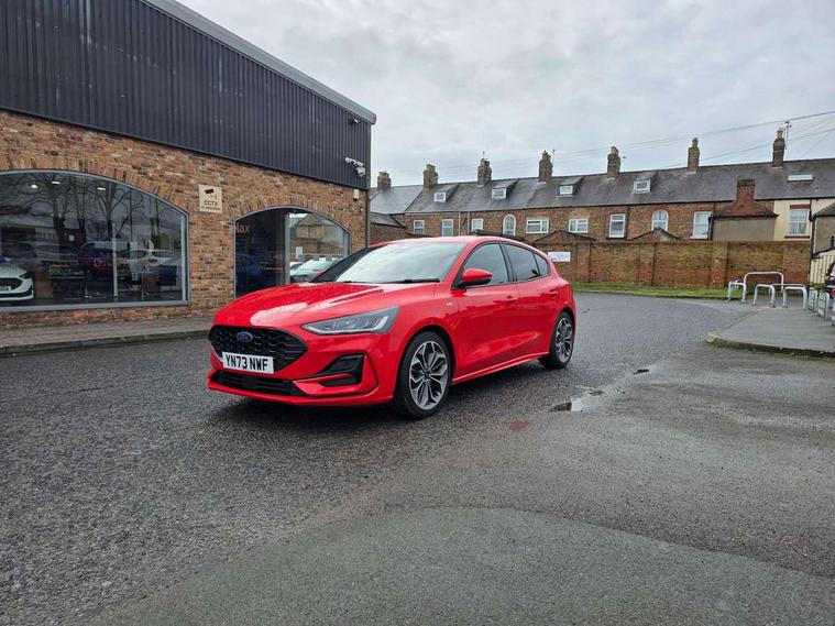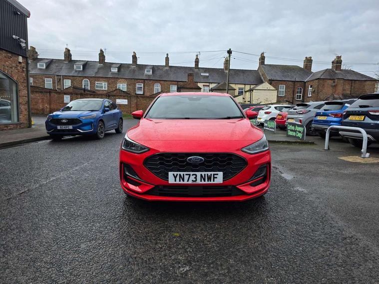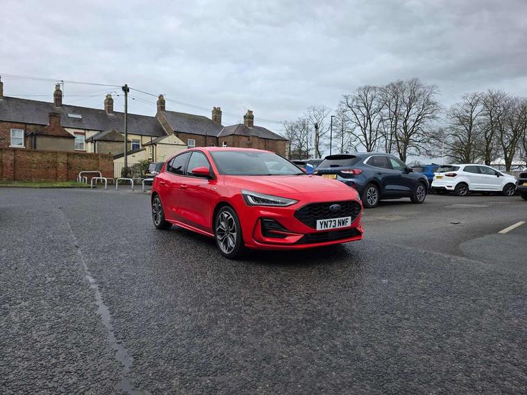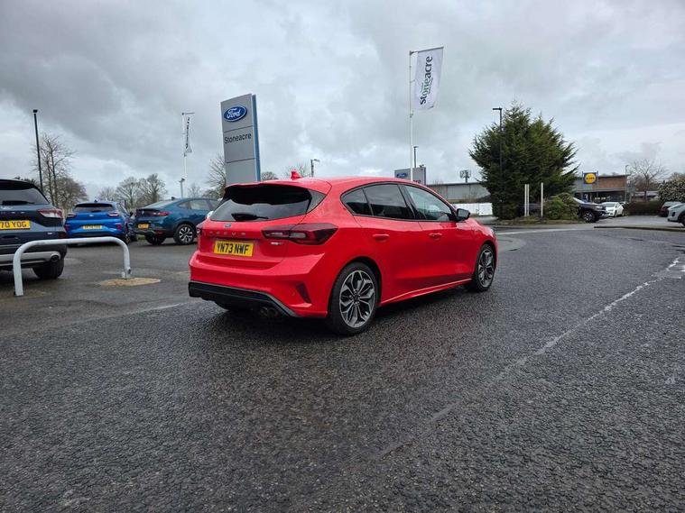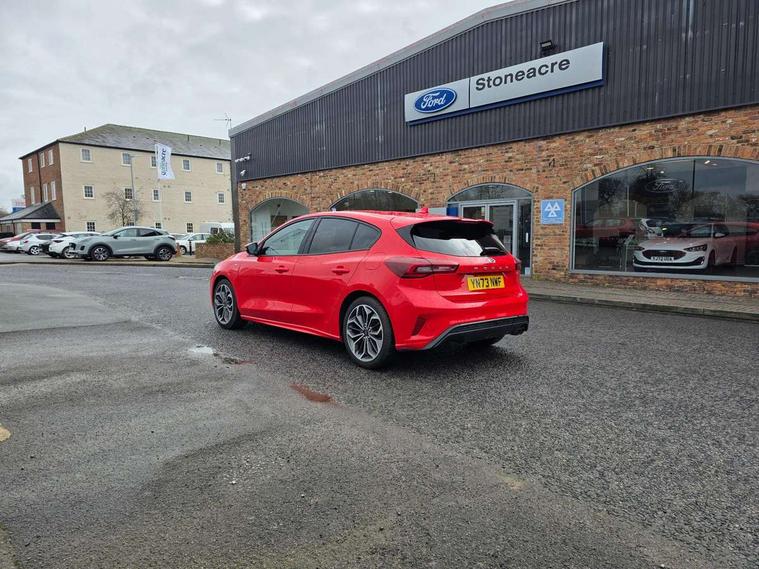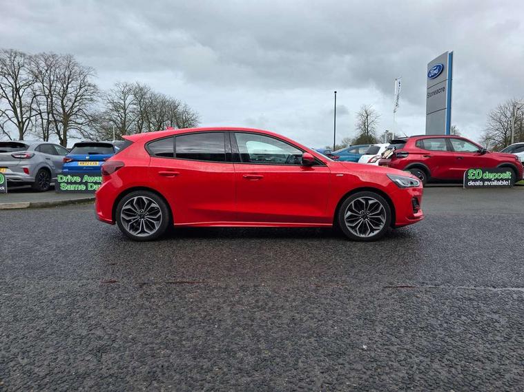 12.3" Digital instrument cluster, Bluetooth system, Digital clock, E-call, Easy fuel capless refuelling system, Eco mode, Ford SYNC 3 navigation with 8" TFT touchscreen, DAB radio and app link Android auto/Apple carplay, Intelligent speed assist, Lane keeping system - lane keeping alert and lane keeping aid, PAS, Selectable drive mode, Trip computer, Sports tuned suspension, 2 USB ports, Aux input, Auto dimming rear view mirror, Auto headlamps (on/off), Automatic rain sensing wipers, Body colour large rear spoiler, Body coloured bumpers, Body coloured door handles, Body coloured electrically operated and heated door mirrors with side indicators, Electrically operated front and rear windows with one touch opening and closing, Front variable intermittent wipers with electric wash, Heated rear window, LED daytime running lamp, Polished twin tailpipe, Power folding door mirrors with puddle lights, Quickclear heated windscreen, Rear privacy glass, Rear side wing doors, ST-Line upper and lower grille with full body styling kit and wing badges, Tailgate wash/wipe, Third brake light, Unique door and instrument panel inserts, 3 seat bench in 2nd row, 3 spoke flat bottomed Sensico steering wheel with red stitching, 6 way power adjustable driver seat, Aluminium gear knob, Dark headliner, Driver's lumbar support, Dual zone electronic air temperature control, Front and rear floor mats with red stitching, Heated driver and front passenger seats, Heating for Sensico steering wheel, Height adjustable front headrests, Isofix child seat preparation, Reach + rake adjustable steering column, Rear centre headrest, Sensico premium upholstery, Single front passenger seat, Soft console knee pads with red stitching, 3x3 point rear seatbelts, ABS+Electronic Brake force Distribution, Auto hold function, Driver airbag, Electronic parking brake, Electronic stability control, Front and rear seatbelt reminder, Front inertia reel height adjustable seatbelts with pre-tensioners, Front passenger airbag, Front side airbags, Hill start assist, Passenger airbag deactivate switch, Post collision braking, Pre collision assist with autonomous emergency braking and pedestrian/cyclist detection, Remote/power child rear door locks, Side curtain airbags, Three rear inertia reel lap/diagonal seatbelts, Tyre pressure monitoring system, Ford keyfree system with Keyless entry and keyless start/sleep mode key fob, MyKey system, Remote central locking & engine immobiliser, Thatcham category 1 alarm, 18" 5x2 spoke gloss black machined finish alloy wheels, Mini steel spare wheel,