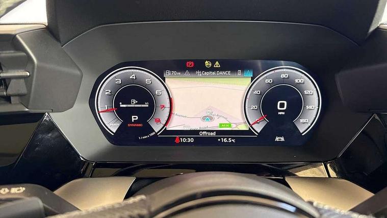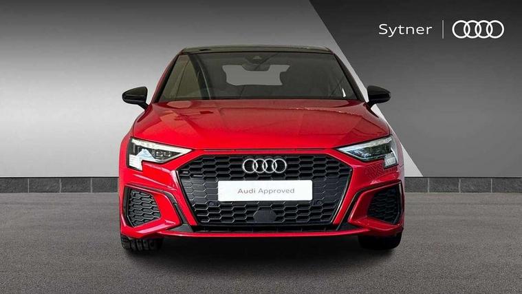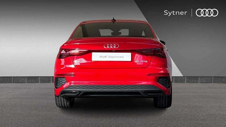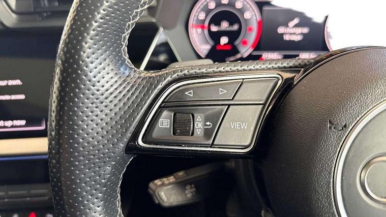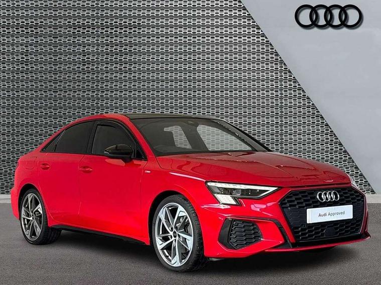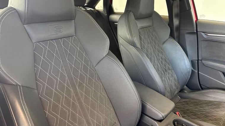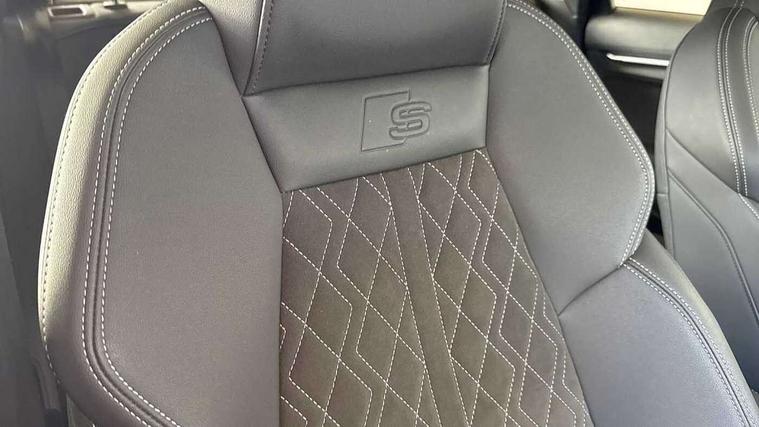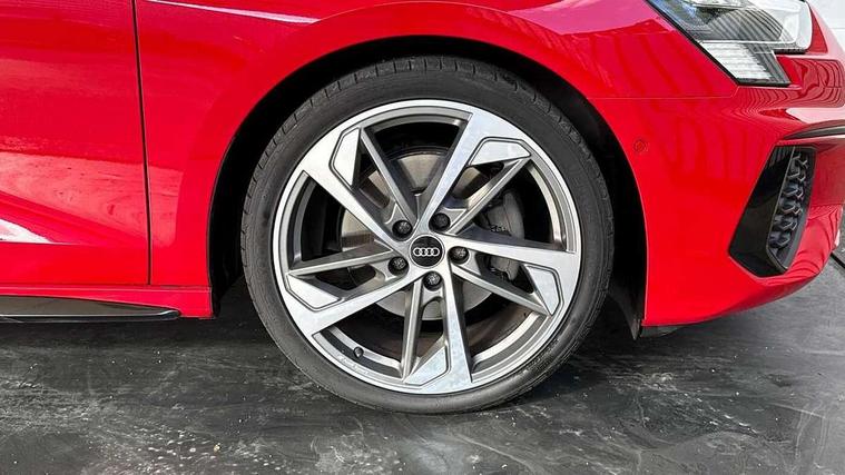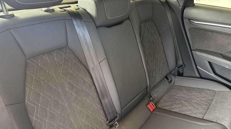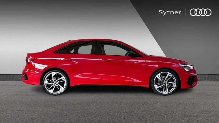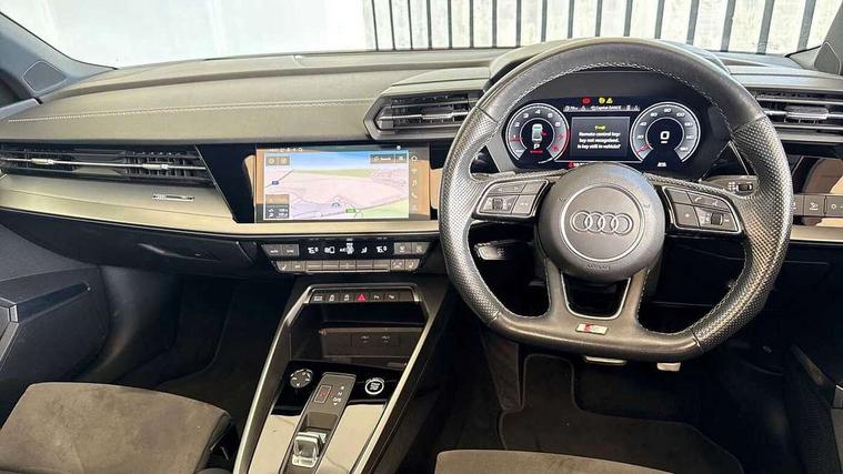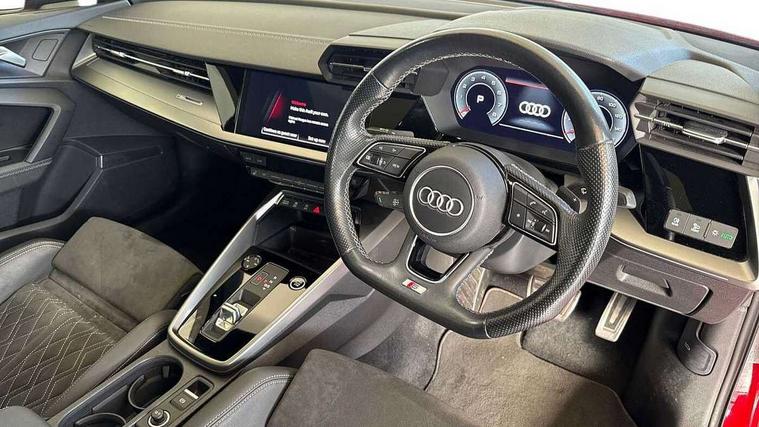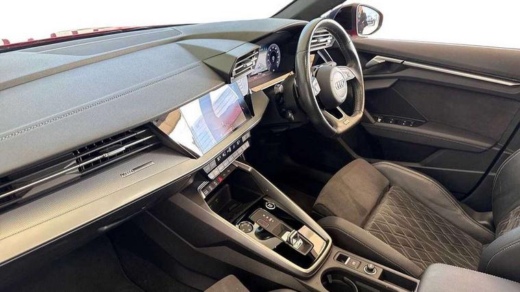 Audi connect emergency call and service, Audi drive select (Auto, Comfort, Dynamic, Efficiency and Individual), Audi smartphone interface, Audi virtual cockpit plus - 12.3" dynamic digital instrument cluster, Automatic start/stop system with recuperation, Bluetooth interface, Collision avoidance assistant, Cruise control + speed limiter, Electromechanical power speed sensitive steering, Lane departure warning system, MMI Navigation Plus with high resolution 10.1" colour touch screen display, Rear parking sensors, Service indicator, Voice control system with natural language interaction, Sports suspension, 1xUSB-A and 1xUSB-C connection, 6 passive loudspeakers, CD player, DAB Digital radio, Acoustic glass windscreen, Auto dimming frameless rear view mirror, Electrically adj heated/folding + automatically dimming exterior mirrors + automatic kerb side function for passenger side exterior mirror, Front electric windows, Illuminated door sills with aluminium inserts at the front with S logo, Integrated LED indicators in door mirrors, LED daytime running lights, Light and rain sensors, Model and engine designation badges at rear, Privacy glass - dark tinted rear window, rear door and side windows, Rear electric windows, S roof spoiler, 12V socket and storage compartment in front centre console, 3 spoke flat bottomed multifunction plus sports contour leather wrapped steering wheel with shift paddles, 4 way electrically adjustable lumbar support for driver and front passenger, 40/20/40 split folding rear seat bench with cupholder, Alcantara/twin leather upholstery with front sports seats S embossed logo, Black cloth headlining, Dual zone electronic climate control, Electrically adjustable front seats, Front and rear centre armrest in leather, Front and rear headrests, Front/rear floor mats, Heated front seats, Height and reach adjustable steering wheel, Interior lighting - glove compartment light and right hand side, Luggage compartment floor covering, Manual boot compartment lid, Seat side bolsters, Stainless steel pedals and front footrest, Aluminium interior elements pack - A3 Saloon, Black styling pack - A3/S3, Extended ambient lighting pack - A3/S3 Saloon, LED interior lighting pack - A3 Saloon Edition 1/Vorsprung, Matrix LED Exterior lighting with headlight washer Pack - A3/S3, 3x3 point rear seat belts, Driver and front passenger airbag with passenger airbag deactivation, Electronic Stabilisation Control (ESC) including ABS, ASR and EDL, First aid kit with warning triangle and 2 safety vests, Hill hold assist, Pre-sense front with pedestrian and cyclist detection, Seatbelt monitoring, Tyre pressure loss indicator, Anti theft alarm, Anti-theft wheel bolts, Electronically operated child lock, Immobiliser, Remote control central locking, Aluminium air vent surrounds, Aluminium trim elements, Dark spectrum aluminium inlays, accent surfaces in the dashboard and centre console in platinum grey silk effect paint finish, 19" 5 arm trapezoid design alloy wheels in titanium matt grey with diamond cut finish,