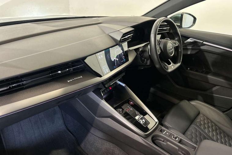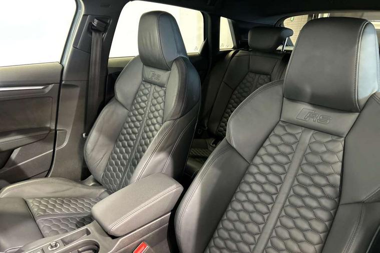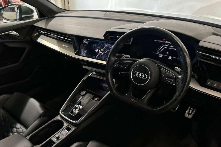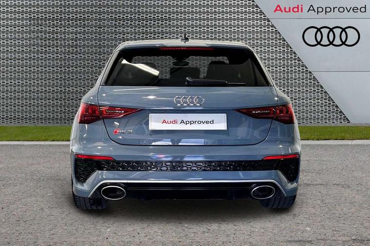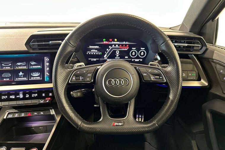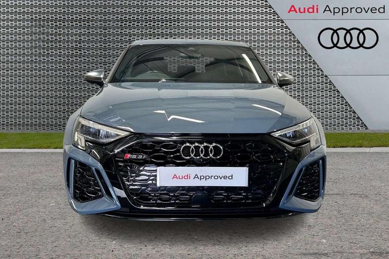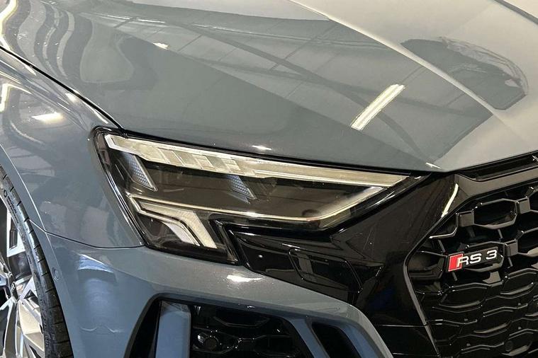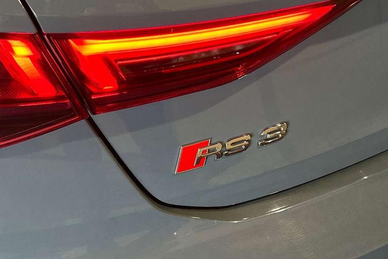 Audi smartphone interface, Audi virtual cockpit with RS specific display 12.3" full colour digital instrument cluster, Automatic start/stop system with recuperation, Bluetooth interface, Collision avoidance assistant, Emergency e-call, Lane departure warning system, Legal emergency call, Manual boot opening, Parking assist with parking system plus, Progressive power assisted steering, Quattro permanent four wheel drive, Rear suspension, Audi sound system impressive sound with 10 loudspeakers including centre speaker and subwoofer, 6-channel amplifier with a total output of 180 watts, DAB Digital radio, 3rd brake light, Acoustic glass windscreen, Audi beam uses LEDs to project the Audi sport logo onto the ground as you exit your RS 3, Auto dimming rear view mirror, Black side skirts, Body colour roof, Daytime running lights, Door mirrors - electrically adjustable, heated, folding and auto dimming on both sides, Headlight washers, LED headlights with LED rear lights + dynamic rear indicators, Light and rain sensors, Matt aluminium door mirrors, Matt aluminium window trims, Privacy glass - dark tinted rear and rear side windows from B-pillar backwards, Rear side wing doors, Rear window wiper and washer system, 3 seat bench in 2nd row, 40/20/40 split folding rear seat bench, Black cloth headlining, Dual zone electronic climate control, Front and rear headrests, Front centre armrest, Front sports seats RS embossed logo, Front/rear floor mats, Heated front seats, Honeycomb stitching and RS embossing, Illuminated door sill trims inlays in aluminium with RS 3 logo, Illuminated vanity mirror, Manually adjustable front seats, RS emblems, Single front passenger seat, Stainless steel pedals and front footrest in black, Aluminium interior elements pack - RS3, Ambient lighting pack - RS3, MMI navigation plus with MMI touch - RS3, RS bodystyling - RS3, Storage Pack - RS3, 3x3 point rear seat belts, ABS/EBD, ASR, Audi pre sense front, Driver/Front Passenger airbags, EDL, ESC - Electronic Stability Control + traction control, Front passenger airbag deactivation, Front side airbags with head airbags and interaction airbag, Hill hold assist, Seat belt reminder with passenger presence detection in rear, Tyre pressure loss indicator, Warning triangle and first aid kit, Anti theft alarm, Anti-theft wheel bolts, Electronically operated child lock, Remote control central locking, Carbon inlays, accent surfaces in the dashboard and centre console in platinum grey silk effect paint finish, 19" 10 Y spoke platinum grey, gloss turned finish alloy wheels, Tool kit, Tyre repair kit,