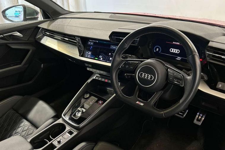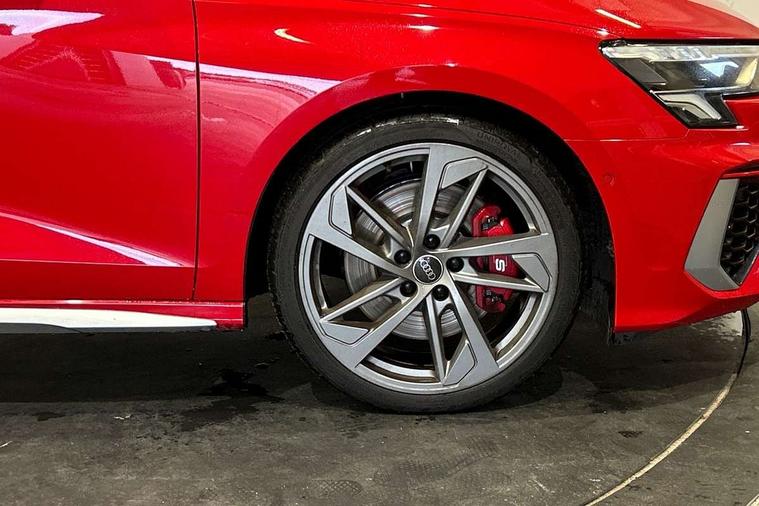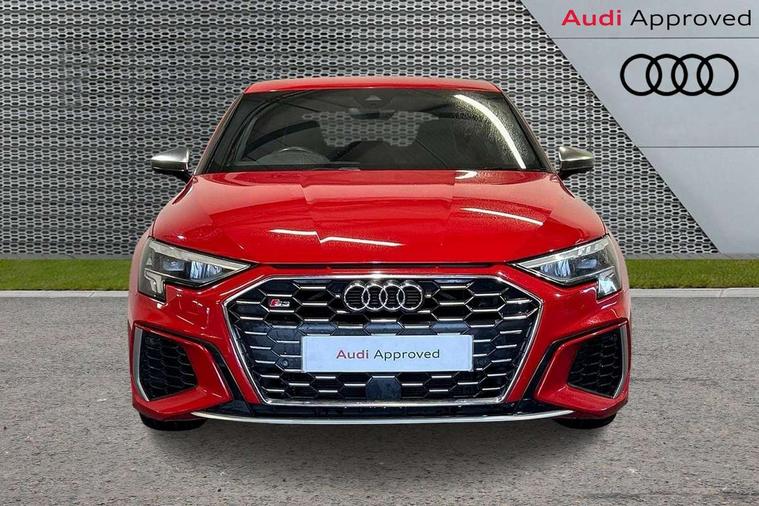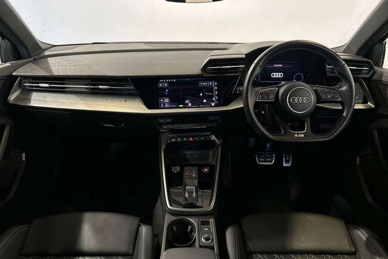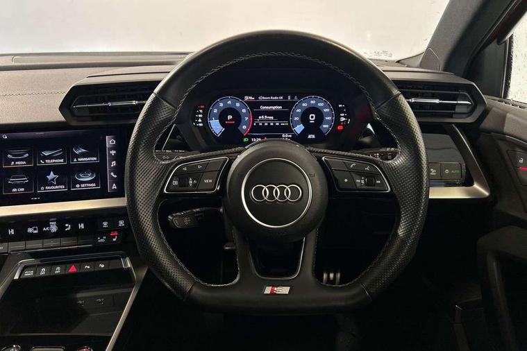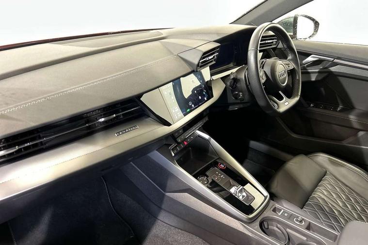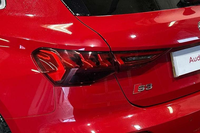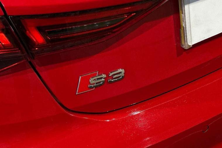 Audi connect emergency call and service, Audi drive select (Auto, Comfort, Dynamic, Efficiency and Individual), Audi smartphone interface, Audi Virtual Cockpit - 10.25" digital and colour instrument cluster, Automatic start/stop system with recuperation, Bluetooth interface, Collision avoidance assistant, Lane departure warning system, MMI Navigation Plus with high resolution 10.1" colour touch screen display, Progressive steering, Service indicator, Trip computer, Voice control system with natural language interaction, Quattro permanent all wheel drive, S sports suspension, 2xUSB-C connection with data and charging functions, 6 passive loudspeakers, DAB Digital radio, Acoustic glass windscreen, Aluminium window trim, Audi Beam uses LEDs to project the Audi S3 logo, Auto dimming frameless rear view mirror, Dual branch oval twin tailpipes in chrome plated finish, Electrically adjustable/heated/folding/auto dimming door mirrors with integrated LED indications + kerb view function for passenger side, Front electric windows, Headlight washers, Illuminated aluminium inserts front door sills with S logo, LED daytime running lights, LED headlights with LED rear lights and dynamic rear indicators, Light and rain sensors, Privacy glass - dark tinted rear window, rear door and side windows, Rear electric windows, Rear side air outlets in grained matt black, Rear wiper, 12V socket and storage compartment in front centre console, 40/20/40 split folding rear seat bench with cupholder, Black cloth headlining, Dual zone electronic climate control, Front and rear centre armrest in leather, Front and rear headrests, Front/rear floor mats, Heated front seats, Height and reach adjustable steering wheel, Interior lighting - glove compartment light and right hand side, Luggage compartment floor covering, Manually adjustable front seats, Seat side bolsters, Stainless steel pedals and front footrest, Aluminium interior elements pack - A3 Sportback, Design body styling - A3 Sportback, Storage pack - A3 Sportback, 3x3 point rear seat belts, Driver and front passenger airbag with passenger airbag deactivation, Electronic Stabilisation Control (ESC) including ABS, ASR and EDL, First aid kit with warning triangle and 2 safety vests, Front side airbags with head airbags and interaction airbag, Hill hold assist, Pre-sense front with pedestrian and cyclist detection, Seatbelt monitoring, Tyre pressure loss indicator, Anti theft alarm, Anti-theft wheel bolts, Electronically operated child lock, Immobiliser, Remote control central locking, Accent surfaces in the dashboard and centre console in platinum grey silk effect paint finish, Dark spectrum aluminium inlays,