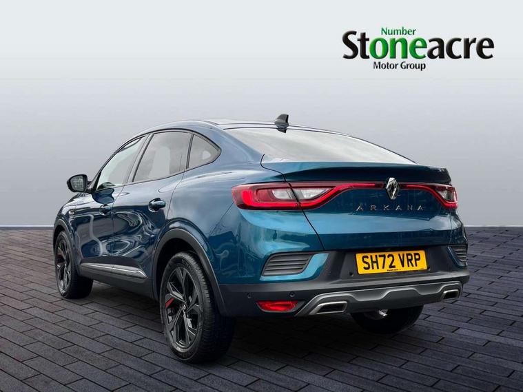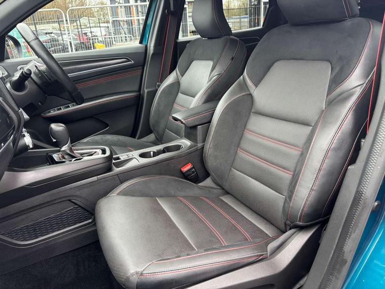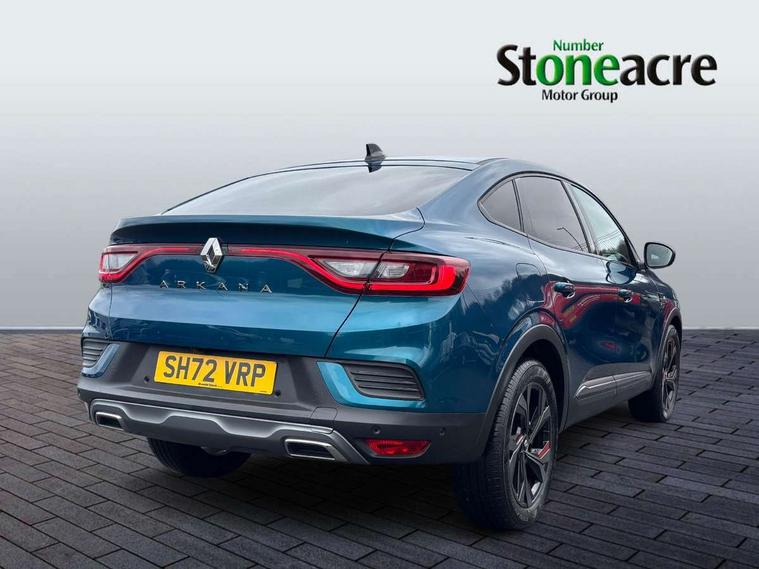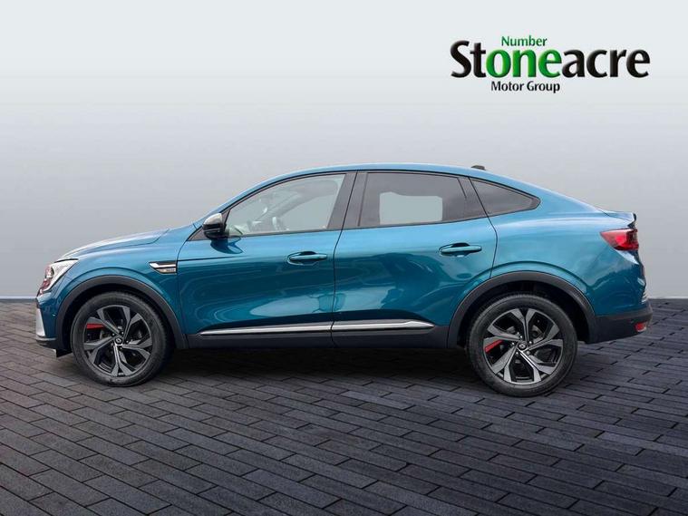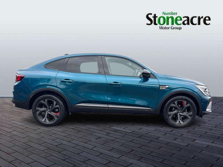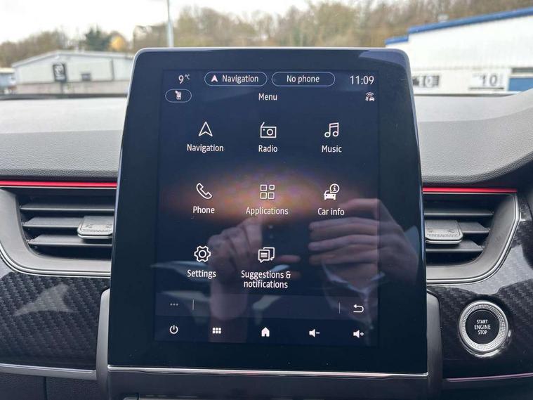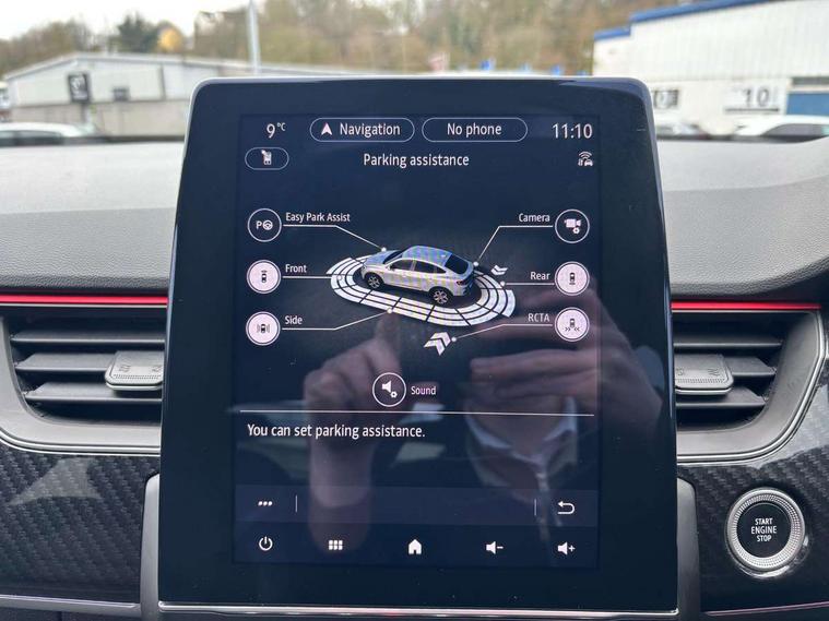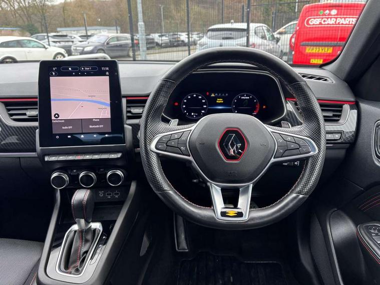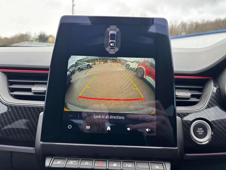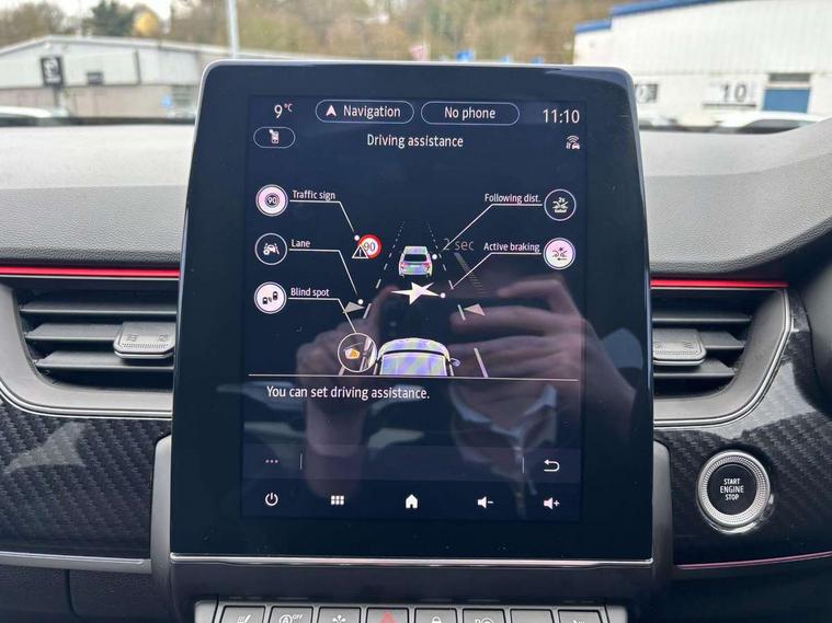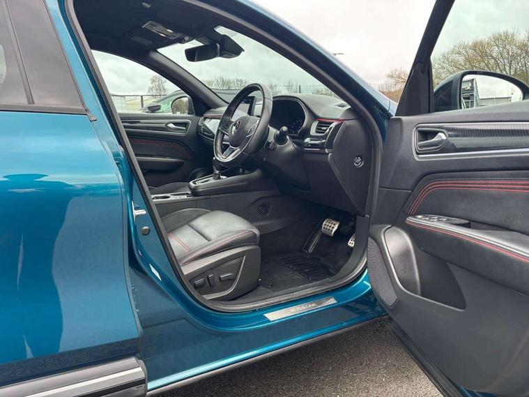 10" TFT Driver information display, Adaptive cruise control and speed limiter, Blind spot warning, Bluetooth system, EASY LINK 9.3" portrait touchscreen with navigation, Google search and traffic information, Eco mode, Front and rear parking sensors, Gear change indicator, Lane departure warning, Lane keep assist, Multi-sense - 3 driving modes and 8 ambient lighting, Rear cross traffic alert, Rear view camera, Renault automatic emergency assist, Smartphone integration compatible with Apple CarPlay and Android Auto, Traffic sign recognition with over speed warning, Trip computer, Variable assistance electric power steering, Wireless phone charger, Arkamys classic sound system with 6 speakers, DAB radio, USB port, 3rd brake light, Auto dimming rear view mirror, Automatic full LED headlights, Automatic headlights, Automatic high / low beam, Automatic windscreen wipers with rain sensor, Black door mirrors, Black side door protection with gun metal insert, Body colour rear boot spoiler, Body coloured bumpers, C-shaped LED front signature lighting (333 high), Chrome decopart on wing (fender molding) with R.S. Line badge, Double chromed exhaust tailpipes elements, Extra tinted rear windows and tailgate, Frameless rear view mirror, Front and rear electric windows, Front bumper with F1 blade and honeycomb front grille, Front driver window with one touch facility and anti-pinch function, Front grille with chrome on upper part, Glossy black door mirror and lower window lining, Gun Metal front and rear skid plates, Heated rear window, R.S. Line badges on front wing and hatch door, Rear windscreen wiper, Shiny black shark fin antenna, 3 seat bench in 2nd row, 60:40 split and fixed base rear seats, Aluminium pedals, Automatic climate control with combined filter, humidity sensor and AQS, Black interior roof lining, Carbon style dashboard, Central console with storage, Front and rear head restraints, Heated front seats, Heated steering wheel, Height and reach adjustable steering wheel, ISOFIX child seat fixing points on rear outermost seats, LED front and rear roof lights, Power adjustable driver and passenger seat with lumbar adjustable drivers seat, R.S. line black suede-leather upholstery with red/grey stiching, R.S. Line perforated leather steering wheel with red/black harmony and R.S. Line badge, Rear air vents, Red inserts on air vents, Single front passenger seat, Variable boot floor, Parking Pack - Hands-free parking & flank protection - Arkana, 3x3 point rear seat belts, ABS+EBA, Active emergency braking system, Distance warning alert, Driver airbag, Driver and passenger front and side airbag deactivation, Driver and passenger side airbags, Driver height adjustable seat belt, Electronic parking brake with auto hold, ESC (Electronic Stability Control), Front and rear no seatbelt warning sound, Front curtain airbags, Front head airbags, Hill start assist, Passenger airbag, Tyre pressure warning light, Anti drill door locks and locking fuel cap, Central door locking, Deadlocking system, Hands free keycard with Keyless access and start, RAID (Renault Anti-Intruder Device) automatic door locking, Rear side wing door and window child locking function (front driver door control panel), Thatcham alarm, 18" Silverstone diamond alloy wheels with red inserts,