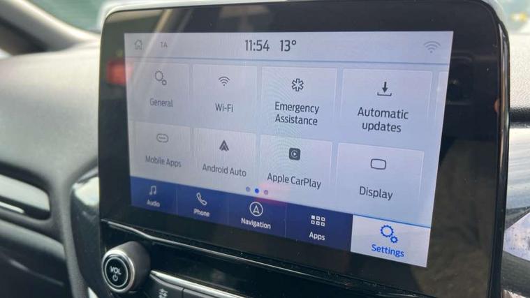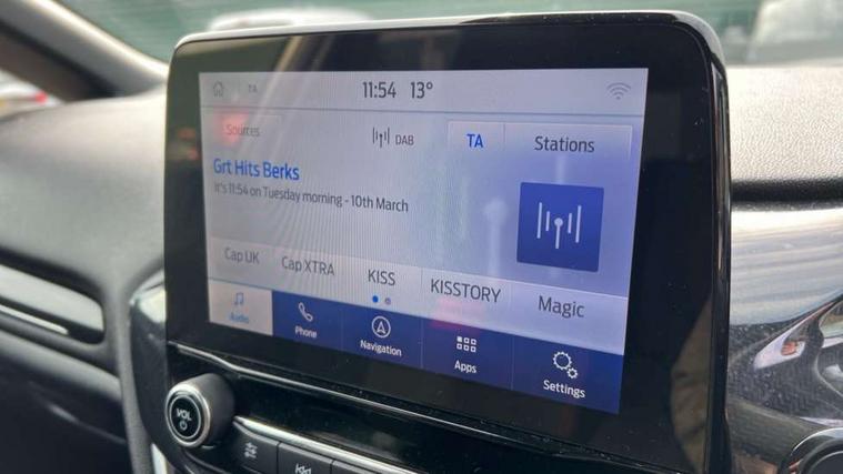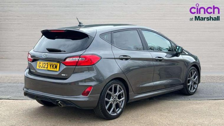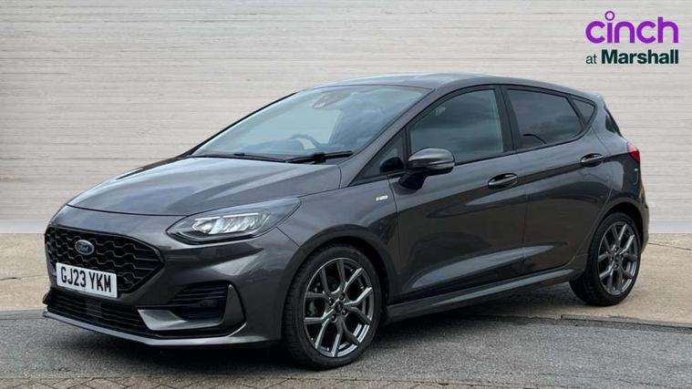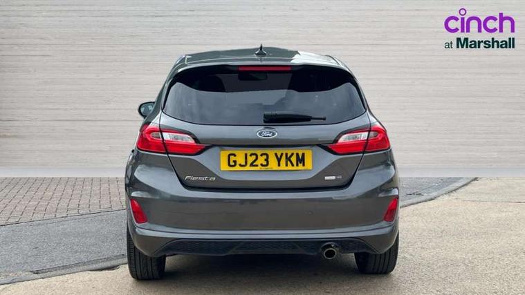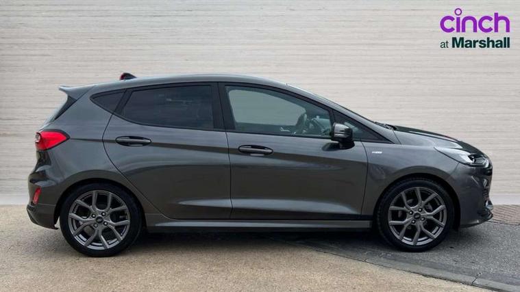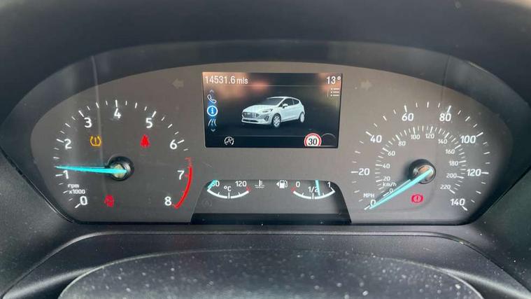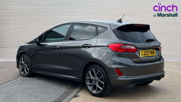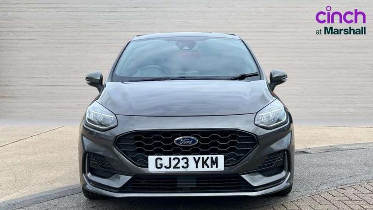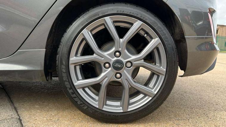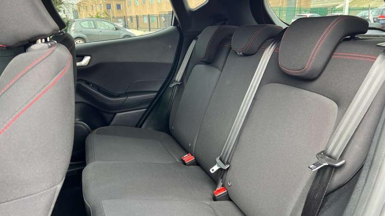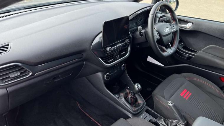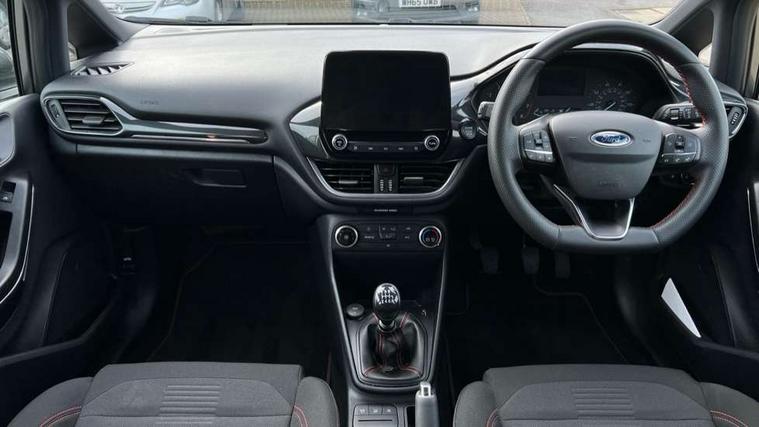 Bluetooth system, Electric power steering, Ford easy fuel, Ford SYNC 3 Navigation system incl 8" touchscreen, 7 speakers, FordPass connect, Apple carplay, android auto, voice control and emergency assistance, Rear parking distance sensors, Selectable drive modes (Normal, Sport, Track), Trip computer, Sports suspension, 2 USB ports, Auxiliary input socket, DAB Digital radio, Steering wheel mounted controls, Body colour bumpers, Body colour door handles, Body colour large rear spoiler, Body coloured electrically operated and heated door mirrors with side indicators, Cornering front fog lights, Electric front windows/one touch facility, Electric rear windows, LED Night signature to rear lights, Quickclear heated windscreen, Rain sensing wipers and auto dimming rear view mirror, Rear privacy glass, Rear wiper, Unique ST-Line upper grille & full bodystyling kit with ST-Line wing badges, 3 spoke flat bottomed leather steering wheel, 60/40 split folding rear seat, Adjustable head restraints, Black headlining, Boot carpet, Centre console with opening armrest, 2x cupholders, 12v and USB, Chrome inner door handles, Cloth upholstery, Footwell illumination, Front floor mats in velour, Front map reading lights, Front seat and rear pockets, Illuminated glovebox, Leather gaiter, Load area light, Manual 2 way passenger seat adjust, Manual 4-way driver seat adjust, Manual air conditioning, Overhead console with sunglasses holder, Pollen filter, Rake/reach adjustable steering wheel, Sensico wrapped steering wheel, Sports front seats, NCAP Pack - Fiesta, 3 point seatbelts on all rear seats, ABS+EBA, Curtain airbags, Driver and passenger airbags, Drivers knee airbag, Electronic stability control with hill start assist, Front passenger airbag deactivation, Front side airbags, Seatbelt warning, Two tone horn, Tyre pressure monitoring system, Keyless start with 'Ford Power' starter button, MyKey system, Remote central locking & engine immobiliser, Thatcham Cat.1 alarm, 17" 5 spoke alloy wheels with rock metallic finish,