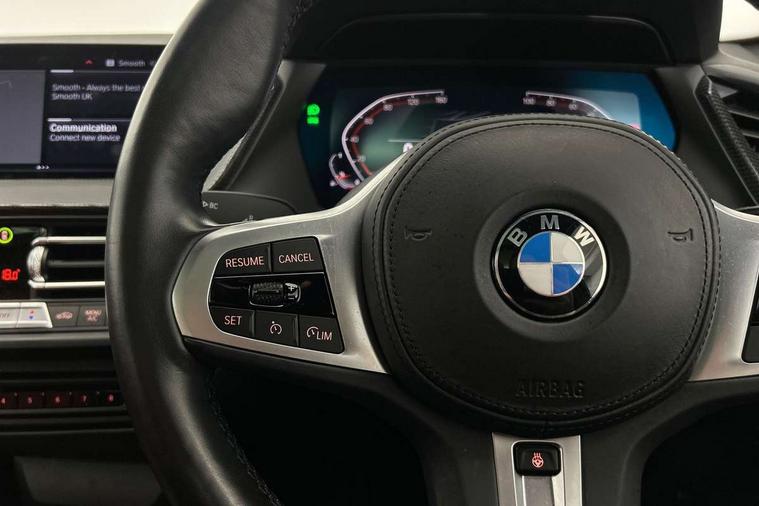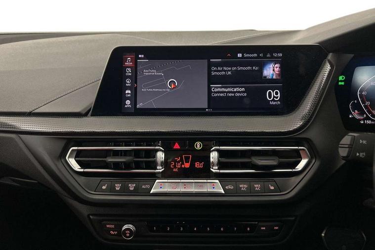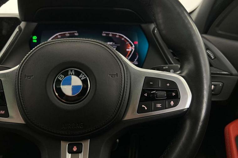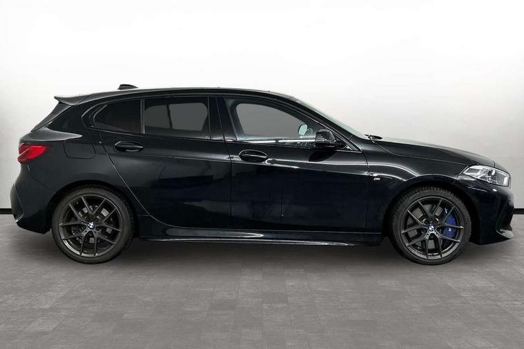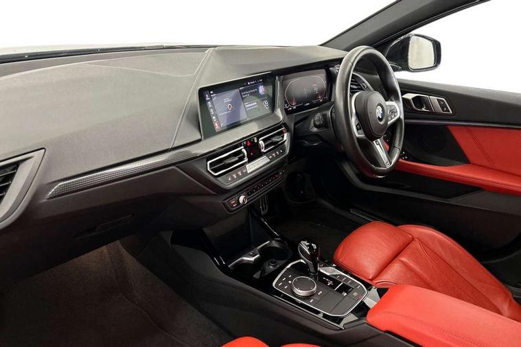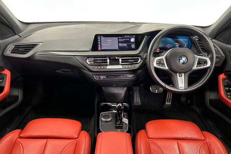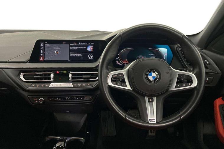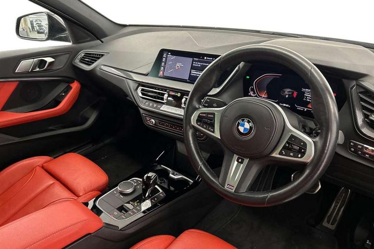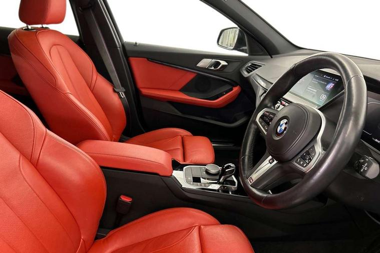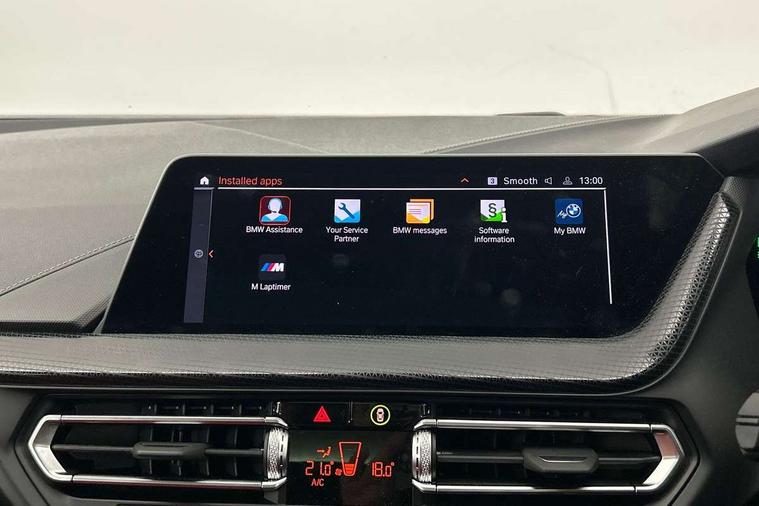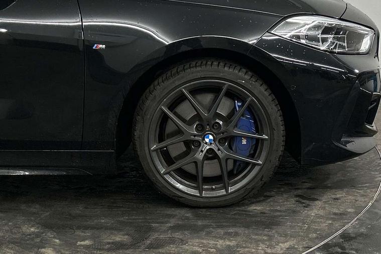 Active guard plus, Attentiveness assist, Bluetooth / WiFi interface for wireless connection of mobile terminal devices and audio streaming, BMW ConnectedDrive online services, BMW Teleservices, Check Control warning system for monitoring of lights and door/luggage compartment open warning, Cruise control with brake assist, Eco pro mode, Front axle single joint with specific axle kinematics to minimise drive influences on steering + provide increased rigidity agile driving behaviour, Integrated owners handbook, Lane departure warning system, Oil sensor for level and grade, On board computer, Optimum shift indicator, Personal Profile, Pull away assistant, Rigidly mounted rear subframe - Multi link construction with separate spring / damper configuration and excellent driving characteristics, Speed limit Info including no-overtaking indicator, Speed limiter, Aluminium lightweight construction, Anti roll bar front and rear, Balancer shaft, Double VANOS twin scroll turbocharging system, Drive Performance Control, Electronic differential lock, High precision injection, M sport suspension, Petrol Particulate Filter, Twin tube gas filled shock absorbers with degressive characteristic curve, VALVETRONIC engine management, DAB Digital radio, Auto dimming rear view mirror, Automatic headlight beam throw control, Automatic windscreen wipers and automatic headlight, Body colour door handles, Body colour mirror caps, Body colour roof trims, Chrome 'M' logo side designation, Chrome exhaust twin tailpipes round 90mm in left, Chrome kidney grille frame with Satin Aluminium struts, Direction indicator side lights in exterior mirrors, Fading support, Folding side mirrors with auto dimming/folding wing mirrors with auto dimming, Follow me home headlights, Front and rear bumper system with replaceable deformation elements, Front and rear electric windows with open and close fingertip control, anti trap facility and comfort closing, Front door sill finishers in black plastic with M designation in metallic look, Green tinted heat protection glazing, Heated, electrically adjustable exterior mirror aspheric on driver side, convex on passenger side, High gloss shadowline window frame, Recess cover mirror frames and B/C pillar embelisher trim, High level third brake light, Integrated front windscreen with washer jets, LED daytime running lights, LED eyebrow turn indicators, LED front fog lights, Lightweight engineering, Matt black air guide grilles, Matt black wheel arch trim, Model designation on electric bootlid, Nearside reverse light in rear light cluster, Preparation for high beam assistant, Rear fog lights, Rear side wing doors, Rear window wiper, Shark fin antenna, Trailer stabilisation logic, Visible VIN plate, Welcome lighting, 12V power socket in front centre console with blanking plug, 3 rear seat head restraints, 3 seat bench in 2nd row, 3 spoke sports leather steering wheel with black leather and stitching, pearl chrome decorative finish, specific M Badge, Ambient interior lighting, Anthracite headlining, Child seat ISOFIX attachment for two outer rear seats and front passenger seat with anchorage points, Conditioned based service, Driver and front passenger seat heating, Floor mats in anthracite velour with contrasting colour seam to match contrast stitching on instrument panel, Folding rear clothes hook, Four grab handles integrated in roof lining, Front and rear door pockets with bottle holders, Front and rear side armrest integrated into door trim, Front armrest, Front sports seats, Glove compartment, Height adjustable front head restraints, Luggage compartment for bag hooks on left and right, foldable luggage compartment liner and two lashing eyelets, Manual adjust steering wheel, Multi-function controls for steering wheel, Single front passenger seat, Storage compartment in centre console, Sun visors with vanity mirrors and insert tab, Two front centre console cupholders, Two zone automatic air conditioning, Additional interior lighting pack - 1 Series, Additional storage compartment pack with code 493 -1 series, BMW live cockpit professional pack- 1 Series, Connected pack professional - 1 Series, Interior lights pack - 1 Series, M Sport exterior styling aerodynamics pack - 1 Series, 2 tone horn, 3 point seatbelts on all seats, front pyrotechnic belt tensioners, stopper and belt force limiters, rear coded belt buckles, Airbags - Front driver/passenger, front and rear curtain head protection, front side, manual deactivation of front passenger airbag, Anti lock braking system (ABS) with brake assist, BMW emergency call, Brake drying, Braking readiness, Child proof locking system in rear door, City braking function, Comfort modes, Cornering brake control, Crash sensor activating central locking release, hazard warning lights, fuel cut off, interior lighting + activation of safety battery terminal clamp, Driver and front passenger seat belt security check, Dynamic stability control + (DSC+), Dynamic Traction Control - DTC, Electrically operated hand brake including automatic hold function, Front and rear disc brakes, Seatbelt warning, Side impact protection, Tyre pressure monitoring system, Warning triangle and first aid kit, Central locking switch for all doors, fuel filler cap and luggage compartment, Deadlocking function system to all doors, Drive away locking system on all doors and luggage compartment with de-activated in iDrive settings, Locking wheel bolts, Remote control with integrated key with High-gloss Black inlay and M designation and 1 button for open/ close lock, window, open luggage compartment, Start/stop button illuminated in centre console with keyless engine start and auto start stop deactivation button, Thatcham Cat.1 alarm and immobiliser, Wheel slip limitation close to the actuator (ARB), Contrast stitching on instrument panel, Electrically powered 12V compressor, Reduced rolling resistance tyres,