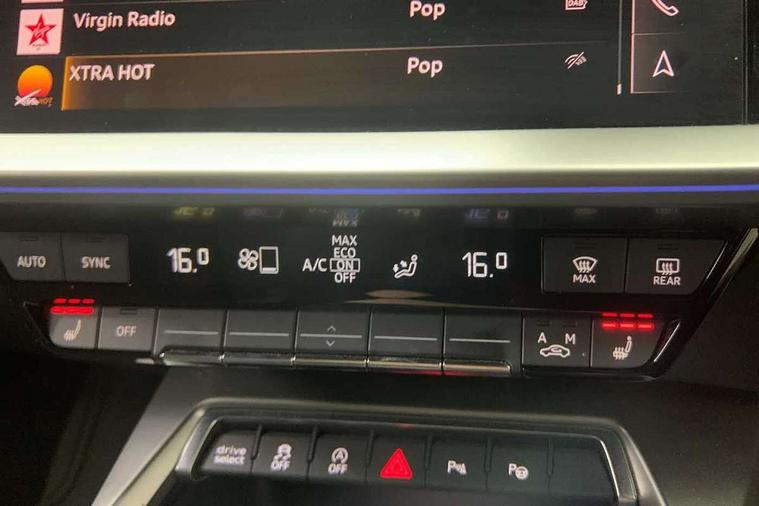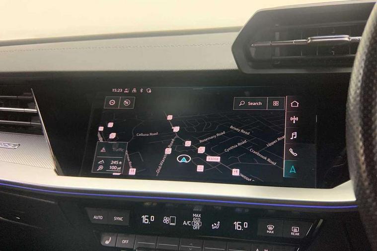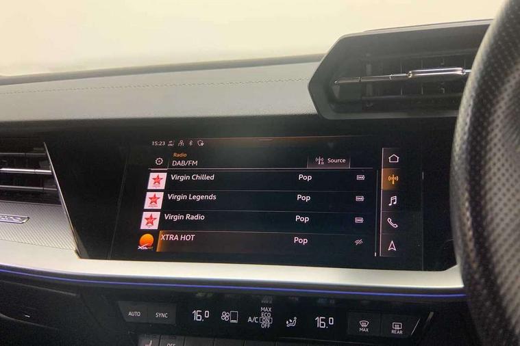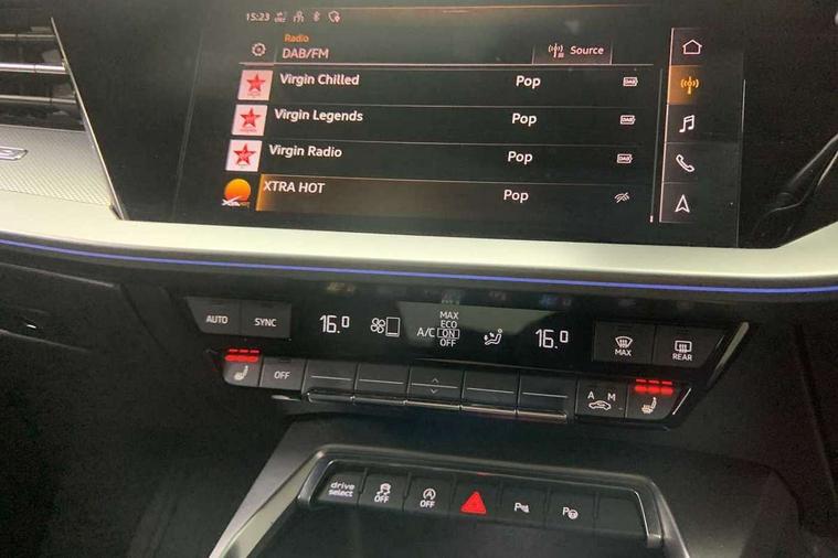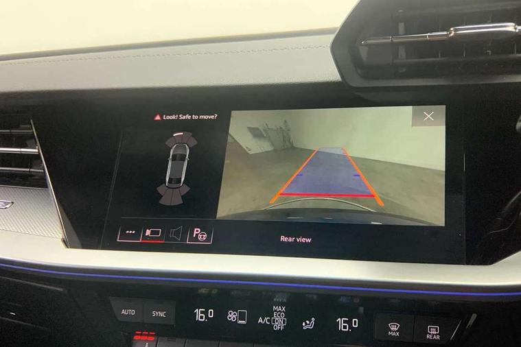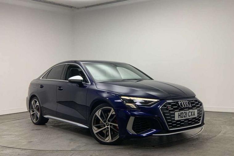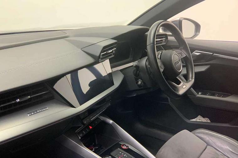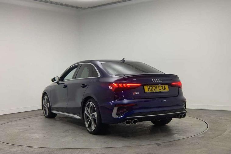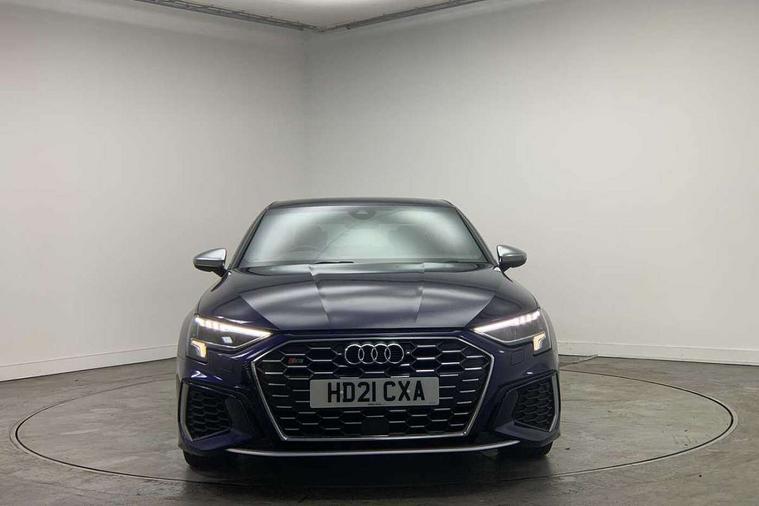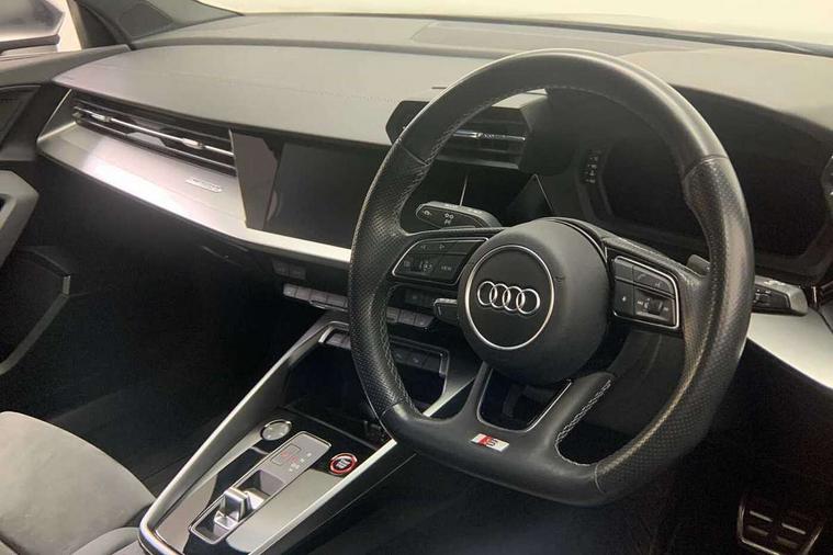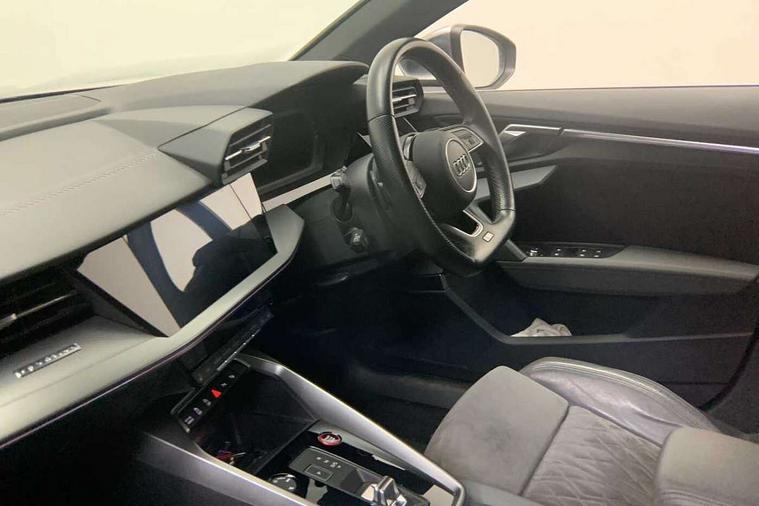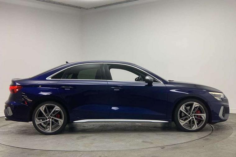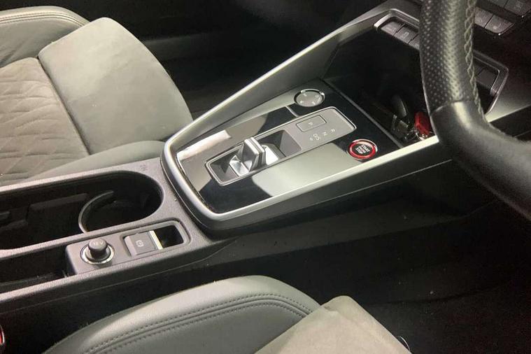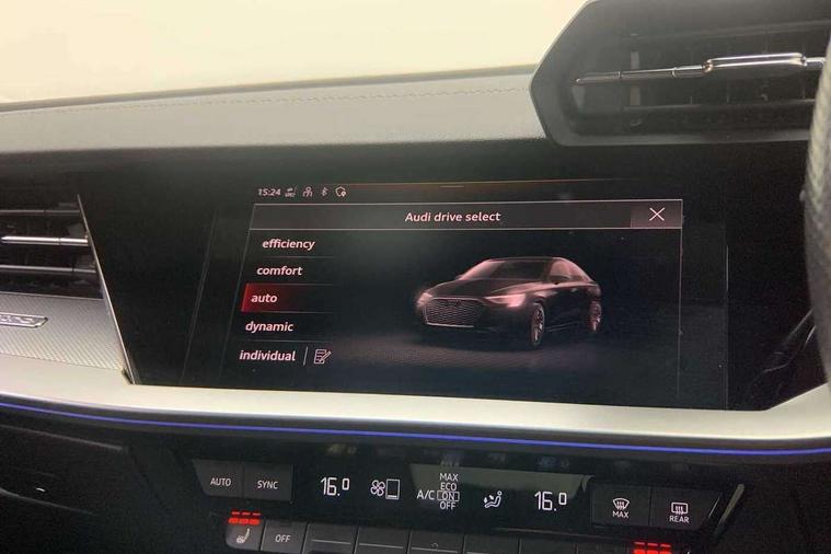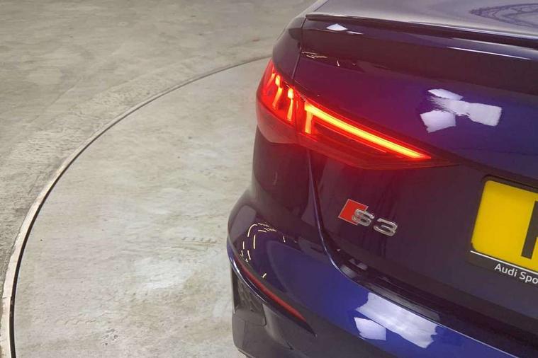 Audi connect emergency call and service, Audi drive select (Auto, Comfort, Dynamic, Efficiency and Individual), Audi smartphone interface, Audi Virtual Cockpit - 10.25" digital and colour instrument cluster, Automatic start/stop system with recuperation, Bluetooth interface, Collision avoidance assistant, Lane departure warning system, MMI Navigation Plus with high resolution 10.1" colour touch screen display, Progressive steering, Service indicator, Voice control system with natural language interaction, Quattro permanent all wheel drive, S sport suspension with spring damper adjustment and lowering by 15mm, 2x USB Type C ports (for charging and data transfer), 6 passive loudspeakers, CD player, DAB Digital radio, Acoustic glass windscreen, Audi Beam uses LEDs to project the Audi logo onto the ground as you exit your S3, Auto dimming frameless rear view mirror, Dual branch oval twin tailpipes in chrome plated finish, Electrically adjustable/heated/folding/auto dimming door mirrors with integrated LED indications + kerb view function for passenger side, Front electric windows, Headlight washers, Illuminated door sills with aluminium inserts at the front with S logo, LED daytime running lights, LED headlights with LED rear lights and dynamic rear indicators, Light and rain sensors, Model and engine designation badges at rear, Privacy glass - dark tinted rear window, rear door and side windows, Rear electric windows, 12V socket and storage compartment in front centre console, 40/20/40 split folding rear seat bench with cupholder, Black cloth headlining, Dual zone electronic climate control, Front and rear centre armrest in leather, Front and rear headrests, Front/rear floor mats, Heated front seats, Height and reach adjustable steering wheel, Interior lighting - glove compartment light and right hand side, Luggage compartment floor covering, Manual boot compartment lid, Seat side bolsters, Stainless steel pedals and front footrest, Body styling design pack - S3, Storage pack - A3/S3 Saloon, 3x3 point rear seat belts, Driver and front passenger airbag with passenger airbag deactivation, Electronic Stabilisation Control (ESC) including ABS, ASR and EDL, First aid kit with warning triangle and 2 safety vests, Front side airbags with head airbags and interaction airbag, Hill hold assist, Pre-sense front with pedestrian and cyclist detection, Seatbelt monitoring, Tyre pressure loss indicator, Anti theft alarm, Anti-theft wheel bolts, Electronically operated child lock, Immobiliser, Remote control central locking, Aluminium air vent surrounds, Aluminium trim elements, Dark spectrum aluminium inlays, accent surfaces in the dashboard and centre console in platinum grey silk effect paint finish,