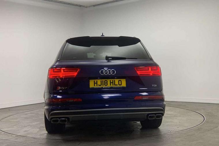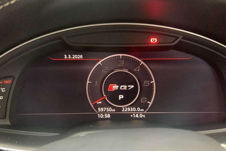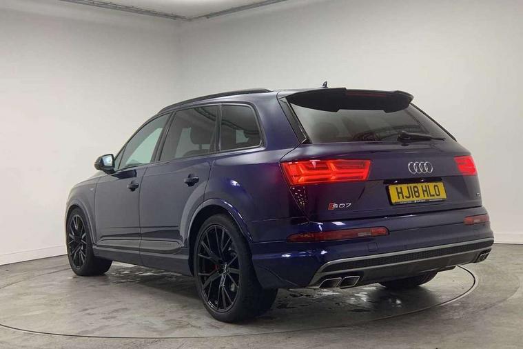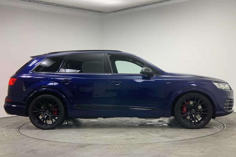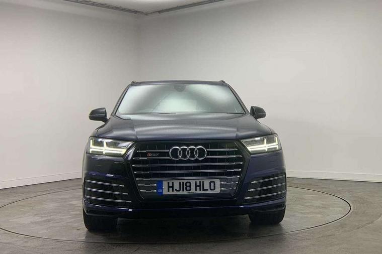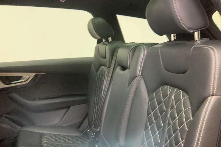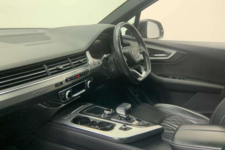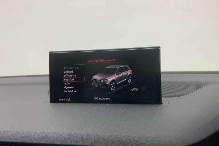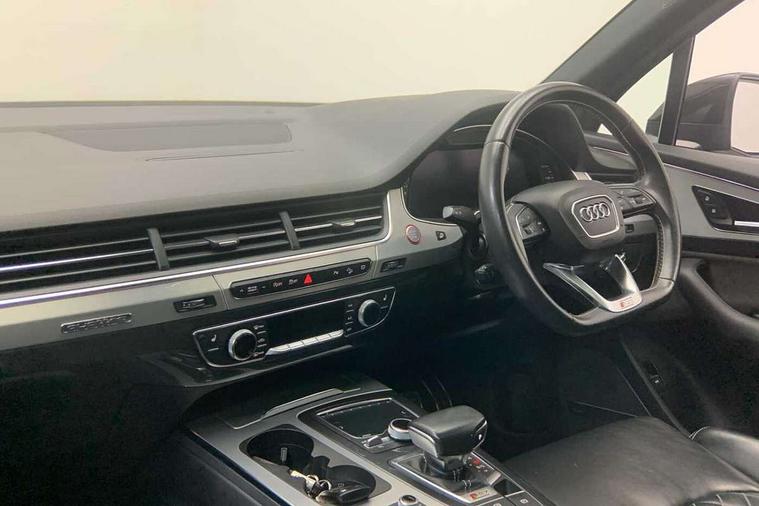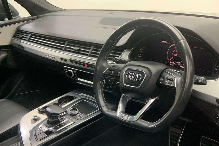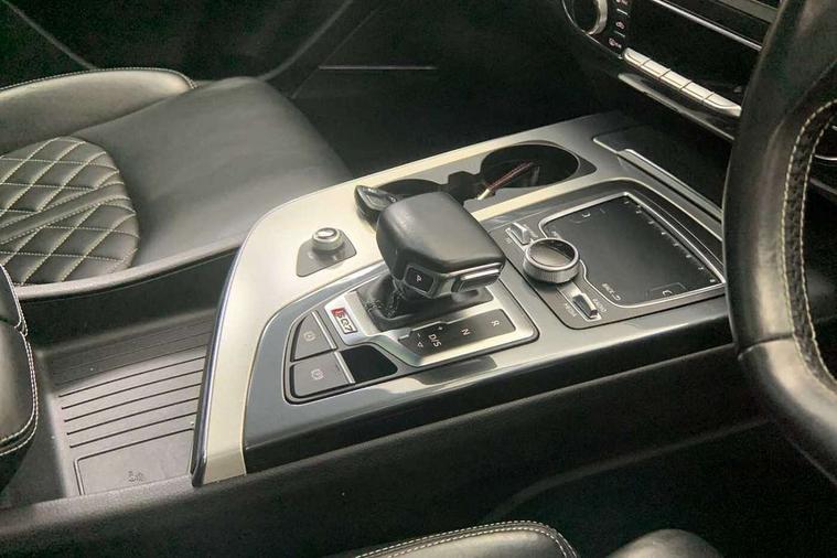 Audi drive select, Audi smartphone interface, MMI - Multi Media Interface control system, MMI navigation plus with touch and 8" colour display, DVD, SD card reader, 10GB music storage, Mobile phone preparation with bluetooth interface, Remote electric boot opening/closing, Service interval indicator, Servotronic speed related PAS, Speed limiter, Voice control system, 85 litre fuel tank, Adaptive air suspension, 2 USB ports, Audi music interface, Aux-in socket, DAB digital radio module, MMI radio plus, Acoustic windscreen, Active exhaust sound system, Aluminium effect front grille, Audi Beam uses LEDs to project the Audi Sport logo, Auto dimming rear view mirror, Body coloured bumpers, Dual branch oval twin exhaust tailpipes, Dynamic rear indicators, Electric front+rear windows, Headlight washers, High beam assist, LED daytime running lights, LED tail lights, Loading sill protector in stainless steel, Platinum grey front lip spoiler, Rain and light sensors, Rear wiper, Roof spoiler, S body styling, 2 cupholders in front centre console, 35/30/35 split fold 2nd row seats, 4 way electrically adjustable lumbar support for drivers seat, 4 way electrically adjustable lumbar support for front passenger seat, Aluminium scuff plates, Door sill trims with S line logo, Electric 3rd row 50/50 split/fold, Electric adjustable front seats, Four zone electronic climate control, Front ashtray and cigar lighter, Front centre comfort armrest with storage + cupholders, Front head restraints, Front/rear floor mats, Gearshift paddles, Heated front seats, ISOFIX on front passenger and rear outer seats, Leather gear knob, Rear centre armrest with 2 cupholders, Rear headrests, Stainless steel pedals, Sunvisors with illuminated vanity mirrors, Top tether anchor plate for isofix child seat, Interior light pack - Q7, 3 point seatbelts on all seats, ABS+Electronic Brake force Distribution, Curtain airbags, Driver and passenger airbags, EDL + ASR, Electrically operated child locks on rear doors, Electromechanical parking brake, ESP, Front passenger airbag deactivation, Front side airbags, Hill descent control, Hill hold assist, Seatbelt warning, Traction control, Tyre pressure monitoring system, Warning triangle and first aid kit, Alarm with interior monitoring, Immobiliser, Keyless Go access/ignition system, Locking wheel bolts, Remote central locking, Chrome door inserts, Tool kit, Tyre repair kit,