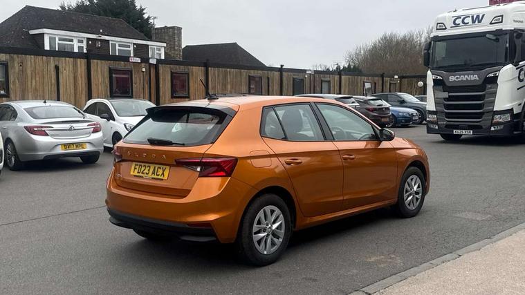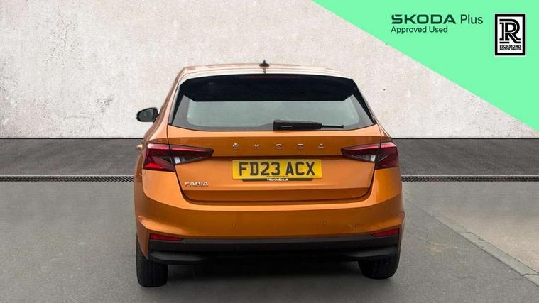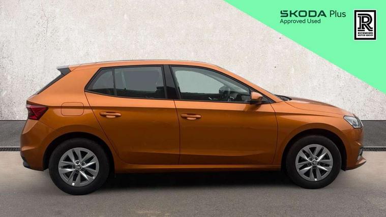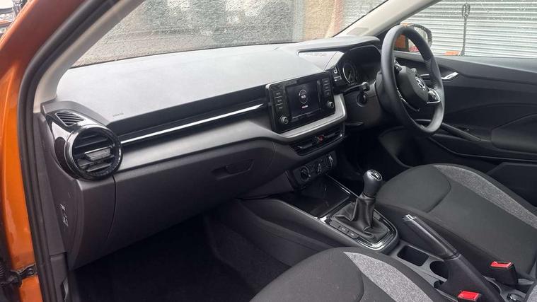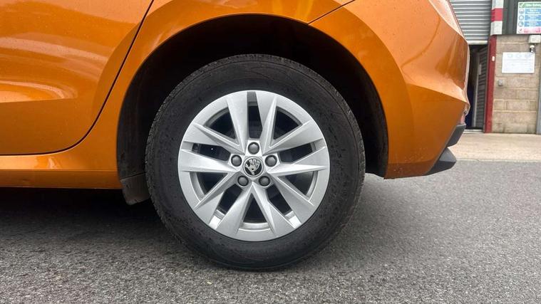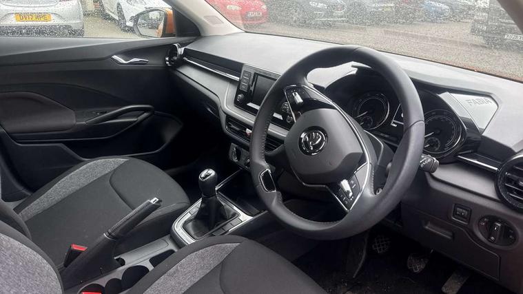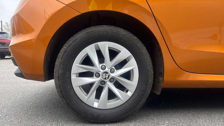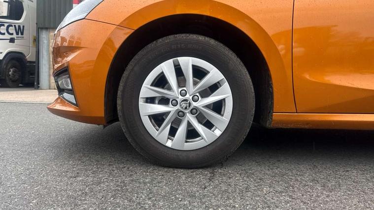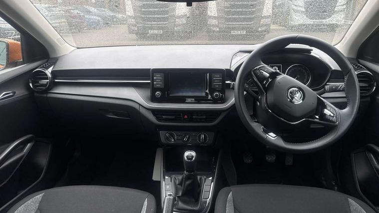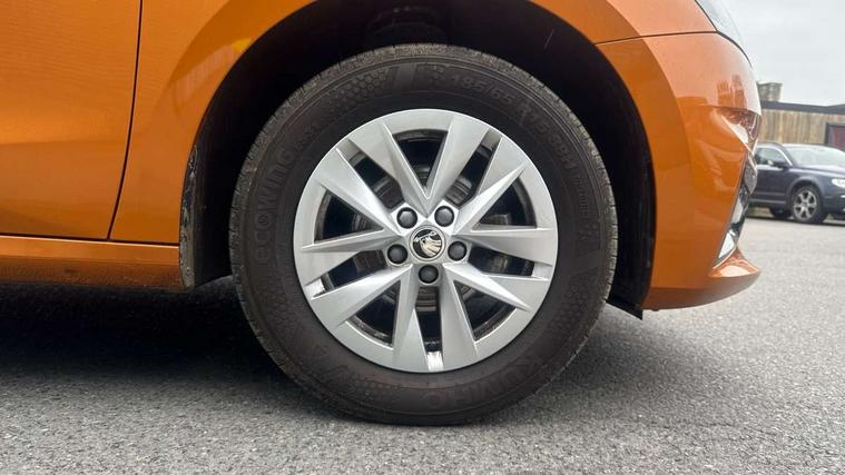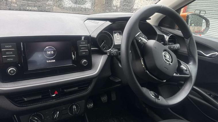 Bluetooth connection, Driver alert system - DAS, Electromechanical power steering, Exterior temperature gauge, Lane assist including road edge detection, Multifunction trip computer in black and white, Service interval indicator, Speed limiter, 2x USB-C in the front (for data transmission and charging), 4 speakers in front, Auxiliary socket for external MP3 player, DAB digital radio reception, Radio Swing with 6.5" colour display, Basic LED Headlights, Basic rear lights, Body colour door mirrors, Body coloured bumpers, Dimming rear view mirror with black frame, Door mirror integrated indicators, Electrically adjustable and heated door mirrors, Electrically adjustable front windows with function auto up/down, Front fog lights, Front window wiper intermittent control, Headlight range control - Automatic, Ice scraper in fuel cap, LED daytime running lights with coming and leaving home feature, Mechanical adjustable rear windows, Rain sensor, Rear LED fog light, Rear side wing doors, Rear window wiper with washing nozzles, Roof mounted spoiler, SKODA tailgate lettering in chrome, Third brake light, 2 reading lights in front and 2 reading lights in rear, 2 spoke leather multifunction steering wheel, 3 rear headrests, Backrest split and folding, Central console with fixed cup holder and storage box, Chrome handbrake release button, Fabric upholstery, Gearshift knob/handle in leather, Grain satin black interior door handles, Hand brake lever handle in leather, Height adjustable front headrests, Height adjustable front seats, Height adjustable steering wheel, ISOFIX and TopTether anchorage points to the outer rear seats, ISOFIX and TopTether on the front passenger seat, Luggage compartment lighting, Manual air conditioning, Manually adjustable lumbar support in front seats, Pollen filter, Rear seat bench unsplit, Single front passenger seat, Storm grey headlining, Sun visors with mirror and airbag label on passenger side, Ticket holder, 3-point height adjustable front seats belts with pretensioner and force limiter, Automatic warning lights in case of crash, Driver and passengers airbag with switch off function, e-Call+, ESC including ABS, MSR, ASR, EDS, HBA and XDS, Front and rear seat belt warning, FRONT ASSIST (AEB City and AEB Inter Urban), Front side airbags, Head airbags, One tone horn, Pedestrian protection, Three rear 3-points safety seat belts with pretensioner and force limiter including stop function for outer rear seat belts, Tyre pressure monitoring system, Anti-theft alarm system including immobiliser, interior monitoring, backup horn, and towing protection, Central locking with radio remote control, interior controls, SAFE function and 2 foldable keys, Black painted air vents, Glossy black decorative trim, Grain satin black central console cover, Grain satin black lower decorative trim, Satin black door and side trim panel in front, Anti-theft wheel bolts protection, Super-low rolling resistance tyres,