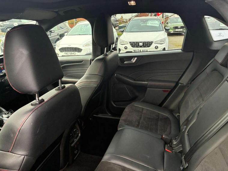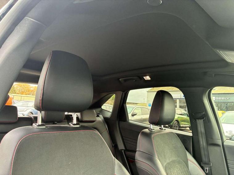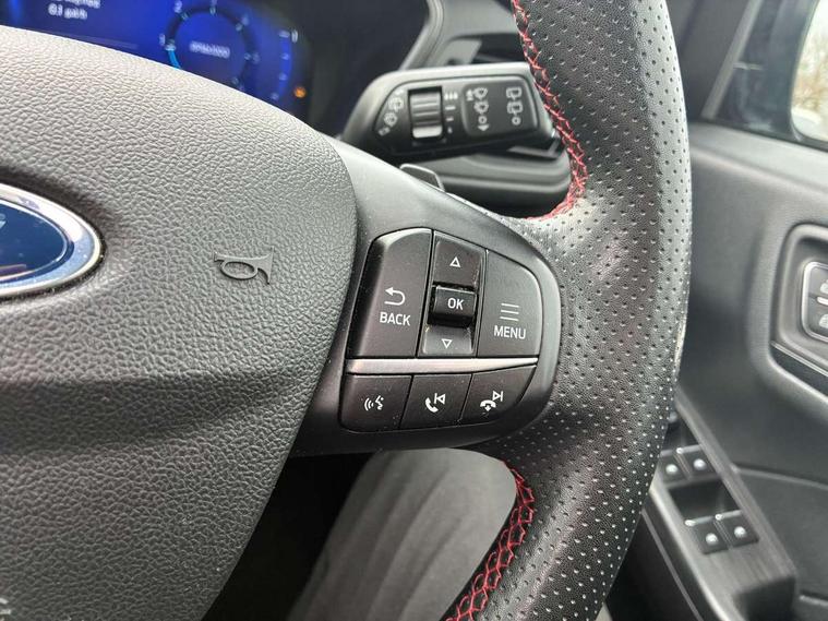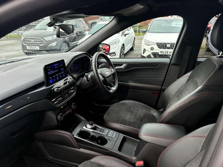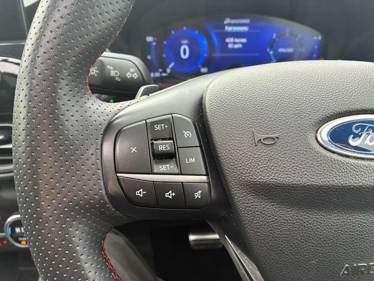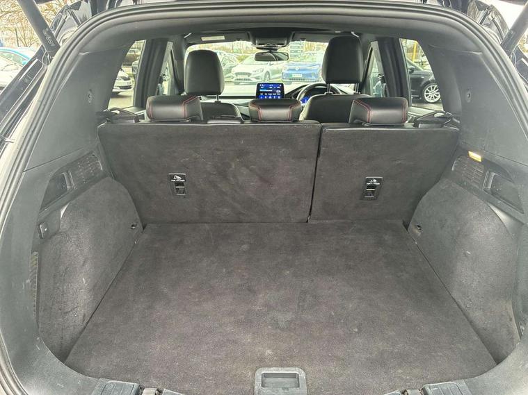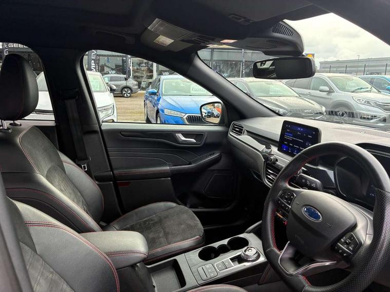 12.3" digital colour instrument cluster, 360 degree view camera, e-Call (emergency call), Ford easy fuel, Ford SYNC 4 Navigation with 13" touchscreen, DAB radio, emergency assistance, Andriod Auto/Apple CarPlay, 5G modem & Ford Pass connect, Front and rear parking sensors, Hands free power tailgate, Lane centering assist, Lane keeping aid with lane departure warning, Power assist steering, Selectable drive modes, Service interval indicator, Sports suspension, Twist beam rear suspension, B&O premium audio system with 10 speakers, subwoofer and 2 USB ports, Auto headlamps with high and low beam, Black roof rails, Body colour bumpers, Front LED fog lamps, Large rear spoiler, LED daytime running lights, LED rear lights, Pop out door edge protectors, Power front/rear windows with global close, Power heated folding door mirrors with puddle lights, memory function and camera, Power opening panoramic roof, Quickclear heated windscreen, Rain sensing wipers, Rear privacy glass, Rear side wing doors, Rear wiper, ST-Line body styling kit, Third brake light, 12 way ergonomic power adjust driver's seat with memory (AGR certified), 12 way ergonomic power adjust passenger seat (AGR certified), 2nd row sliding seats, Electronic automatic temperature control (EATC), Front and rear head restraints, Partial premium touch sensico upholstery, Rear centre head restraint, Single front passenger seat, Sports seats, Driver assistance pack with intelligent adaptive cruise control - Kuga FHEV/PHEV, Winter pack - Kuga, 3x3 point rear seatbelts, Airbags - front driver/passenger, front and rear curtain, Drivers knee airbag, Dynamic brake support, Electronic stability control (ESC) and ABS, Evasive steering assist, Ford MyKey Gen 2 safety system, Manual child proof rear door locks, Pre collision assist with autonomous emergency braking, Rear seat Occupancy alert, Red brake calipers, Tyre pressure monitoring system, Engine immobiliser, Keyless entry and Ford power start button (Keyless start), Locking wheel nuts, Remote powered central double locking doors, Thatcham category 1 alarm,