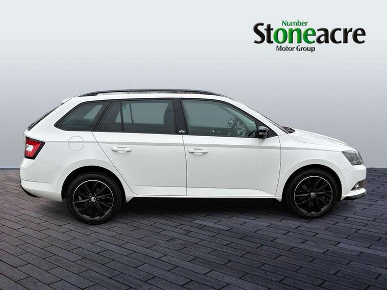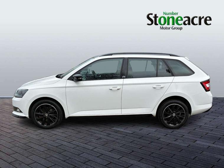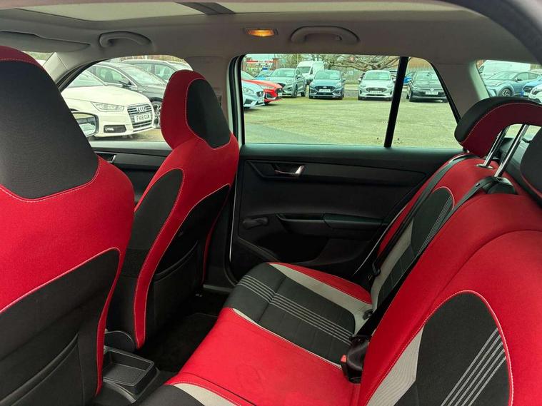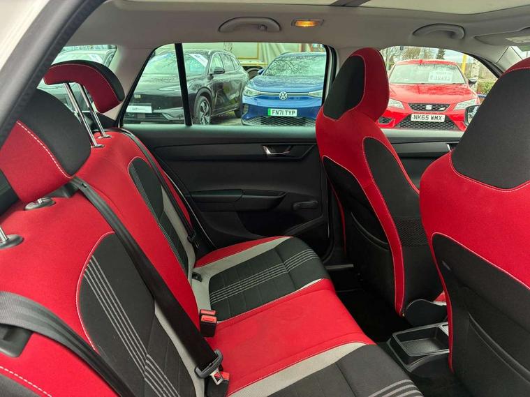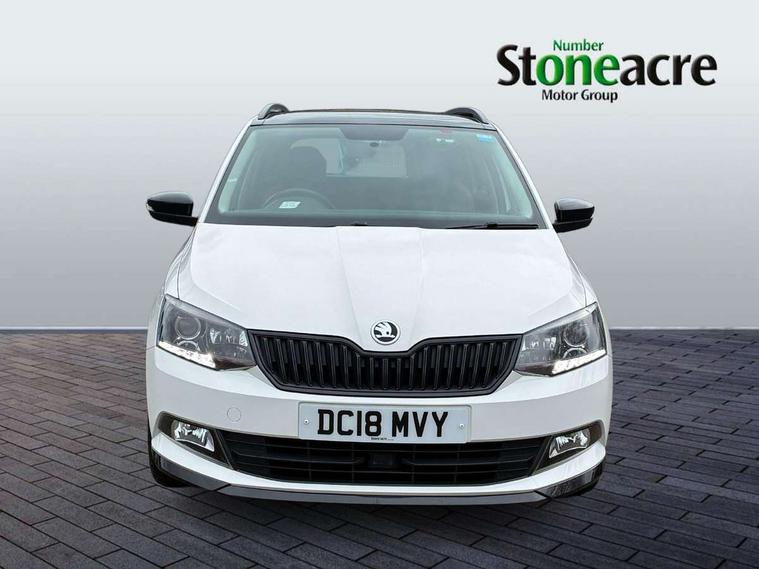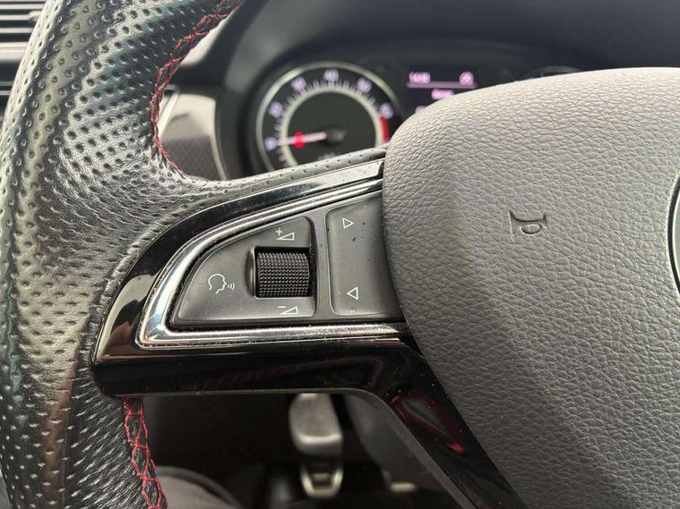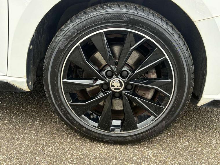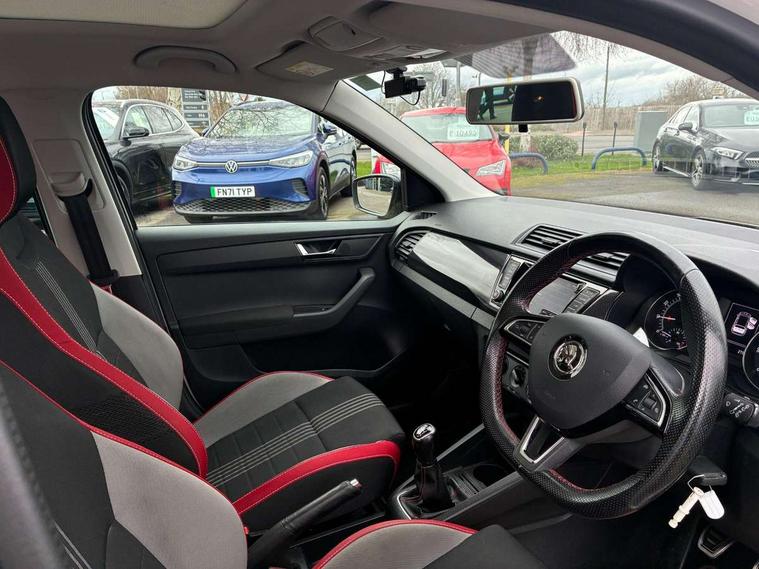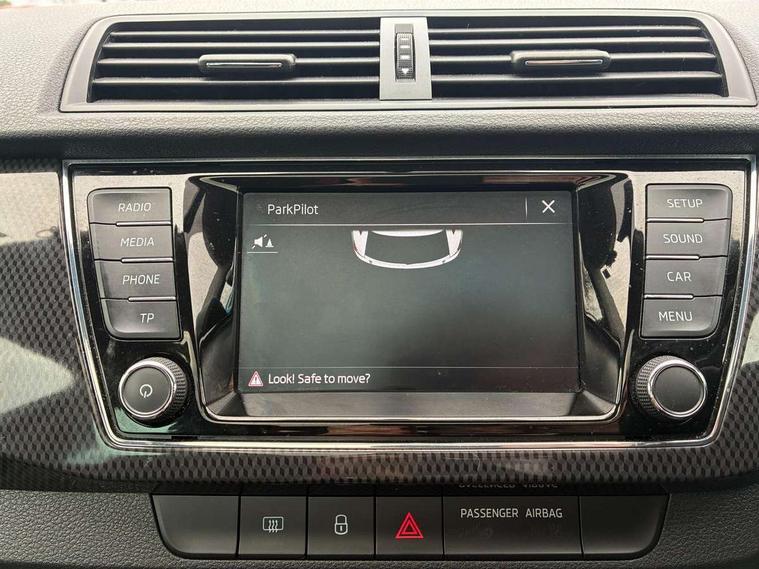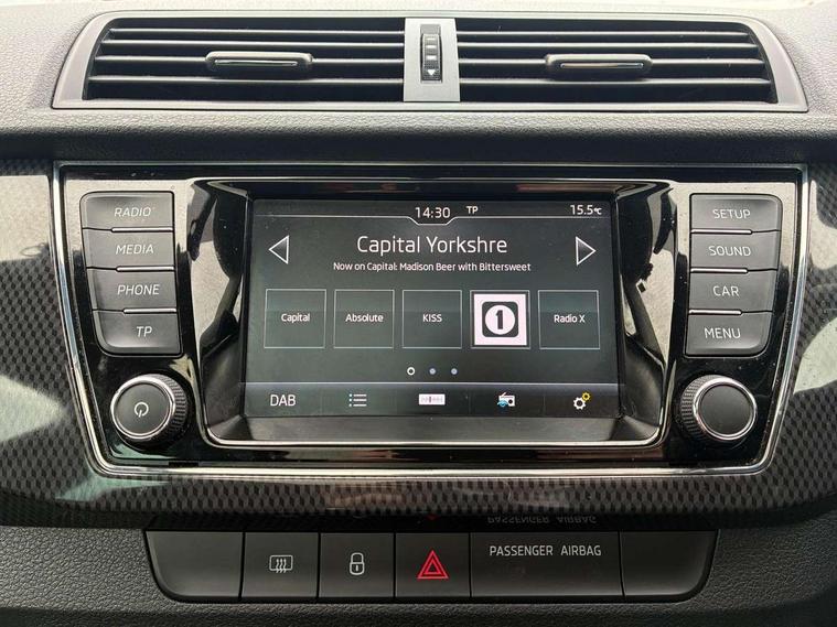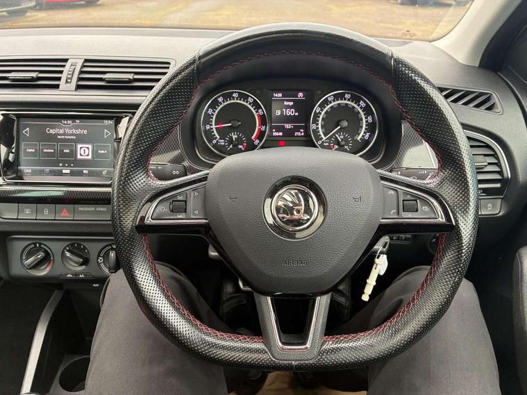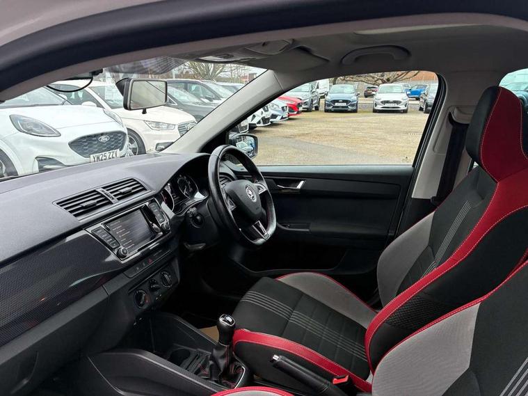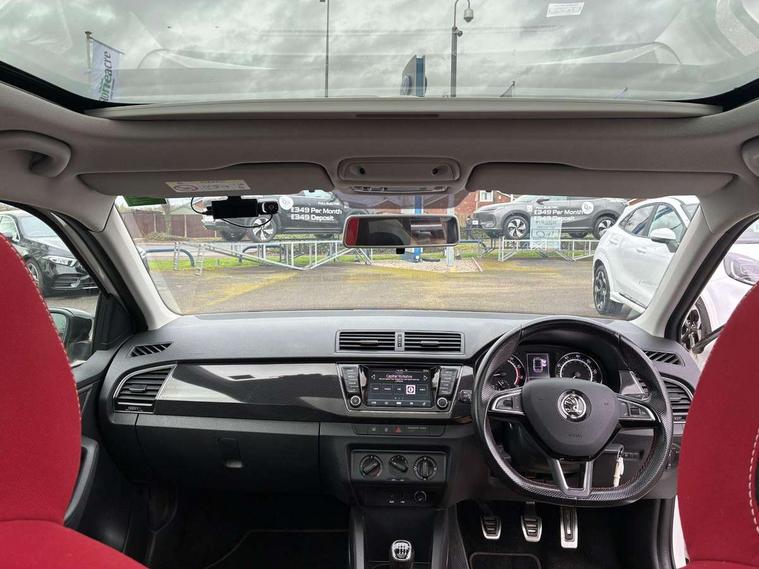 Bluetooth system, Exterior temperature gauge, Front assistant collision mitigation, Multi function trip computer, PAS, Service interval indicator, SmartLink, 6.5" touchscreen, Auxiliary socket for external MP3 player, Bolero Radio, DAB Digital radio, SD card slot, USB interface, Black door mirrors, Black radiator grille, Body colour bumpers, Body colour door handles, Body coloured rear spoiler, Electric front windows, Electrically adjustable and heated door mirrors, Fixed panoramic sunroof with black roof rails, Heated rear window, Height adjustable headlamps, Illuminated door sill inserts, Intermittent rear wash/wipe, LED daytime running lights, Rear diffuser, Tinted rear windows, Tinted windscreen, 1.5L bottle holder in front door panels, 2 height adjustable rear headrests, 3 spoke leather multifunction sports steering wheel with red stitching, 60/40 split folding rear seat, Boot stowage box, Cargo area storage tray, Cloth upholstery, Driver + passenger vanity mirrors, Floor mats with red stitching, Folding grab handles, Front reading lights, Front sports seats, Height adjustable driver's seat, Height adjustable front headrests, Height adjustable passenger seat, Height/reach adjust steering wheel, Interior light with delay, Leather gearshift, Leather handbrake, Lower glovebox cover, Luggage load hooks, Parcel shelf, Pearl grey carpets, Pearl grey headlining, Pollen filter, Rear courtesy light, Rear storage trays, Ticket holder, Two rear outer seat isofix location points, Umbrella under front passenger seat, Arkamys surround sound pack - Fabia, Chrome Pack - Fabia, 3x3 point rear seatbelts, ABS, Curtain airbags, Driver and passenger airbags, Driver and passenger side airbags, EDS, ESC with ASR, Front seatbelt pretensioners, Hydraulic Brake Assist (HBA), Passenger airbag deactivate switch, Seatbelt warning, Tyre pressure monitor, Alarm with interior monitoring, Immobiliser, Locking wheel bolts, Remote central locking, Black decorative inserts,