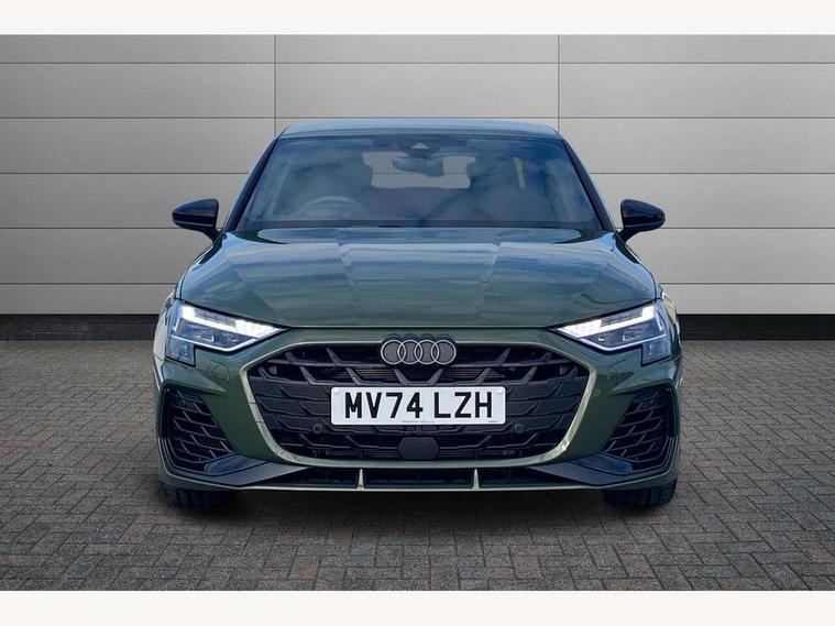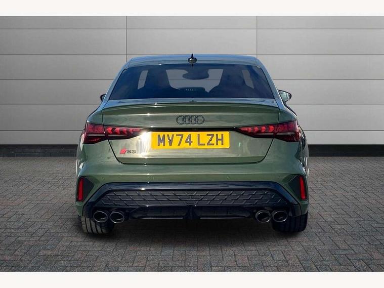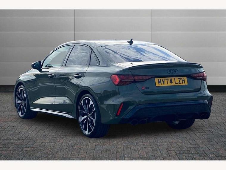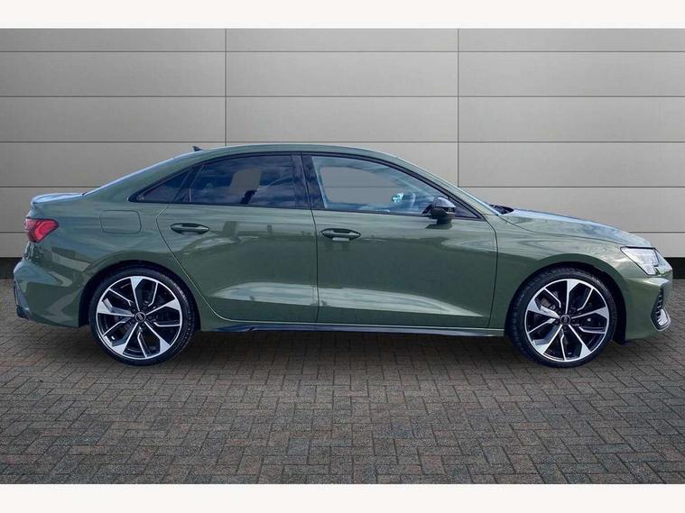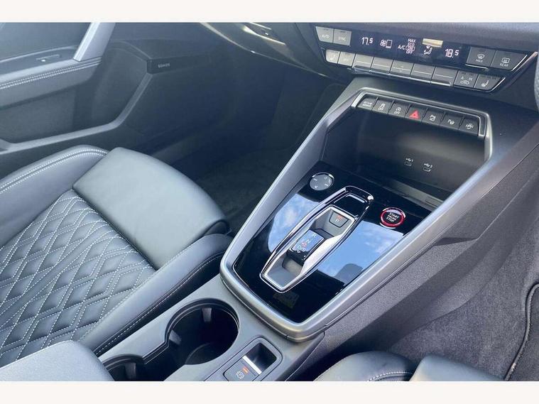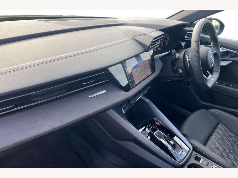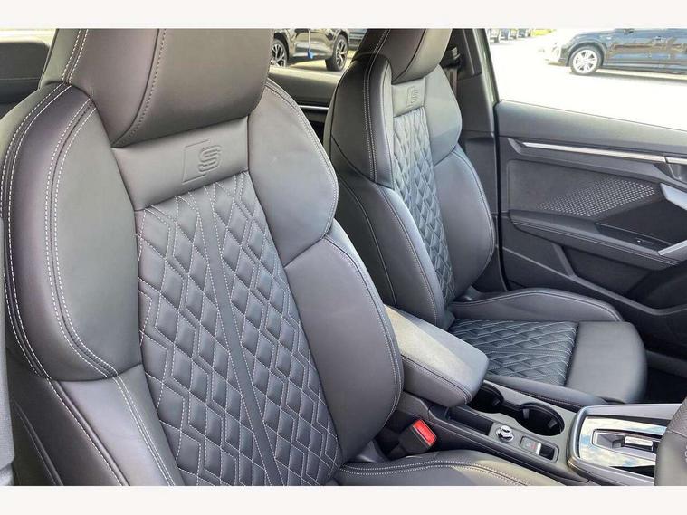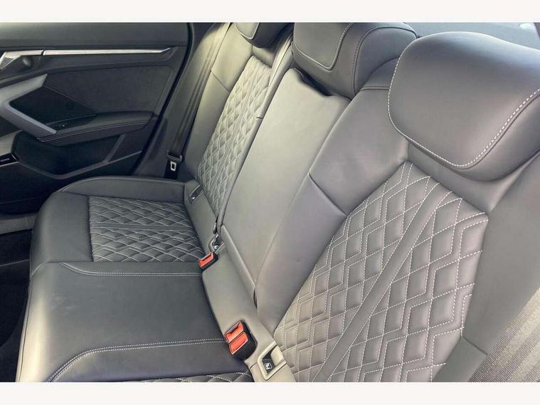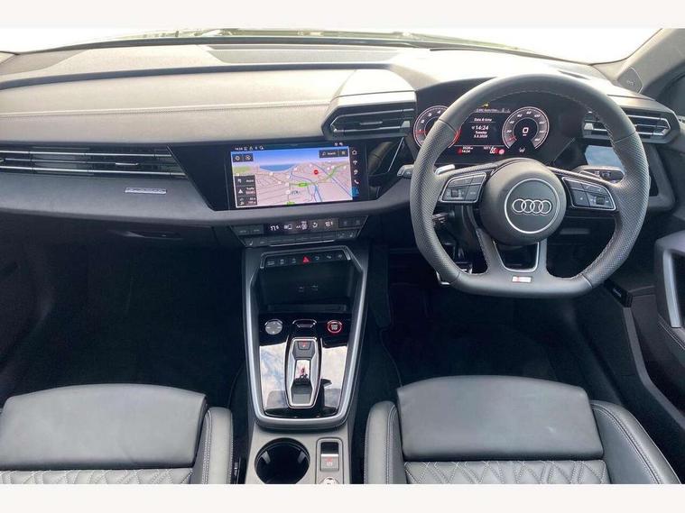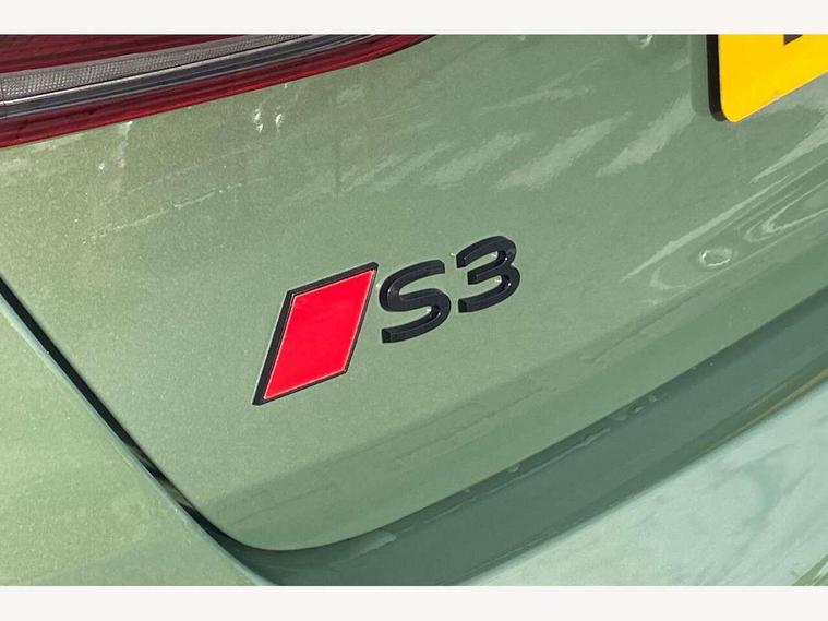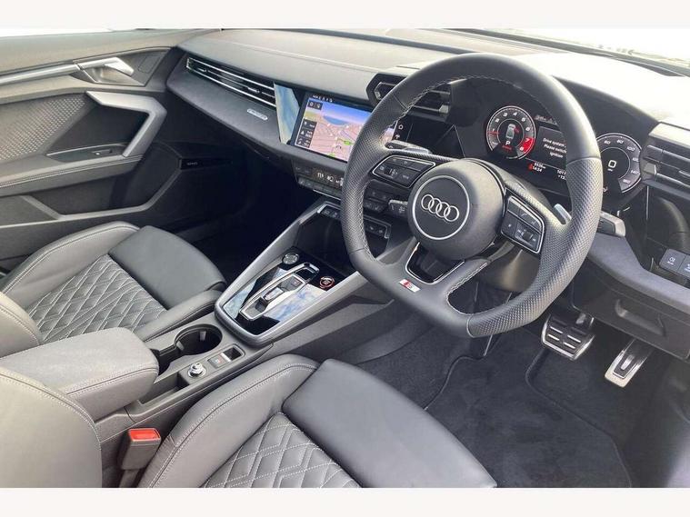 Adjustable speed limiter, Audi drive select, Audi smartphone interface with app store includes wireless Apple carplay, Android auto and Amazon alexa integration, Audi virtual cockpit plus - 12.3" full HD resolution dynamic digital instrument cluster, Automatic start/stop system with recuperation, Bluetooth interface, Camera based traffic sign recognition, Collision avoidance assistant, Distraction and Fatigue warning, e-Call (emergency call), Electromechanical power speed sensitive steering, Lane departure warning system, MMI Navigation Plus with high resolution 10.1" colour touch screen display, Park Assist with parking system Plus, Progressive steering, Service indicator, Trip computer, Voice control system with natural language interaction, S sport suspension with spring damper adjustment and lowering by 15mm, Audi Phonebox light with wireless charging, DAB Digital radio, USB ports with charging function in the rear, Anthracite grey Audi rings (front and rear), Audi Beam uses LEDs to project the rhombus S logo onto the ground as you exit your S3, Auto dimming frameless rear view mirror, Black accents front and rear bumpers including air inlets, Black accents in front grille and frame, Black accents window trims strips, Electrically adjustable/heated/folding/auto dimming door mirrors with integrated LED indications + kerb view function for passenger side, Exterior model badging, Front electric windows, Headlight washers, Heat insulating glass windscreen, Illuminated door sills with aluminium inserts at the front with S logo, LED 3rd brake light, LED daytime running lights, LED headlights with LED rear lights and dynamic rear indicators, Light and rain sensors, Privacy glass - dark tinted rear window, rear door and side windows, Rear boot, Rear electric windows, Rear side wing doors, S grille, S3 front bumper with S specific air intake grilles, 12V socket and storage compartment in front centre console, 3 seat bench in 2nd row, 3 spoke flat bottomed leather multifunction sport steering wheel with gear shift paddles, 3-zone deluxe automatic air conditioning, 4 way electrically adjustable lumbar support for driver and front passenger, 40/20/40 split folding rear seat bench, Black cloth headlining, Fine Nappa leather upholstery with front sports seats S embossed logo, Front and rear centre armrest in artificial leather, Front and rear headrests, Front/rear floor mats, Heated front seats, Manual boot compartment lid, Manually adjustable front seats, Rear cup holders, S badging on the steering wheel, Seat side bolsters, Single front passenger seat, Stainless steel pedals and front footrest in black, Aluminium interior elements pack - A3, Extended ambient lighting package Pro - S3 Black edition, Storage package - A3 Saloon, Technology package - A3, 3x3 point rear seat belts, Driver and front passenger airbag with passenger airbag deactivation, Electronic Stabilisation Control (ESC) including ABS, ASR and EDL, First aid kit with warning triangle and 2 safety vests, Front side airbags with head airbags and interaction airbag, Hill hold assist, Pre-sense front with pedestrian and cyclist detection, Seatbelt monitoring, Tyre pressure loss indicator, Anti theft alarm, Anti-theft wheel bolts, Electronically operated child locks, Immobiliser, Remote central locking with safelock, Inlays in black dynamica microfibre, Tyre repair kit,