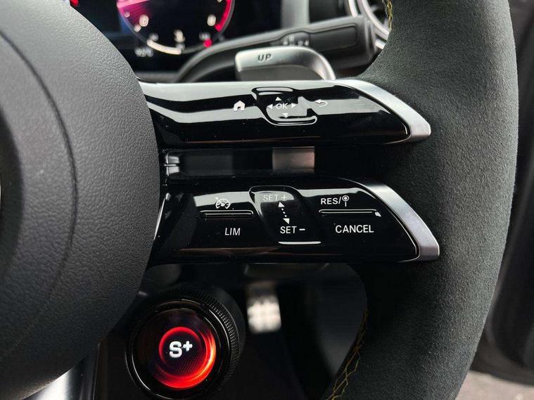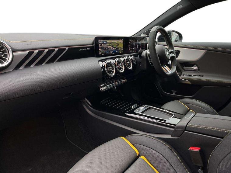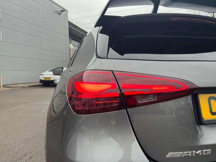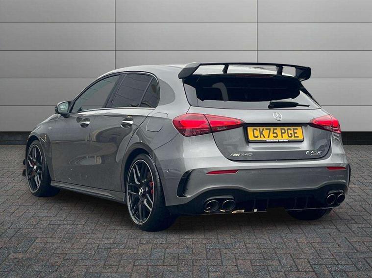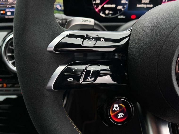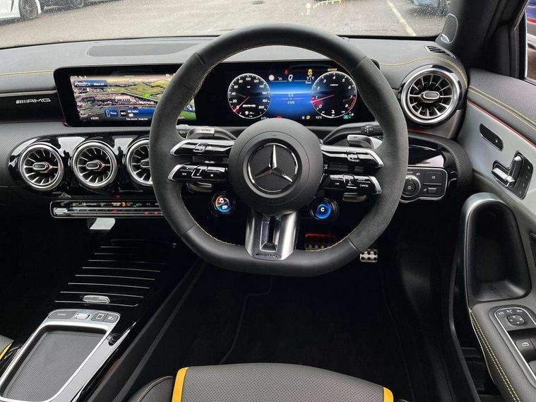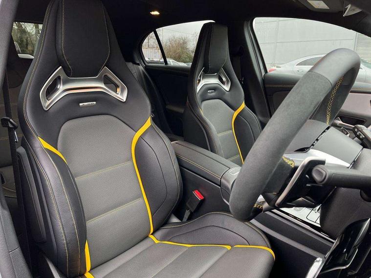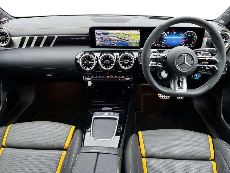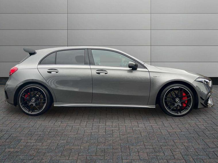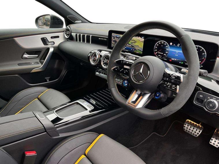 10.25 inch touchscreen central media display with AMG specific, AMG start up logo, visualisation of the AMG drive programs, vehicle and engine data, 10.25" Digital instrument cluster display screen, AMG DYNAMIC SELECT with drive modes(Slippery, Comfort, Sport, Sport+, Individual and Race) incl drift mode via steering wheel shift paddles+Race Start, AMG menu with sporty additional information - Gear indicator with yellow M symbol manual mode, Warm Up menu and Set Up menu, AMG speed sensitive steering with two sets of steering characteristics, Attention assist, Brake pad wear indicator warning light, Car wash mode, Direct steering, Dual bluetooth interfaces, ECO start/stop function, Engine start/stop button, Fluid level warning indicator for fuel, oil, coolant and washer fluid, Fluorescent jacket for driver, Hard-disk navigation, Head up Display, Hey Mercedes Voice activation, Lamp failure indicator, MBUX augmented reality for navigation, Mercedes me connect including emergency call system, accident recovery, breakdown and maintenance management, Mercedes me remote services, Outside temperature gauge, Owners manual in English, Pre-installation of private car share, Remote boot closing, Service indicator (ASSYST), Smartphone integration with Apple CarPlay and Android auto, Tailgate, Traffic sign assist, Trip computer in multifunction display with current consumption indicator, Wireless charging, AMG performance 4MATIC+ with torque control, AMG suspension including AMG specific axles and sporty spring/damper setup, Suspension with adaptive damping system, Burmester surround sound system (590W) with Dolby atmos, speakers - 1 center+4 doors+2 in C pillars, tweeter, subwoofer, DSP amp, burmester lettering, DAB Digital radio, MBUX multimedia system, 4 Electric Front and Rear windows, Adaptive brake lights, AMG A45 S bodystyling -rear apron, four vertical fins, side sill panels, roof spoiler lip, specific front apron, diffuser look and S label on boot lid, AMG real performance exhaust sound system, AMG specific radiator grille in high gloss chrome with AMG lettering, Beltline strips in High gloss Black, Body colour bumpers, Body colour door handles with chrome inserts, Body colour side skirt, Electric adjustable and heated door mirrors with integrated LED side indicators, Headlamp assist automatic headlamp activation, Heated glass rear windscreen + timer control, LED daytime running lights, LED High level third brake light, LED tail lamp, Multibeam LED headlamps with adaptive highbeam assist and cornering function, Panoramic sliding sunroof, Privacy glass, Radio aerial, Rain sensing windscreen wipers with two sensitivity settings, Rear fog lights, Rear side wing doors, Rear windscreen wiper, Surround lighting with logo projection, Two round twin tailpipe trim elements each measuring 90 mm in diameter and AMG lettering plus ribbing on the inside of the pipe, Valve control dependent on drive program, Wider wheel arches for AMG wheels, Window line trim strip in black, 3 seat bench in 2nd row, 3 Spoke flattened lower section sporty design AMG Performance steering wheel in nappa leather/microcut microfibre, 40:20:40 split folding rear seats, Air conditioning - Two zone thermotronic luxury automatic climate control with display, AMG brushed stainless steel sports pedals with rubber studs, AMG centre console finished with trim in silver chrome, AMG floor mats, AMG performance seats, AMG sporty centre console with raised front section and integral control switched for manual transmission mode, AMG steering wheel buttons, Automatic child seat recognition sensor, Black air vents with surround in silver chrome, Black roof lining, Electrically adjustable front memory seats including lumbar support and backrest inclination, Front centre armrest with stowage, Front seat head restraints, Height/reach adjustable steering column, Illuminated AMG front door sills with changeable cover, Interior lighting - 64 colour Ambient lighting, Interior mirror with reading lamps in black and frameless, Rear armrest with 2 cupholders, Rear head restraints, Seat occupancy sensor for front passenger seat, Silver coloured aluminium gear shift paddles on steering wheel, Single front passenger seat, Stowage compartment in centre console with retractable cover, Sunvisors with illuminated vanity mirrors, Twin front cupholders, Aerodynamic pack - A Class, AMG Driver's pack - A Class, AMG night pack - A Class, AMG performance high-end seat pack - A Class, Light and sight package - A Class, Mirror package - A Class, Multi-contour seat pack - A Class, Parking pack with 360 degree camera - A Class, Seat comfort pack - A Class, USB pack plus - A Class, Winter pack - A Class, 3 rear 3 point seatbelts, 3 stage electronic stability programme, ABS with Brake Assist, Active bonnet, Adaptive brake assist with hold function and hill start assist, AMG high performance brake system with red painted brake callipers and black AMG lettering at the front, ventilated and perforated brake discs, Black seatbelts, Bonnet with power domes, Childproof locks manually operated for rear doors and electrically operated for rear power windows, Crash responsive emergency lighting, Driver and passenger head and side airbags, Drivers knee airbag, Dual stage driver/passenger airbags, Electronic parking brake, ESP curve dynamic assist, ESP with ASR, Exit warning, Front and rear seatbelt reminder, ISOFIX and top tether child seat fixing points in two outer rear seats, Tyre pressure monitoring system, Warning triangle and first aid kit, Window airbags, Alarm system/interior protection/immobiliser, Guard 360 degree vehicle protection, Keyless entry lock/unlock, Keyless Go, Remote central locking and crash sensor with emergency opening function, Aluminium AMG design black/silver interior trim, 19" AMG cross spoke forged wheels painted in matt black with high sheen rim flange, Summer tyres, Tirefit sealant kit, Wheel arches with flared AMG wings with TURBO 4MATIC+ letterin