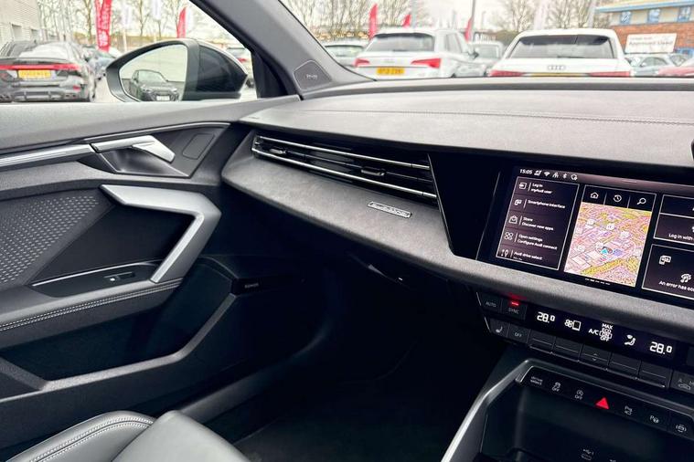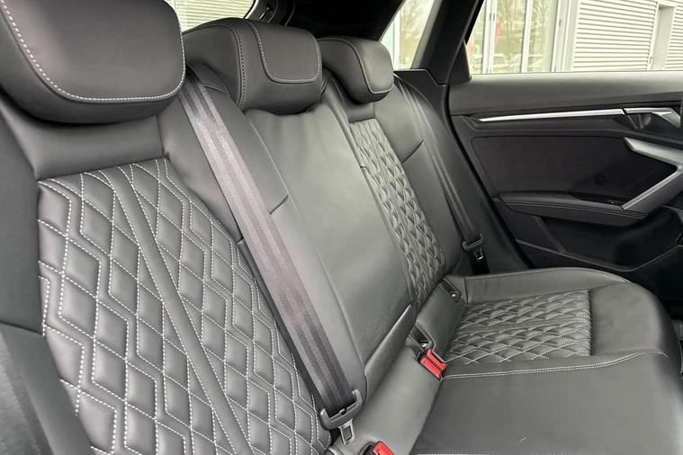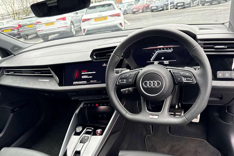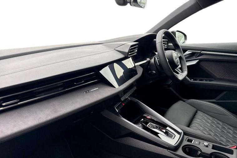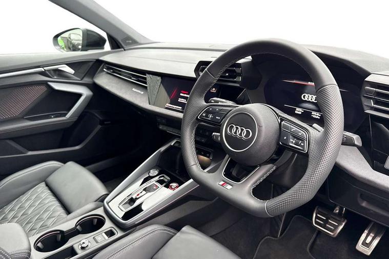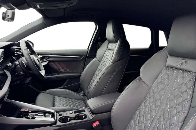 Adaptive cruise control (ACC), Adjustable speed limiter, Audi drive select (Auto, Comfort, Dynamic, Efficiency and Individual), Audi virtual cockpit plus - 12.3" full HD resolution dynamic digital instrument cluster, Automatic start/stop system with recuperation, Bluetooth interface, Camera based traffic sign recognition, Collision avoidance assistant, Driver attention and fatigue detection, e-Call (emergency call), Emergency assist, Intersection assist, Lane departure warning system, MMI Navigation Plus with high resolution 10.1" colour touch screen display, Park Assist with parking system Plus, Progressive steering, Reversing camera, Service indicator, Smartphone interface with app store includes wireless Apple carplay, Android auto and Amazon alexa integration, Trip computer, Voice control system with natural language interaction, quattro permanent all-wheel drive with torque splitter, S sport suspension with spring damper adjustment and lowering by 15mm, Audi Phonebox light with wireless charging, DAB Digital radio, USB ports with charging function in the rear, Anthracite grey Audi rings (front and rear), Audi Beam uses LEDs to project the rhombus S logo onto the ground as you exit your S3, Auto dimming frameless rear view mirror, Black accents front and rear bumpers including air inlets, Black accents in front grille and frame, Black accents in window trims, Electrically adjustable/heated/folding/auto dimming door mirrors with integrated LED indications + kerb view function for passenger side, Exterior model badging, Front and rear side air inlets in grained matt black with dark liquid chrome frame, Front electric windows, Front radiator grill in high gloss dark chrome, Heat insulating glass windscreen, Illuminated door sills with aluminium inserts at the front with S logo, LED 3rd brake light, Light and rain sensors, Privacy glass - dark tinted rear window, rear door and side windows, Rear diffuser and grill in grained matt black with inlay in dark liquid chrome, Rear electric windows, Rear side wing doors, Rear wiper, S grille, S3 front bumper with S specific air intake grilles, S3 roof spoiler, Side sill trim in dark liquid chrome, 12V socket and storage compartment in front centre console, 3 seat bench in 2nd row, 3 spoke flat bottomed leather multifunction sport steering wheel with gear shift paddles, 3-zone deluxe automatic air conditioning, 4 way electrically adjustable lumbar support for driver and front passenger, 40/20/40 split folding rear seat bench, Black cloth headlining, Black front and rear floor mats, Fine Nappa leather upholstery with front sports seats S embossed logo, Front and rear centre armrest in artificial leather with contrasting stitching on armrests and instrument panel, Front and rear headrests, Heated front seats, Height and reach adjustable steering wheel, i-Size child seat mounting on the front passenger side and outer rear seats, i-Size and top tether on the outer rear seats, Manual boot compartment lid, Manually adjustable front seats, Rear centre armrest with cupholder, S badging on the steering wheel, Seat side bolsters, Single front passenger seat, Stainless steel pedals and front footrest in black, Aluminium interior elements pack - A3, Storage package - A3, Technology pack with Matrix LED headlights - A3, 3x3 point rear seat belts, Driver and front passenger airbag with passenger airbag deactivation, Electronic Stabilisation Control (ESC) including ABS, ASR and EDL, First aid kit with warning triangle and 2 safety vests, Front side airbags with head airbags and interaction airbag, Hill hold assist, Pre-sense front with pedestrian and cyclist detection, Seatbelt monitoring, Tyre pressure loss indicator, Anti theft alarm, Anti-theft wheel bolts, Electronically operated child locks, Immobiliser, Black dashboard, Tyre repair kit,