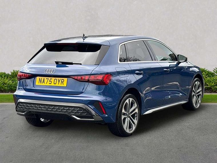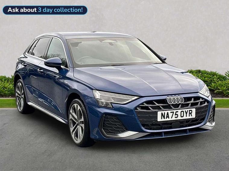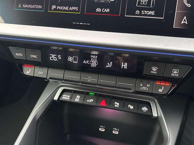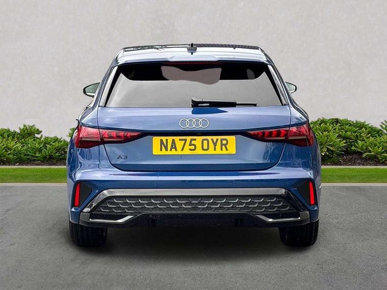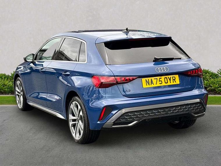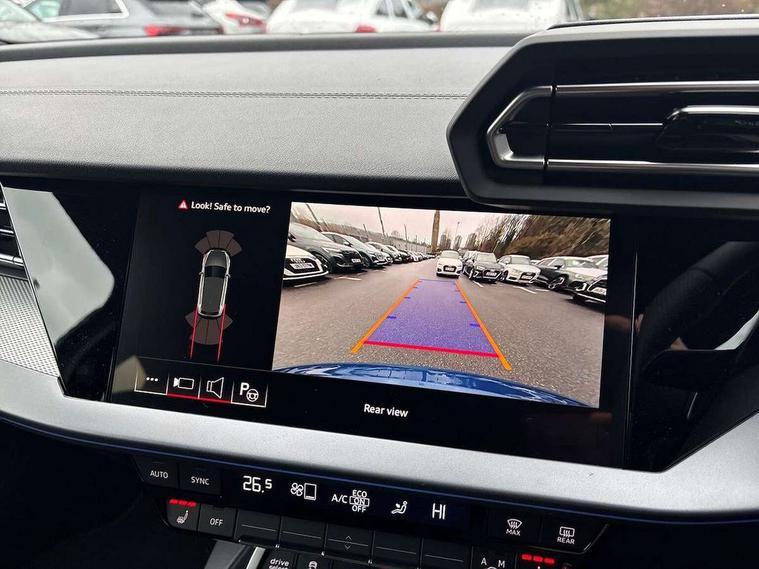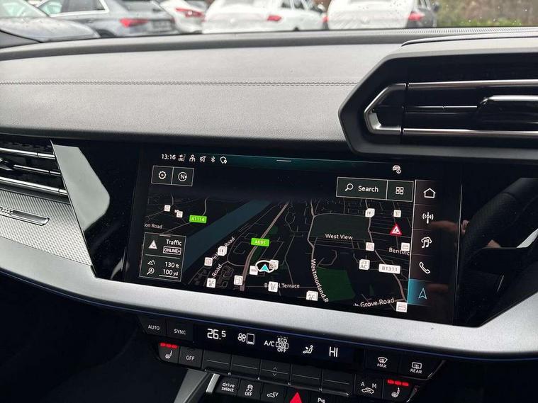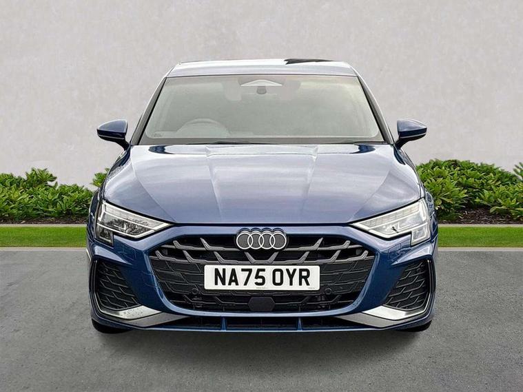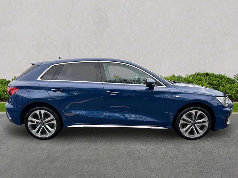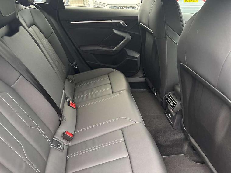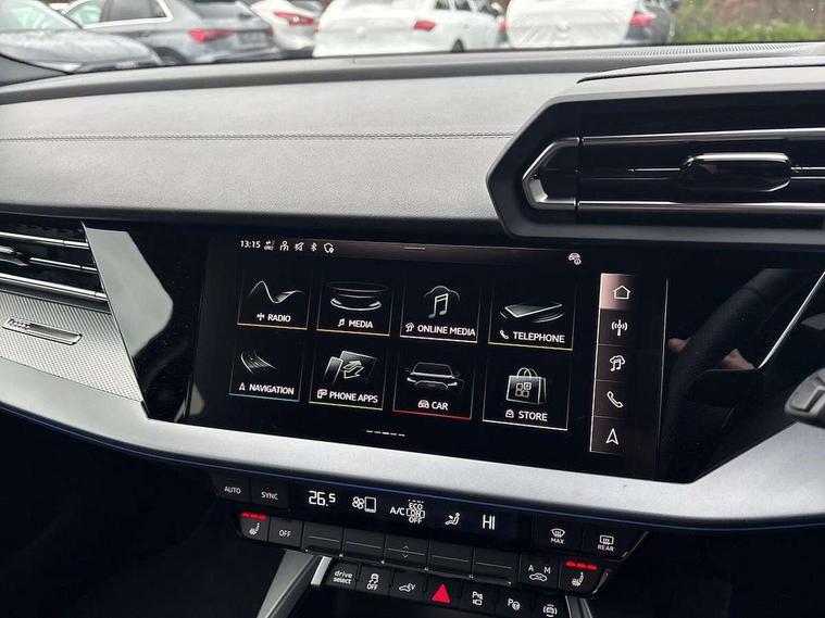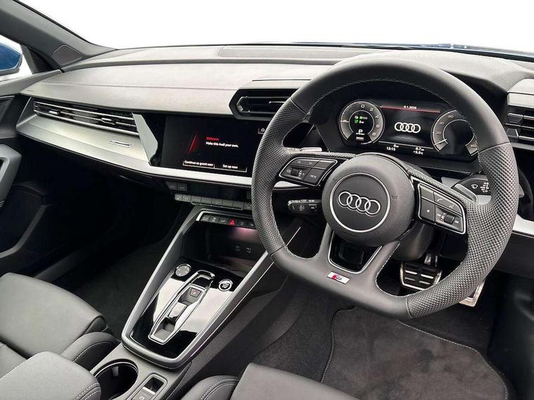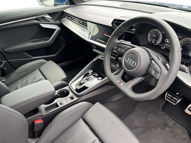 Adaptive cruise control (ACC), Adjustable speed limiter, Audi drive select (Auto, Comfort, Dynamic, Efficiency and Individual), Audi smartphone interface with app store includes wireless Apple carplay, Android auto and Amazon alexa integration, Audi virtual cockpit plus - 12.3" full HD resolution dynamic digital instrument cluster, Automatic start/stop system with recuperation, Bluetooth interface, Camera based traffic sign recognition, Collision avoidance assistant, Driver attention and fatigue detection with driver monitoring camera, e-Call (emergency call), Electromechanical power speed sensitive steering, Emergency assist, Intersection assist, Lane departure warning system, MMI Navigation Plus with high resolution 10.1" colour touch screen display, Park Assist with parking system Plus, Reversing camera, Service indicator, Trip computer, Voice control system with natural language interaction, 3 pin 10 amp domestic charging cable, CCS socket for DC charging, Charging cable for public charging, mode 3 (type 2), 32 A, Compact charging system, Industrial connector CEE 32 A, 230 V, length 1.6 m, Standard suspension, Type 2 socket for AC charging, Audi Phonebox light with wireless charging, Audi sound system - 10 loudspeakers including centre loudspeaker and subwoofer, DAB Digital radio, USB ports with charging function in the rear, Acoustic glass windscreen, All weather light, Aluminium window trim, Auto dimming frameless rear view mirror, Automatic dynamic range control, Body colour exterior mirrors, Chrome exhaust tailpipes, Dipped beam, main beam, position light and turning light, Electrically adjustable/heated/folding/auto dimming door mirrors with integrated LED indications + kerb view function for passenger side, Exterior model badging, Front and rear side air inlets in grained matt black with dark liquid chrome frame, Front electric windows, Front radiator grill in high gloss dark chrome, Heat insulating glass windscreen, Illuminated door sills with aluminium inserts at the front with S logo, Intersection light, LED 3rd brake light, LED brake lights, LED daytime running x3, LED headlights with LED rear lights and dynamic rear indicators, LED rear number plate lights, LED reverse light, LED tail lights, Light and rain sensors, Manoeuvring light, Motorway light, Privacy glass - dark tinted rear window, rear door and side windows, Rear diffuser and grill in grained matt black with inlay in dark liquid chrome, Rear electric windows, Rear side wing doors, Rear wiper, S line bumpers, S roof spoiler, Side S line emblems on front wings, Side sill trim in dark liquid chrome, Static Cornering lights, 12V socket and storage compartment in front centre console, 3 seat bench in 2nd row, 3 spoke flat bottomed leather multifunction sport steering wheel with gear shift paddles, 3-zone deluxe automatic air conditioning, 4 way electrically adjustable lumbar support for driver and front passenger, 40/20/40 split folding rear seat bench, Black cloth headlining, Black front and rear floor mats, Convenience auxiliary air conditioning, Front and rear centre armrest in artificial leather with contrasting stitching on armrests and instrument panel, Front and rear headrests, Heated front seats, Height and reach adjustable steering wheel, i-Size child seat mounting on the front passenger side and outer rear seats, i-Size and top tether on the outer rear seats, Manual boot compartment lid, Manually adjustable front seats, Rear centre armrest with cupholder, S badging on the steering wheel, Seat side bolsters, Single front passenger seat, Stainless steel pedals and front footrest in black, Twin leather upholstery with front sports seats S embossed logo, Aluminium interior elements pack - A3, Multi-coloured LED interior lighting package with Multi-coloured contour lighting of instrument panel - A3, 3x3 point rear seat belts, Acoustic vehicle alerting system, Driver and front passenger airbag with passenger airbag deactivation, Electronic Stabilisation Control (ESC) including ABS, ASR and EDL, First aid kit with warning triangle and 2 safety vests, Front side airbags with head airbags and interaction airbag, Hill hold assist, Pre-sense front with pedestrian and cyclist detection, Seatbelt monitoring, Tyre pressure loss indicator, Anti theft alarm, Anti-theft wheel bolts, Electronically operated child locks, Immobiliser, Black dashboard, Inlay in dark aluminium spectrum, Tyre repair kit,