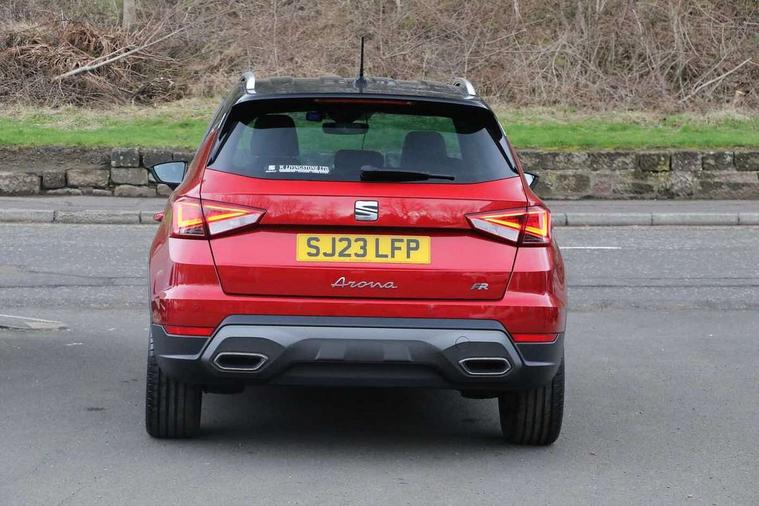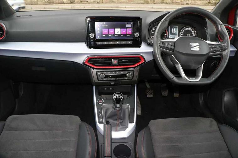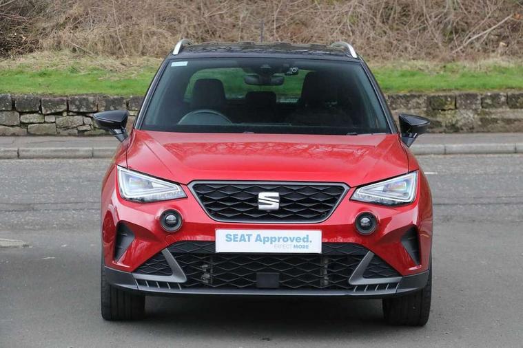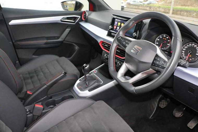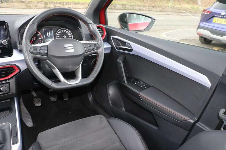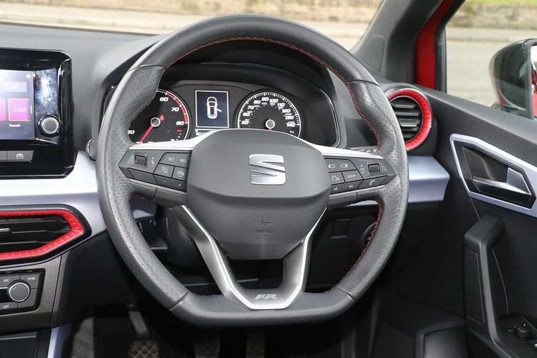 'Lights On' Reminder warning buzzer, Analogue cockpit with physical dials, Digital clock, E-call, Electric speed sensitive power steering, Full Link Smartphone Integration with Mirror Link, Apple Car Play, Google Android Auto with USB Type C cable for Apple and Android compatibility, Lane keeping system, Low fuel warning light, Outside temperature display, Rear parking sensor, RPM counter, Seat connect with safety, service and remote, SEAT Drive profile - Four different models normal-sport-eco-individual, steering response, throttle response, Trip computer, Wireless phone charger, Bluetooth interface for hands free and audio streaming, DAB digital radio and AM/FM radio, Media system with 8.25" colour touchscreen with USB port (type c), Steering wheel mounted audio controls, Anti theft roof antenna, Automatic activation of hazard warning lights, Body coloured bumpers, Body coloured door handle inserts, Chrome roof rails and window surrounds, Dark tinted rear windows, Dimming rear view mirror, Electric front/rear windows, Electrically adjustable and heated door mirrors, Front fog lights with cornering function and rear fog light, FULL LED automatic headlights with dynamic headlight range control, coming and leaving home, LED daytime running lights, LED rear tail lights and licence plate lights, Protective side mouldings, Rear side wing doors, Rear spoiler, Rear window wash/wipe, Roof colour door mirrors, Third brake light, Twin exhaust pipe styling hidden exhaust pipe, Visible VIN plate, Windshield wiper with intermittent control and potentiometer, 2 cupholders, 3 seat bench in 2nd row, 60/40 split folding rear seat, Aircare filter, Black interior roof, Double boot floor, Driver sunvisor with covered mirror + card holder, Dual zone climate control, Front comfort seats, Front courtesy light with 2x front and 2x rear reading lights, Gear shift indicator, Height adjustable front seats, Height/reach adjustable steering column, Illuminated boot, Instrument lighting with brightness control, Interior ambient lighting, Interior light in footwell, central console and door panel, ISOFIX points in outer rear seats with top tether anchorage points, Microsuede cloth upholstery, Passenger sunvisor with vanity mirror, Perforated flat bottomed leather steering wheel/gear knob/handbrake with red stitching and FR logo, Single front passenger seat, Two front and three rear height adjustable headrests, Interior chrome pack - Arona, 3 point seatbelts on all rear seats, ABS, Active front headrests, Child locks on rear doors, Driver and front passenger airbags with front passenger airbag de activation, front side and curtain airbags, Electronic stability control, Emergency Brake Assist (EBA) and front assist, Front and rear seatbelt reminder, Hill hold control, Multi-Collision braking, Tiredness recognition system, Traction control, Tyre pressure monitoring system, Alarm with back-up horn, Electronic engine immobiliser, KESSY Keyless entry and go, Locking wheel bolts, Remote central locking + deadlocks, Tow away protection, Titan black dashboard,
