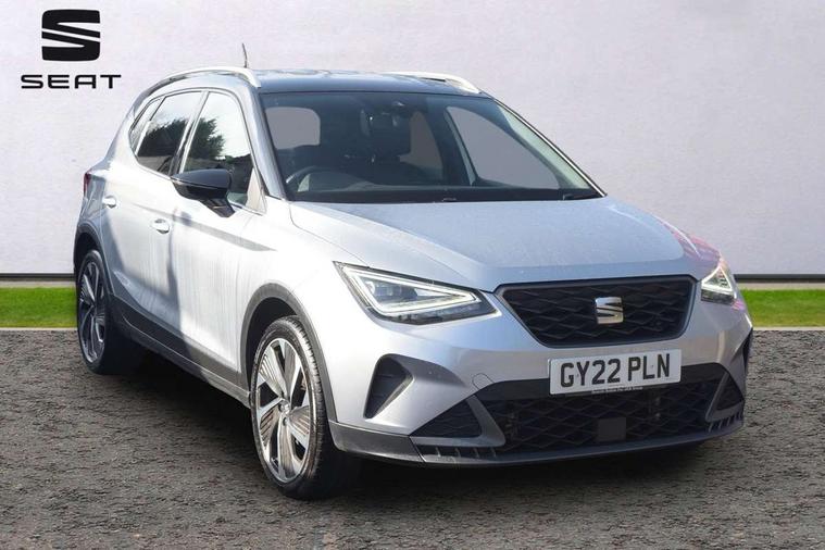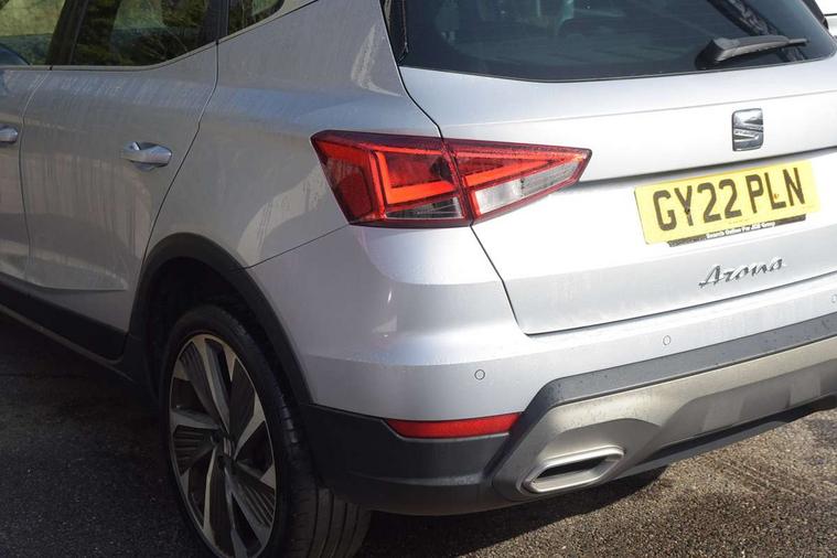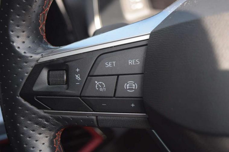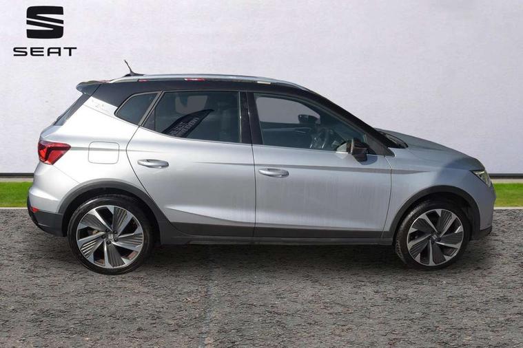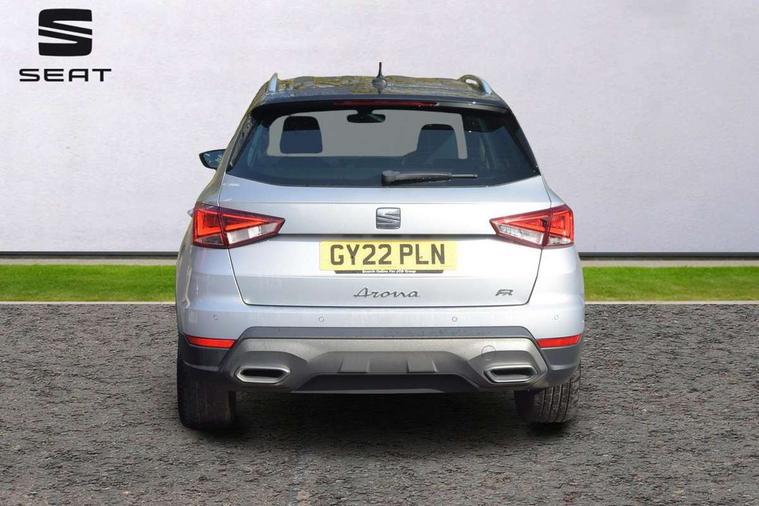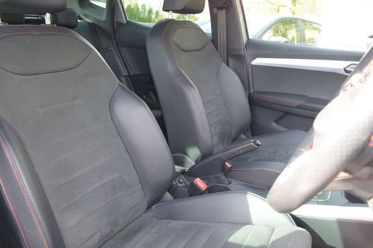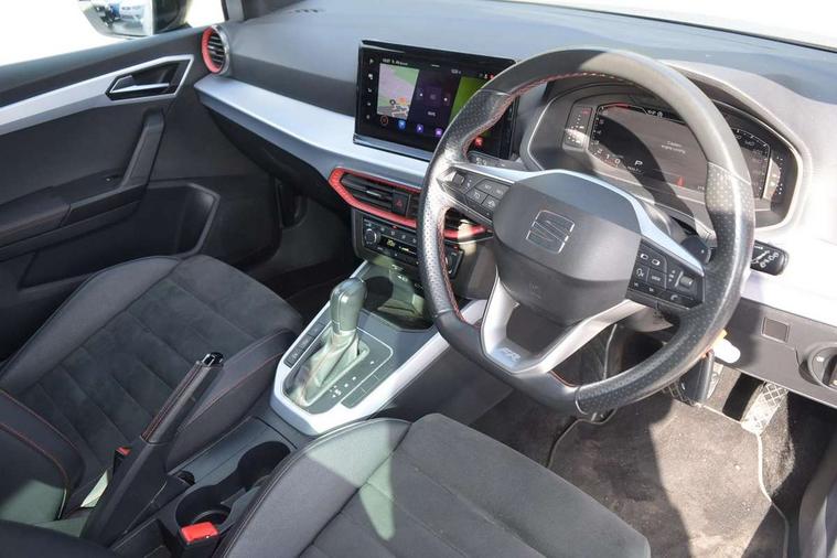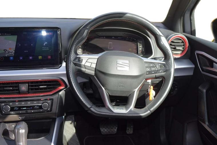 'Lights On' Reminder warning buzzer, 10" Digital cockpit, Digital clock, E-call, Electric speed sensitive power steering, Full Link Smartphone Integration with Mirror Link, Apple Car Play, Google Android Auto with USB Type C cable for Apple and Android compatibility, Low fuel warning light, Outside temperature display, Rear parking sensor, RPM counter, Seat connect with safety, service, remote and online, SEAT Drive profile - Four different models normal-sport-eco-individual, steering response, throttle response and gear shifts mode, Trip computer, Bluetooth interface for hands free and audio streaming, DAB digital radio and AM/FM radio, Steering wheel mounted audio controls, Anti theft roof antenna, Auto dimming interior rear view mirror, Automatic activation of hazard warning lights, Body coloured bumpers, Body coloured door handle inserts, Chrome roof rails and window surrounds, Dark tinted rear windows, Electric front/rear windows, Electrically adjustable, heated and folding door mirrors, Front fog lights with cornering function and rear fog light, FULL LED automatic headlights with dynamic headlight range control, coming and leaving home, LED daytime running lights, LED rear tail lights and licence plate lights, Protective side mouldings, Rain sensing wipers, Rear side wing doors, Rear spoiler, Rear window wash/wipe, Roof colour door mirrors, Third brake light, Twin exhaust pipe styling hidden exhaust pipe, Visible VIN plate, Windshield wiper with intermittent control and potentiometer, 2 cupholders, 3 seat bench in 2nd row, 60/40 split folding rear seat, Aircare filter, Black interior roof, Double boot floor, Driver sunvisor with covered mirror + card holder, Dual zone climate control, Front comfort seats, Front courtesy light with 2x front and 2x rear reading lights, Front seat back storage pockets, Gear shift indicator, Heated front seats, Height adjustable front seats, Height/reach adjustable steering column, Illuminated boot, Instrument lighting with brightness control, Interior ambient lighting, Interior light in footwell, central console and door panel, ISOFIX points in outer rear seats with top tether anchorage points, Microsuede cloth upholstery, Passenger sunvisor with vanity mirror, Perforated flat bottomed leather steering wheel/gear knob/handbrake with red stitching and FR logo, Single front passenger seat, Steering wheel mounted gearshift paddles, Two front and three rear height adjustable headrests, Connectivity pack plus - Arona, Interior chrome pack - Arona, 3 point seatbelts on all rear seats, ABS, Active front headrests, Child locks on rear doors, Driver and front passenger airbags with front passenger airbag de activation, front side and curtain airbags, Electronic stability control, Emergency Brake Assist (EBA) and front assist, Front and rear seatbelt reminder, Hill hold control, Multi-Collision braking, Tiredness recognition system, Traction control, Tyre pressure monitoring system, Alarm with back-up horn, Electronic engine immobiliser, Locking wheel bolts, Remote central locking + deadlocks, Tow away protection, Titan black dashboard, 18" Performance Cosmo grey matt alloy wheels,