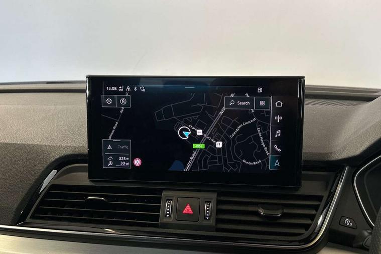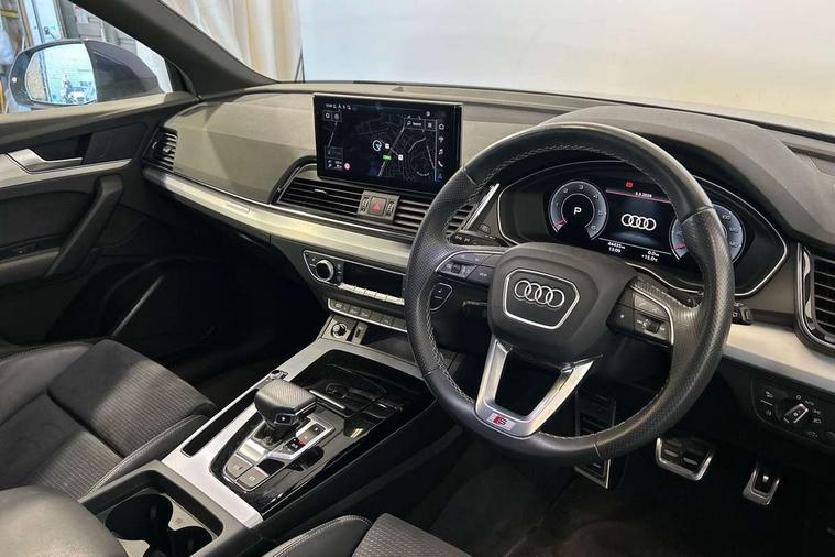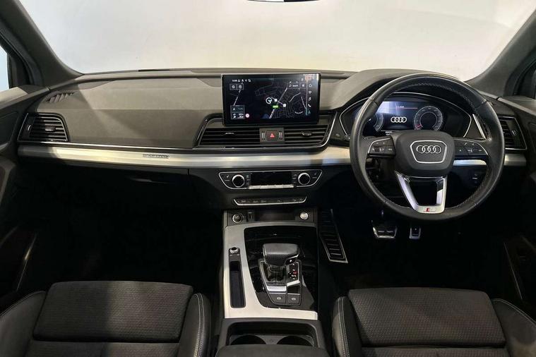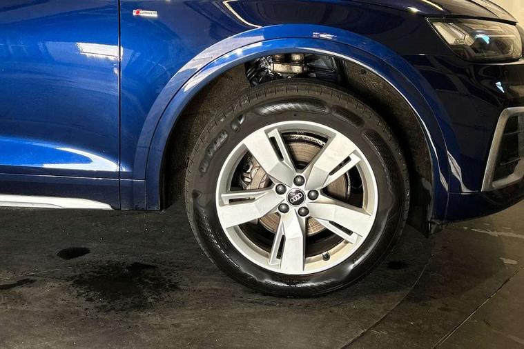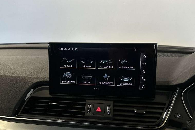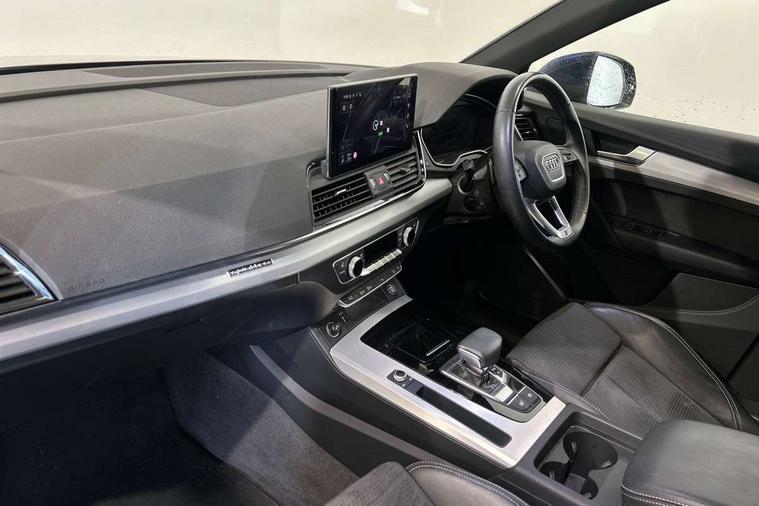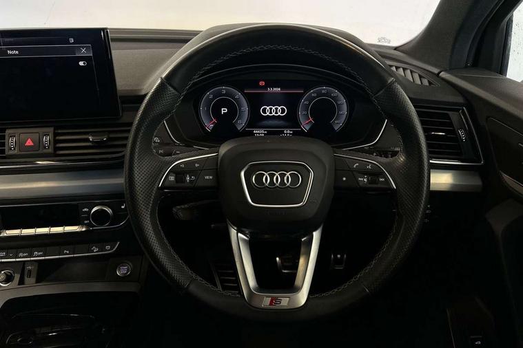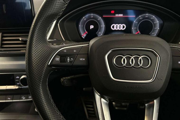Audi connect safety and service (e-call), Audi connect with Amazon Alexa Integration, Audi drive select, Audi virtual cockpit plus with 12.3" screen and three different layout designs, Audi wireless smartphone interface, Automatic start-stop system with coasting functionality and efficiency programme, Bluetooth interface, Electro - mechanical power assisted steering, MMI navigation plus with 10.1" touch screen, Power tailgate, Reversing camera, Service interval indicator, Voice control system with Audi hotword activation "Hey Audi", Diesel particulate filter, Quattro on demand, S line sports suspension, DAB Digital radio, Acoustic windscreen, Aluminium roof rails, Audi matrix LED headlights with dynamic front and rear indicators, Auto dimming rear view mirror, Automatic headlights and windscreen wipers, Body colour door mirrors, Body colour rear diffuser with matt aluminium silver surrounds, Body colour underbody protection, Chrome plated exhaust trims, Door sills in Selenite silver, Electric adjustable/heated/folding door mirrors, Front air inlet surrounds in aluminium, Front and rear electric windows, Front radiator grille in honeycomb design, Headlight washers, Lower bumpers painted in contrast Manhattan grey, Rear chrome trim strip below lights, Rear privacy glass and rear side windows, Rear spoiler, Rear wiper, Roof bars, S Line badges on the front wings, S Line front and rear bumpers, S Line side skirts, 2 x USB charging port with aux input socket, 3 rear headrests, 40:20:40 split folding rear seat with rear centre armrest, Black cloth headlining, Comfort front centre armrest, Contrast stitching on seats, steering wheel and gear lever gaiter, Deluxe 3 zone electronic climate control, Front head restraints, Front/rear floor mats, Gear lever in black leather, Heated front seats, Height/reach adjustable steering column, Illuminated door sill trims with S logo, ISOFIX child seat mounting and top tether, Manual seat adjustment with 4-way electric lumbar support, Removable luggage compartment floor, Stainless steel pedals, Sunvisors with vanity mirrors, Trunk roller cover, High gloss pack - Q5, LED interior light pack - Q5, 3 point seatbelts on all seats, 6 airbags - Driver, front passenger, curtain and side airbags, Electrically operated child locks on rear doors, Electromechanical parking brake, Electronic stabilisation control including ABS, ASR and EDL, Front passenger airbag deactivation, Hill descent control, Hill hold assist, Multi collision brake assist, Pop-up bonnet for pedestrian protection, Pre sense city, Seat belt force limiter, Seatbelt monitoring, Tyre pressure warning, Warning triangle and first aid kit, Anti theft alarm, Anti-theft wheel bolts, Keyless Go access/ignition system, Matt brushed aluminium inlays,