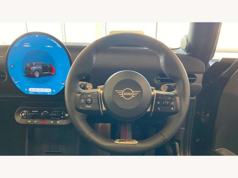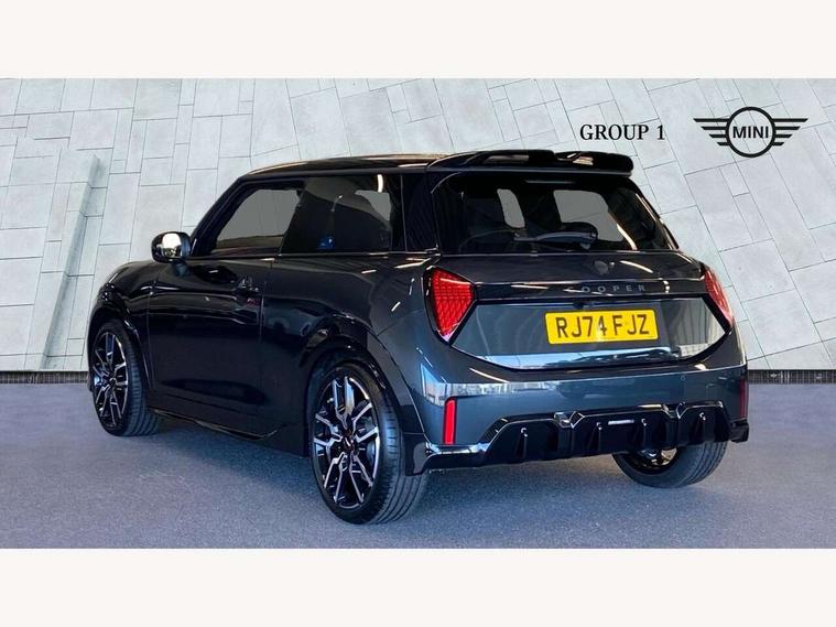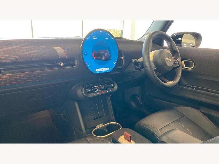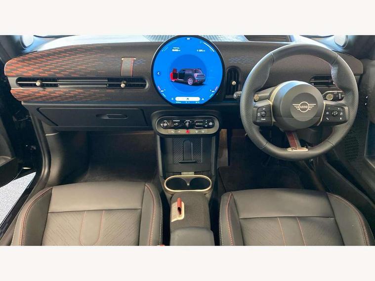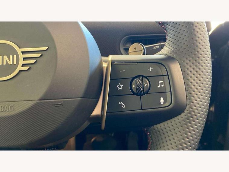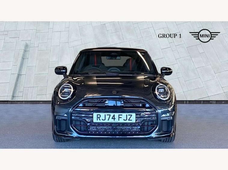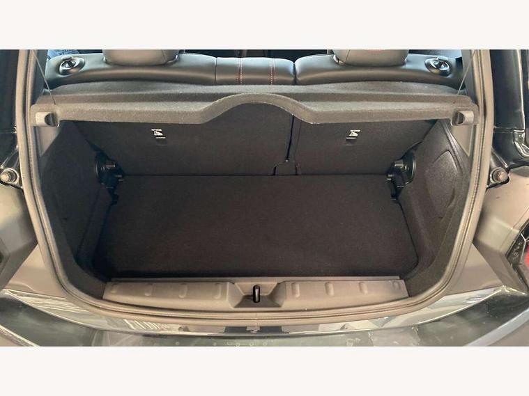 Central toggle bar, Circular OLED Screen, Compatible mobile phone bluetooth with audio streaming, Cruise control, Digital instrument cluster, Electro-mechanical speed dependant steering assistance, Emergency call service, MINI Experience Modes, Mini navigation system, On board computer, Service interval indicator, 7 speed steptronic sport transmission with double clutch, Adaptive suspension, DAB Digital radio, Personal eSim, Auto headlights, Electric adjustable heated door mirrors, Electric front windows, Front and rear apron, Heated rear window, Heated windscreen washer jets, High gloss black wheel arches, High gloss hexagonal patterned grille surround, JCW body kit, LED daytime running lights, LED Headlights, LED indicator lights, LED rear lights, Rain sensor window wipers, Rear fog lights, Rear roof spoiler with airblades, Rear window wiper, 2 seat bench in second row, 2 zone automatic air conditioning, 60/40 rear seat bench, Ambient lighting, Black lower band in high gloss, Cupholders, Dark headliner, Floor mats, Front and rear head restraints, Front compact armrest, Heated steering wheel, Height adjustable passenger seat, Lidded storage box in Black/Red knit, Luggage compartment lighting, Partially perforated vescin steering wheel with red accent, black/red decorative strap, Single front passenger seat, Steering wheel paddle shift, Sunvisors with vanity mirrors, Vescin/Cord upholstery, Driving assistant pack - Cooper Hatchback, Park assistant pack - Cooper Hatchback, 3 point seatbelts on all four seats, 6 Airbags - front, side, head and seat belt tensioners, Acoustic pedestrian protection, Anti-lock braking system (ABS), Brake caliper in Black with JCW badge, DSC - Dynamic Stability Control, Electronic parking brake, Front and rear disc brakes, Front ISOFIX (iSize), Front passenger airbag deactivation, JCW Sport Brakes, Traction control, Tyre pressure monitoring system, Alarm, Immobiliser, Remote central locking, Black/Red decorative dash strap, JCW Black/Red dashboard knit, Tyre repair kit,