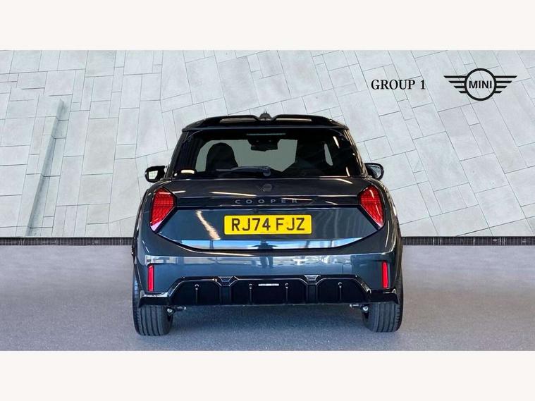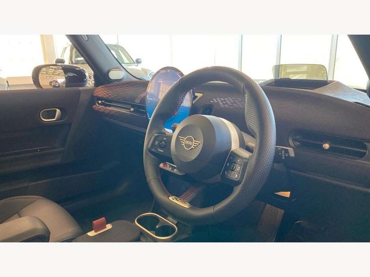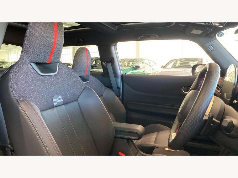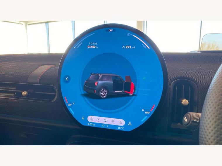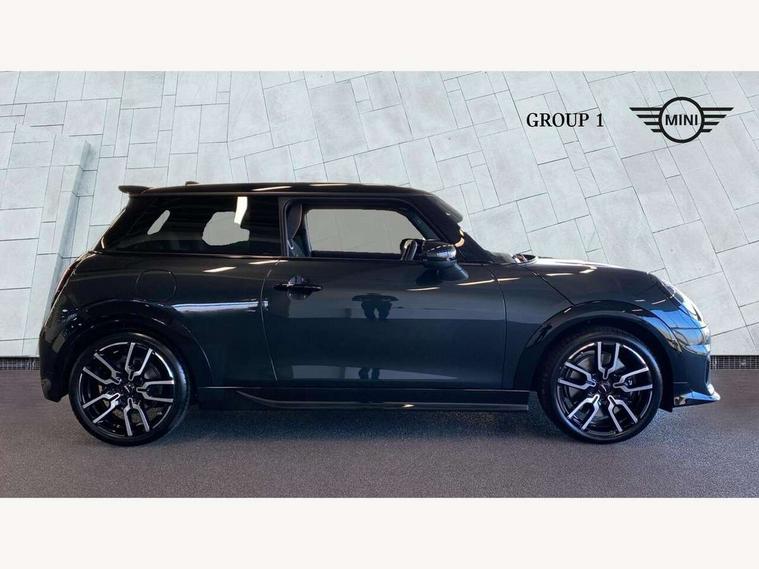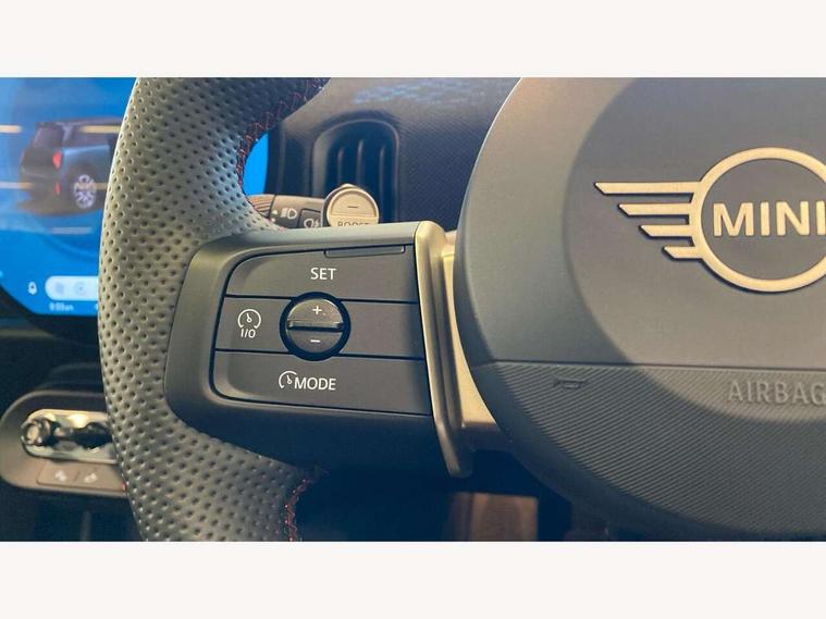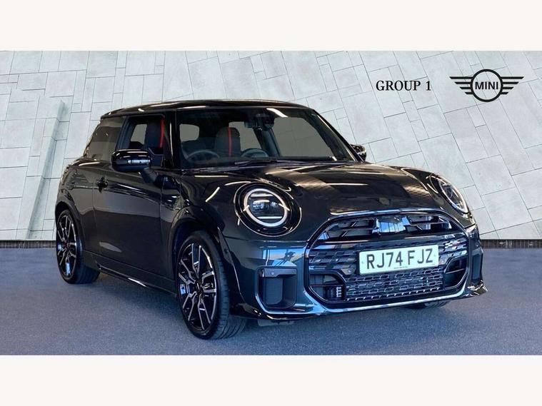 Central toggle bar, Circular OLED Screen, Compatible mobile phone bluetooth with audio streaming, Cruise control, Digital instrument cluster, Electro-mechanical speed dependant steering assistance, Emergency call service, MINI Experience Modes, Mini navigation system, On board computer, Service interval indicator, 7 speed steptronic sport transmission with double clutch, Adaptive suspension, DAB Digital radio, Personal eSim, Auto headlights, Electric adjustable heated door mirrors, Electric front windows, Front and rear apron, Heated rear window, Heated windscreen washer jets, High gloss black wheel arches, High gloss hexagonal patterned grille surround, JCW body kit, LED daytime running lights, LED Headlights, LED indicator lights, LED rear lights, Rain sensor window wipers, Rear fog lights, Rear roof spoiler with airblades, Rear window wiper, 2 seat bench in second row, 2 zone automatic air conditioning, 60/40 rear seat bench, Ambient lighting, Black lower band in high gloss, Cupholders, Dark headliner, Floor mats, Front and rear head restraints, Front compact armrest, Heated steering wheel, Height adjustable passenger seat, Lidded storage box in Black/Red knit, Luggage compartment lighting, Partially perforated vescin steering wheel with red accent, black/red decorative strap, Single front passenger seat, Steering wheel paddle shift, Sunvisors with vanity mirrors, Vescin/Cord upholstery, Driving assistant pack - Cooper Hatchback, Park assistant pack - Cooper Hatchback, 3 point seatbelts on all four seats, 6 Airbags - front, side, head and seat belt tensioners, Acoustic pedestrian protection, Anti-lock braking system (ABS), Brake caliper in Black with JCW badge, DSC - Dynamic Stability Control, Electronic parking brake, Front and rear disc brakes, Front ISOFIX (iSize), Front passenger airbag deactivation, JCW Sport Brakes, Traction control, Tyre pressure monitoring system, Alarm, Immobiliser, Remote central locking, Black/Red decorative dash strap, JCW Black/Red dashboard knit, Tyre repair kit,