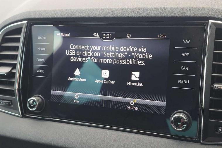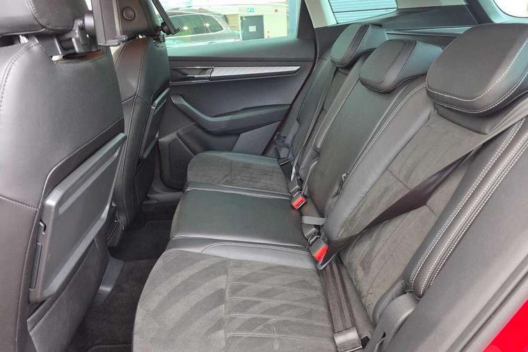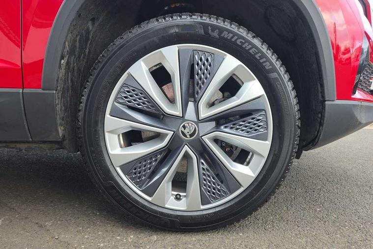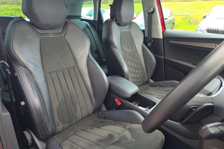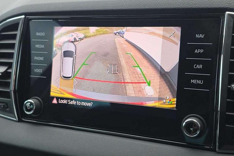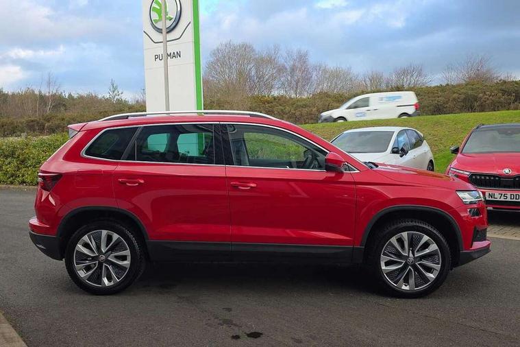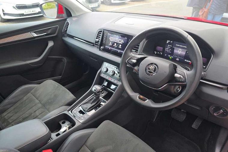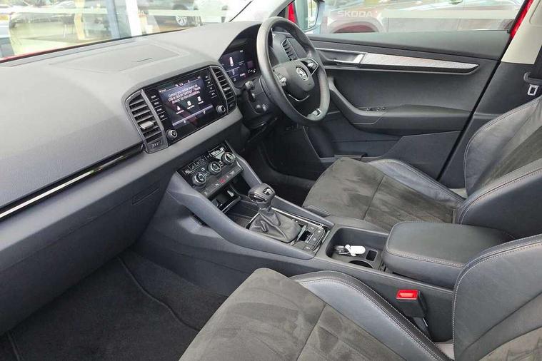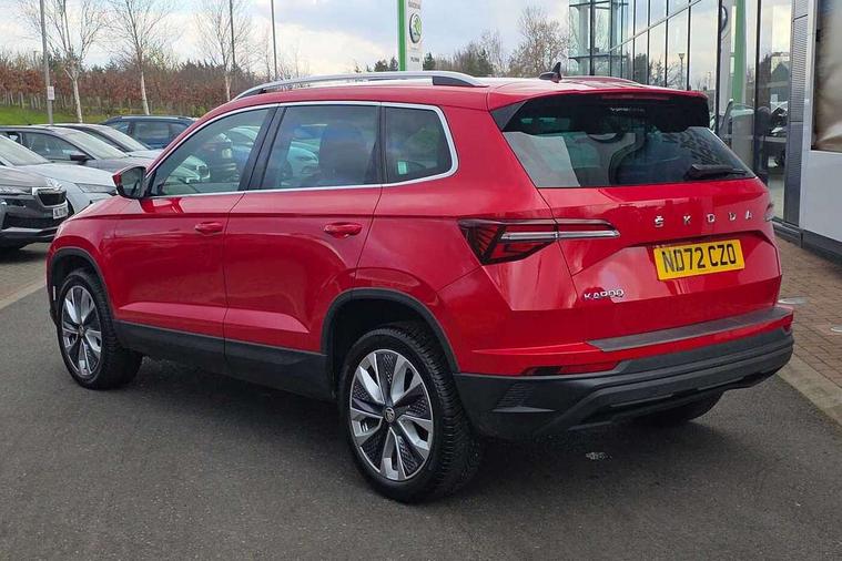 8" Digital display, Care connect, Driver fatigue sensor, Emergency services call system, Outside temperature gauge, Service interval indicator, SmartLink wireless for Apple and wired for Android, Start/stop system with regenerative braking, USB C Port x 2 in front centre console, 8 Speakers, DAB radio with Bluetooth, USB connection, Acoustic glass, Aero front windscreen wipers with intermittent function, Auto dimming rear view mirror with light and rain sensors, Black electric window control buttons, Body colour door mirrors and handles, Dynamic headlight range control with cornering light function, Electric front and rear windows with child proof lock, Heated rear windscreen, LED daytime running lights, LED rear lights with high functionality welcome effect and dynamic indicators, Light assistant (coming/leaving home/tunnel light), Plastic scuff plates, Privacy glass, Rear side wing doors, Rear spoiler, Rear window wiper with washer system and intermittent control, Safety reflectors on front doors, 1.5 litre bottle holders in driver and front passenger door panels, 12V socket in boot, 12v socket in front centre armrest with storage compartment and rear air vents, 2 Folding hooks and nets in boot, 2 spoke leather heated multifunction steering wheel with DSG paddles, 2 x Tablet holder, 3 rear height adjustable headrests, 3 seat bench in 2nd row, 4 foldable roof handles with rear coat hooks, Black floor carpet, Chrome inner door handles, Decorative door sills with KAROQ badging, Double sided boot floor, Foldable hooks in the boot, Front head restraints, Height adjustable front three point seats belts with tensioners, Height/reach adjust steering wheel, Ice scraper, Illuminated glovebox, Illuminated luggage compartment, Isofix child seat preparation for front passenger seat, Isofix child seat preparation outer rear, Manual lumbar support for front seats, Pen holder, Pollen filter, Rear boot cover, Rear reading lights, Rubbish bin door, Safety vest holder, Single front passenger seat, Storage box in upper central dashboard closed, Sunvisors with illuminated vanity mirrors, Textile floor mats, Ticket holder, VarioFlex seats with standard rear seat release, Chrome roof rails + chrome pack - Karoq, Parking pack - Karoq, Automatic door unlocking in case of crash, Automatic fuel cut off in case of crash, Child locks on rear doors, Driver airbag, Electronic parking brake with auto hold function, Emergency rear braking signal, ESC including ABS, MSR, ASR, EDS, HBA, DSR, RBS, MKB and traction control, Front side airbags, Hill hold control, Knee airbags, Passenger airbag with switch-off function, Pedestrian monitor, Seatbelt reminder signalisation and pretensioner for all seats, Three point seatbelts rear, Two tone horn, Tyre pressure display, Tyre pressure monitor, Alarm with interior monitoring, back up horn and tilt sensor with safe function, Electronic engine immobiliser, Keyless entry and start/stop, Remote central locking with 2 remote folding keys, Chrome framed air vents, Anti-theft wheel bolts protection, Storage on wheel cover, Tool kit,