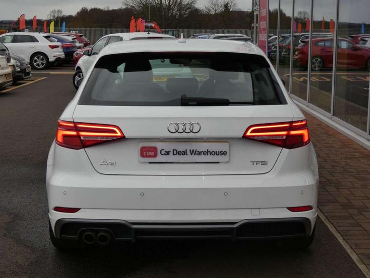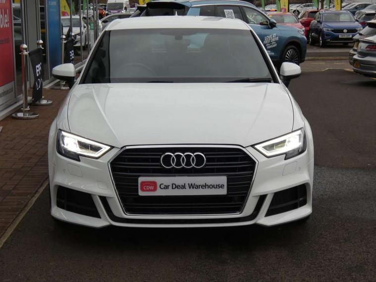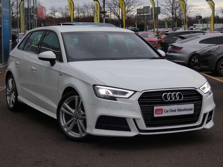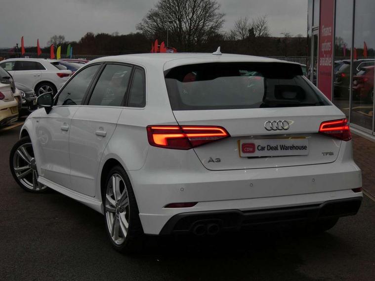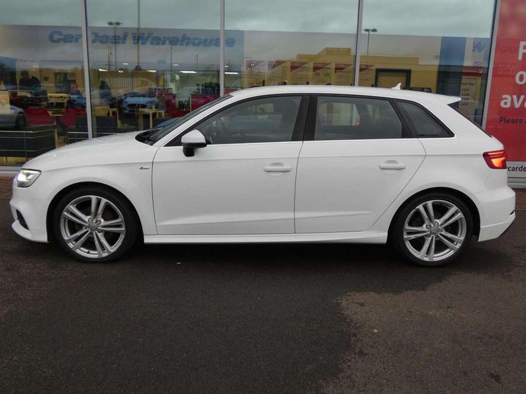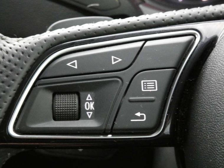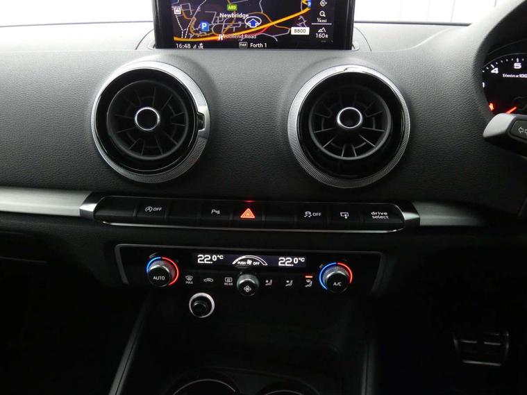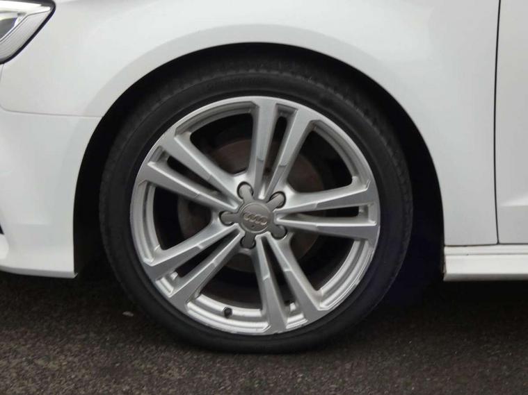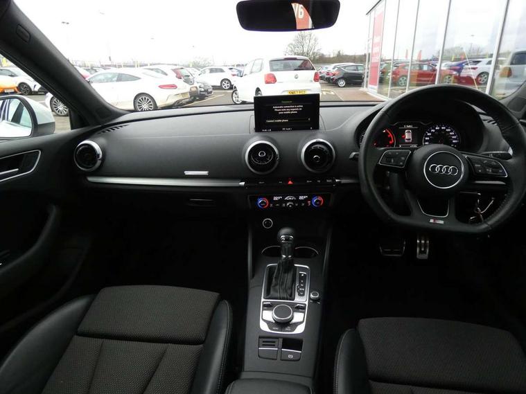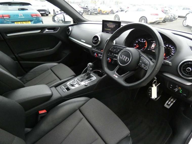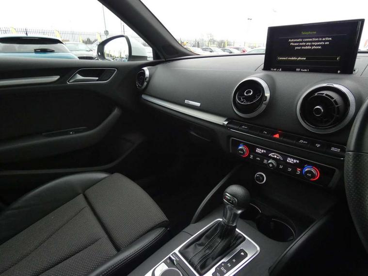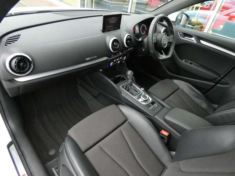 Audi connect, Audi drive select, Audi smartphone interface, Colour driver's information system display, Mobile telephone preparation - bluetooth interface, Service interval indicator, Speed limit display, Voice control system, 2 USB ports, Audi music interface, Auxiliary input socket, DAB Digital radio, Aluminium window trim, Body colour bumpers, Body colour door mirrors with integral indicators, Body colour roof spoiler, Chrome exhaust tailpipes, Electric front windows, Electric operated/heated door mirrors, Electric rear windows, Heated windscreen washer jets, LED daytime running lights, Matt black radiator grille, Rear wiper, S Line body styling, Sport specific side air inlet grille and diffuser insert, 3 adjustable rear headrests, 3 spoke flat bottomed multi-function leather steering wheel, 4 lashing points to secure luggage, Adjustable front armrest, Black cloth headlining, Dual zone electronic climate control, Front and rear interior lights with delay, Front passenger seat isofix location point, Front/rear floor mats, Height/depth adjustable steering column, Illuminated door sills, Illuminated glovebox, ISOFIX child seat preparation+airbag deactivation, Jack and tool kit, Stainless steel pedals, Steering wheel gearshift paddles, Storage compartment in centre console, Storage compartment under front seats, Storage compartments in doors, LED interior light pack - A3/RS3, Light and rain sensor pack - A3 Hatchback/Sportback, Storage and luggage pack - A3/RS3, 3 point seatbelts on all seats, ABS/EBD, Active bonnet, Active front headrests, ASR, Curtain airbags, Driver and passenger side airbags, Driver/Front Passenger airbags, Drivers knee airbag, EDL, Electromechanical parking brake, ESC - Electronic Stability Control + traction control, Front passenger airbag deactivation, Manual rear child locks, Multi-Collision braking, Seatbelt warning, Tyre pressure monitor, Warning triangle and first aid kit, Anti theft alarm, Anti-theft wheel bolts, Remote control central locking, Thatcham category 1 alarm + immobiliser, Aluminium air vent surrounds, Aluminium trim elements, Space saver spare wheel,